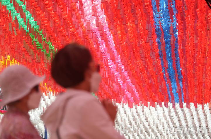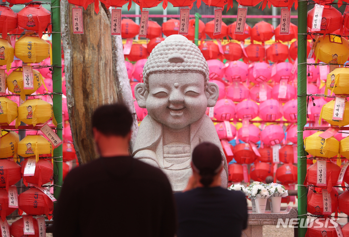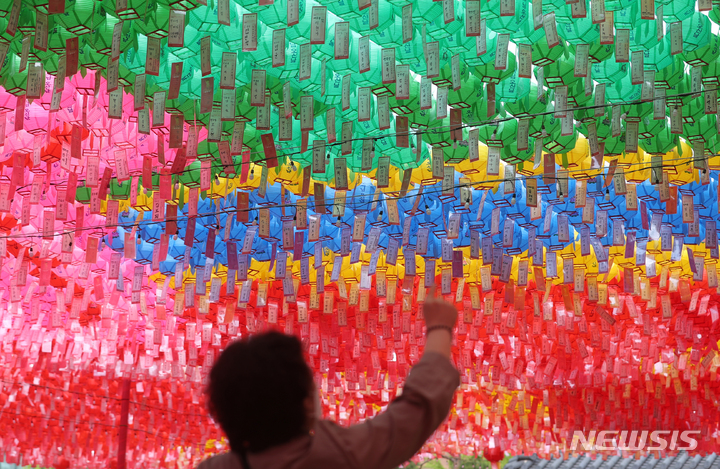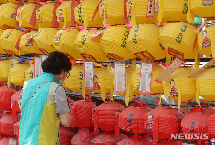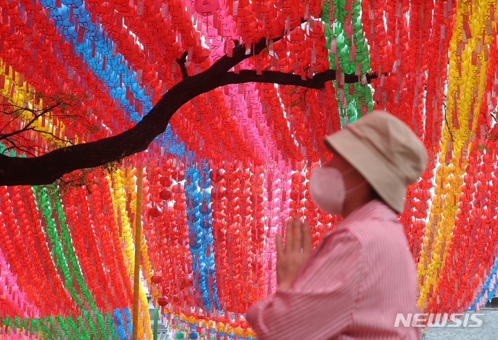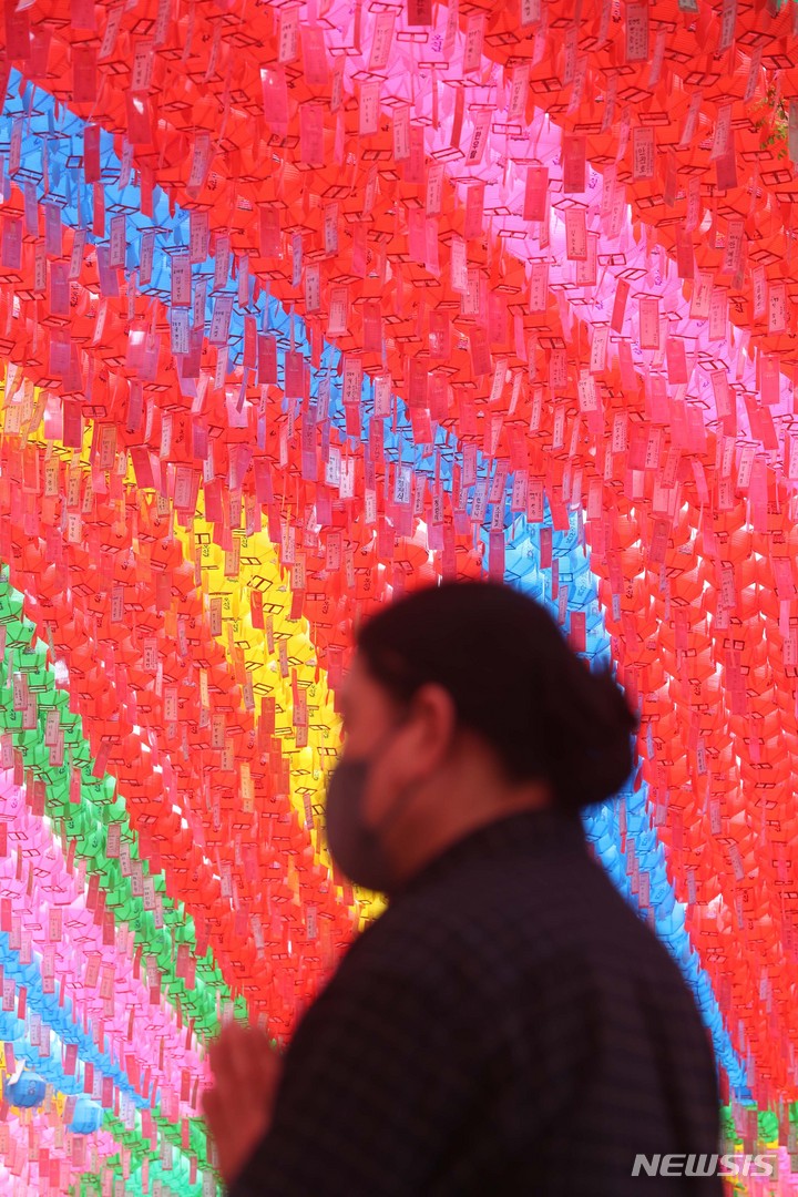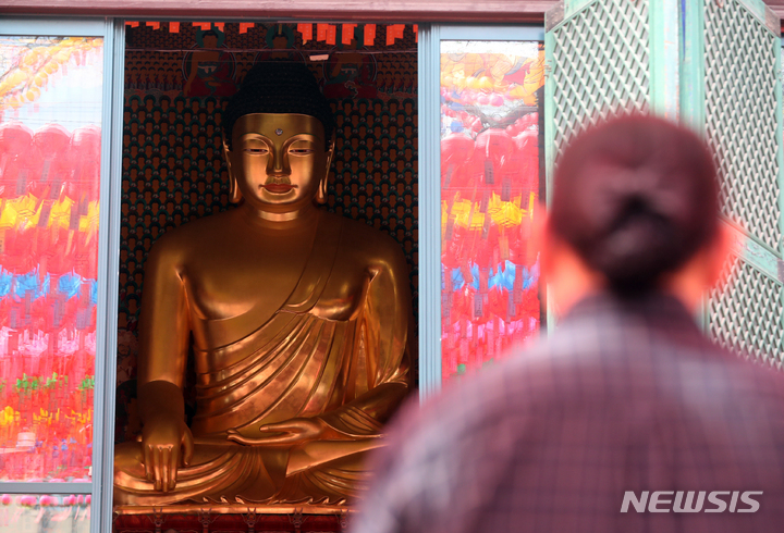 仏紀2566年の釈迦誕生日まであと二日と迫った6日、ソウルの曹渓寺では信徒が祈りをささげている。