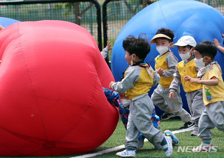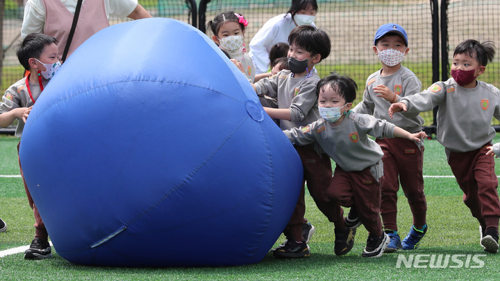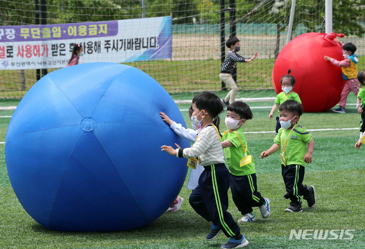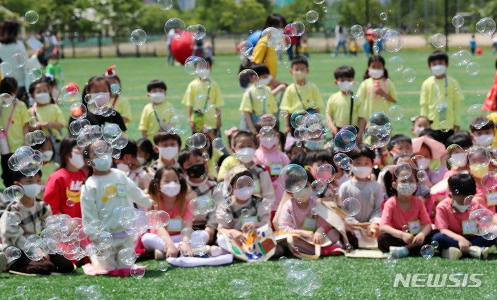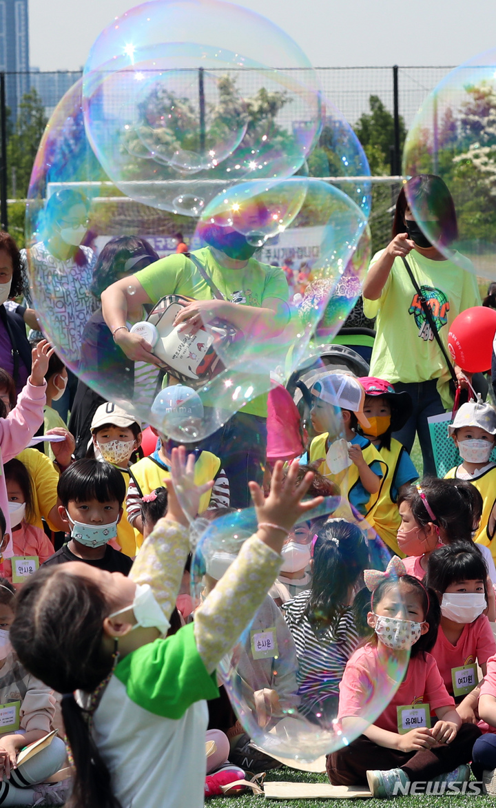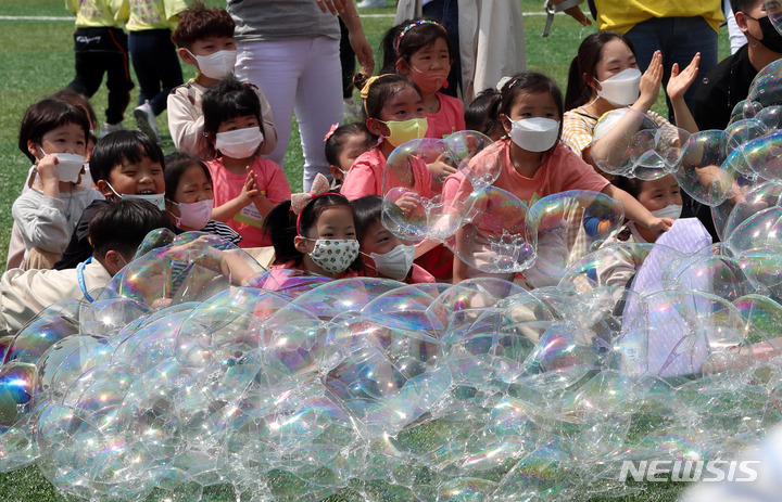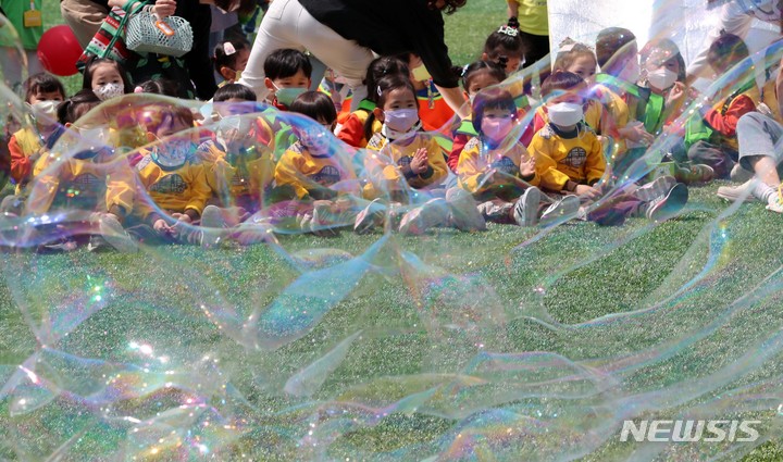 「騒々しいドリームマーケット! 幸せ分かち合い広場」が開催された11日午前、釜山市北区の華明生態公園サッカーグラウンドで、地元のオリニチプ(民間保育施設)の園児らがバブルショーを鑑賞しているところ。北区オリニチプ連合会主催のこの日のイベントでは「遊び広場」「分かち合い広場」「体験広場」などさまざまなプログラムが進められた。