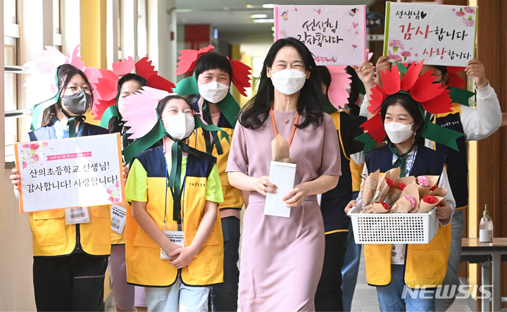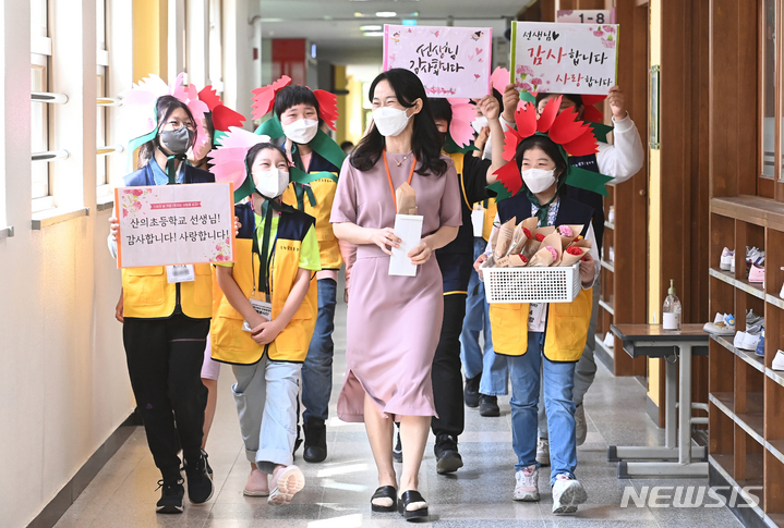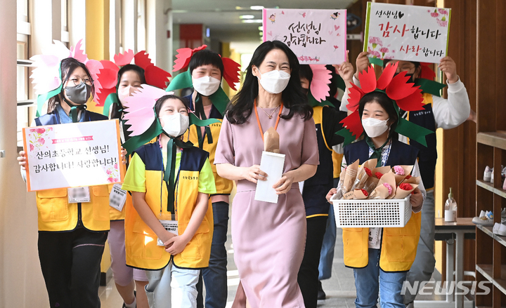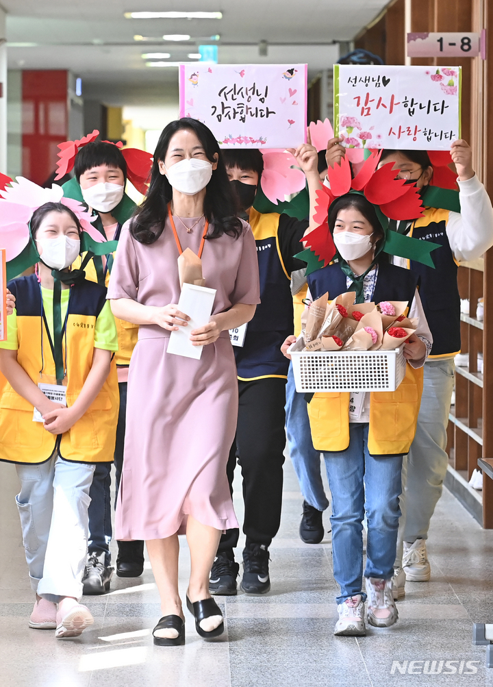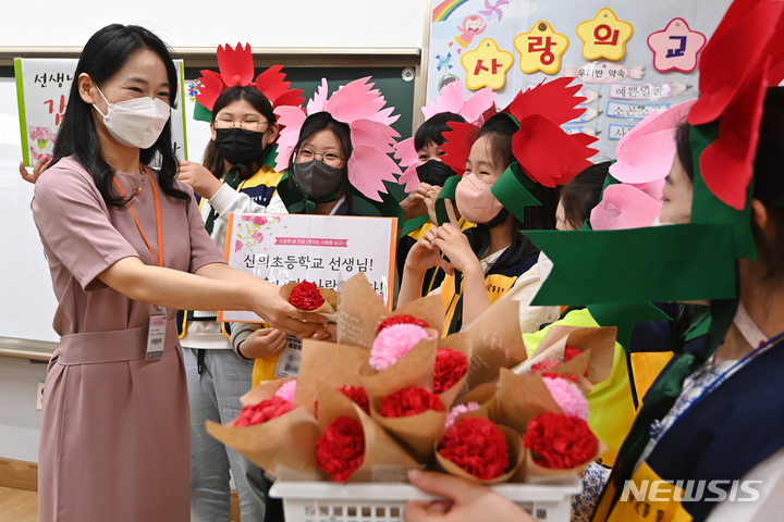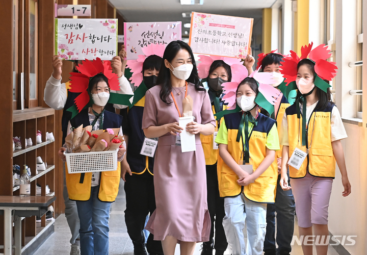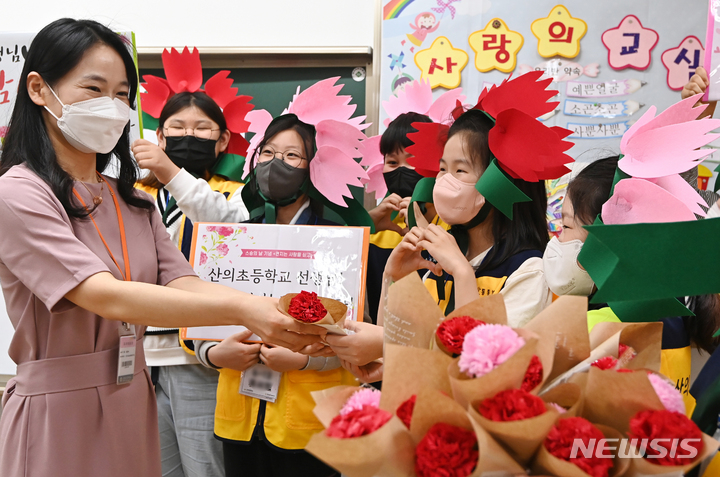 先生の日(5月15日)を三日後に控えた12日午後、京畿道水原市霊通区のサニ小学校では、児童代表らが先生に手づくりのカーネーションと感謝の手紙を手渡し、明るい笑顔を浮かべながら廊下を歩いていた。