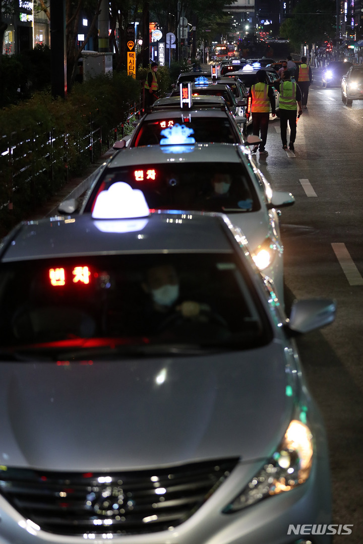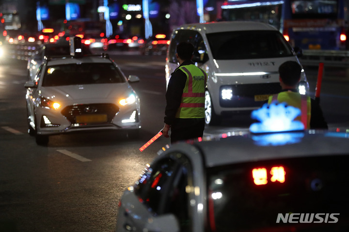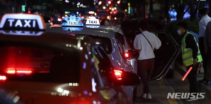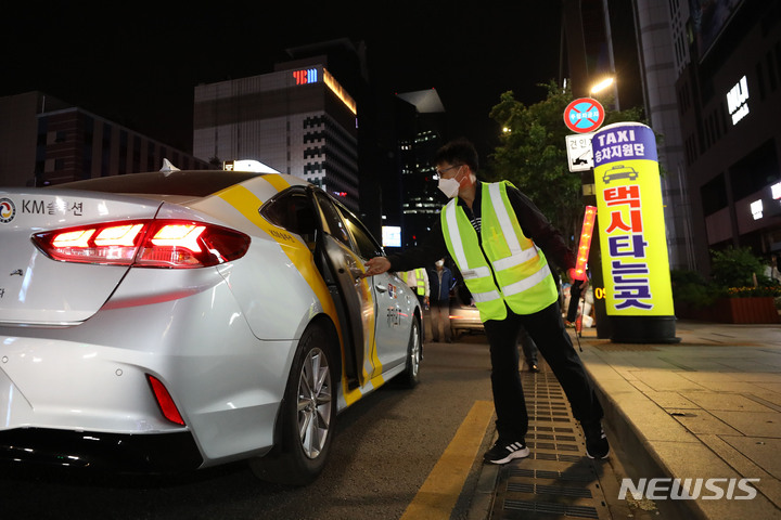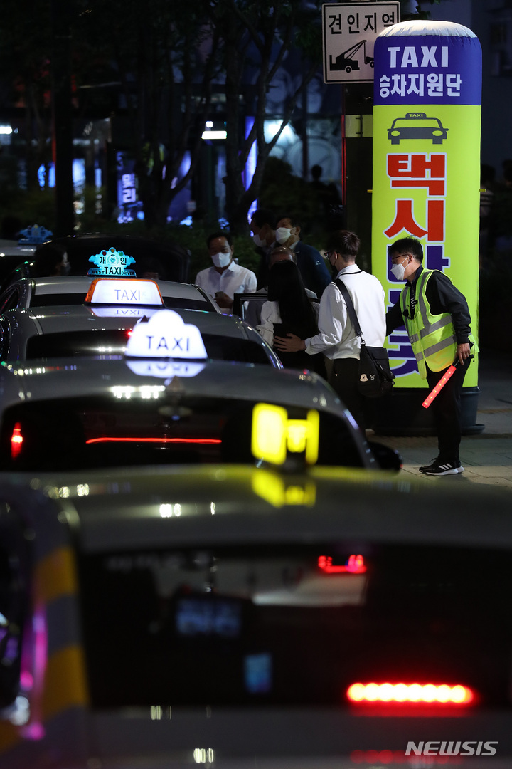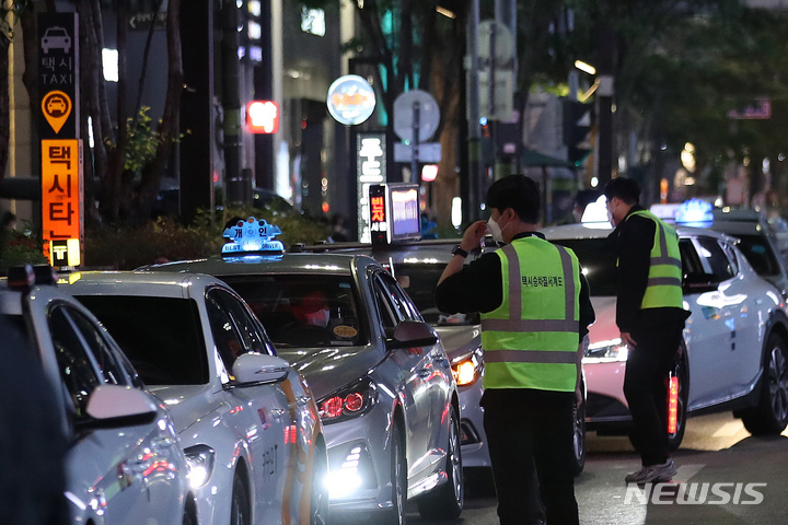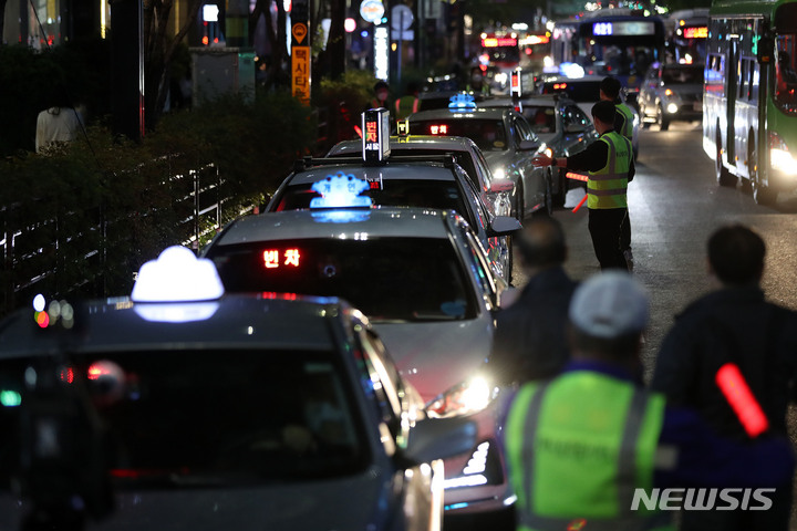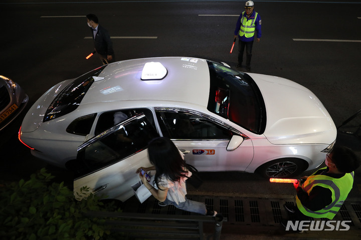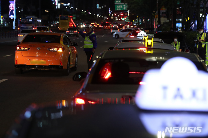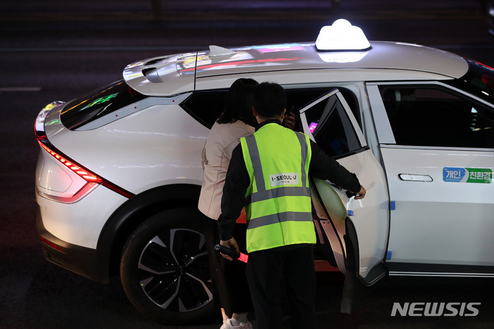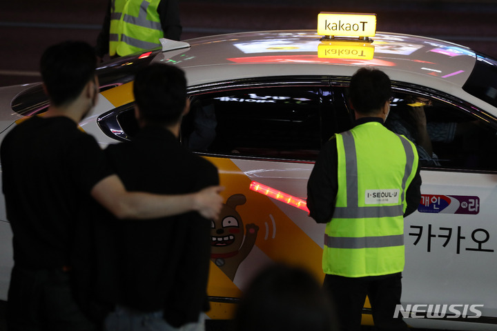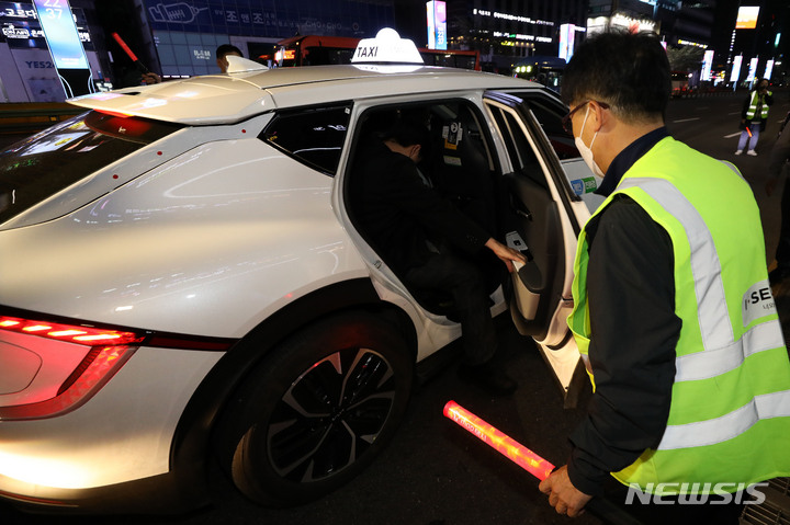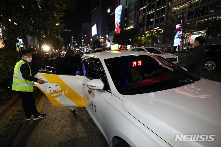 ソウル市瑞草区内にある江南駅前の臨時乗車隊で12日、乗車支援団が用意したタクシーが客を乗せるために待機している。ソウル市は、深夜の乗車難解消のための「タクシー臨時乗車隊(乗車支援団)」をこの日から4週間にわたり、毎週木曜日と金曜日に運営すると発表した。