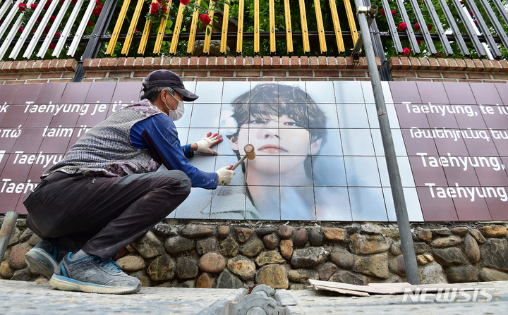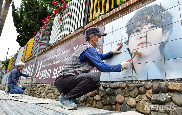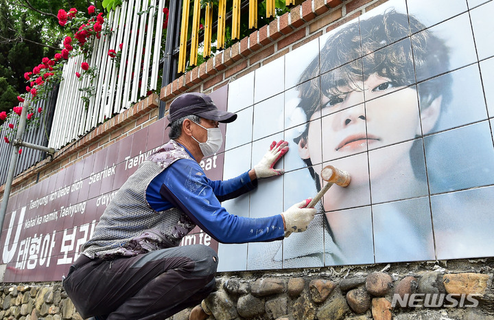 13日午前、防弾少年団(BTS)のメンバー、V(本名キム・テヒョン)の母校である大邱市西区飛山洞のデソン小学校の外壁で、「V壁画通り」延長のためのタイル張り作業が実施された。西区は中国のファンの集いである「Baidu Vbar」と再びタッグを組み、デソン小学校の左側の外壁25メートル区間を追加で造成することにした。
