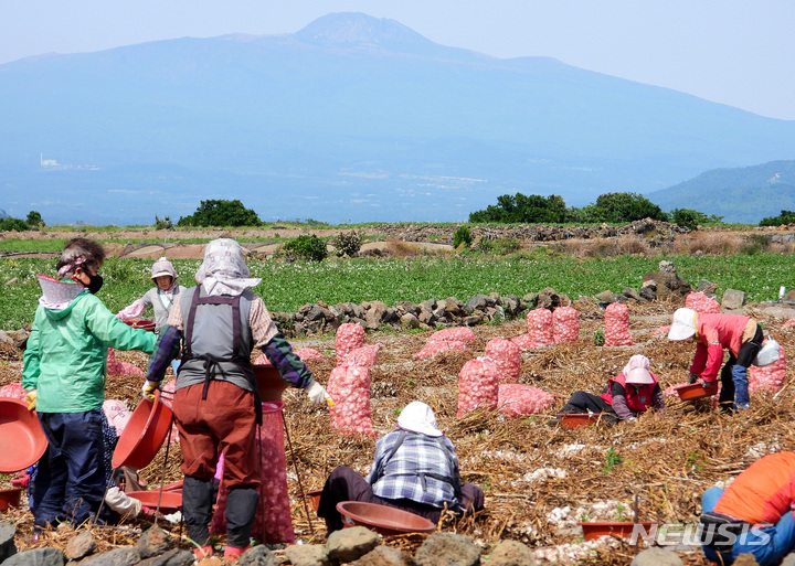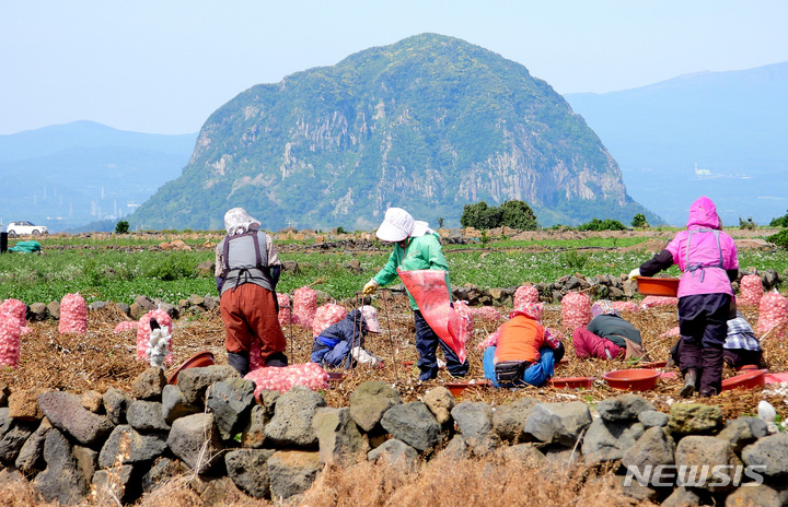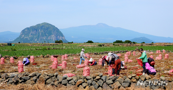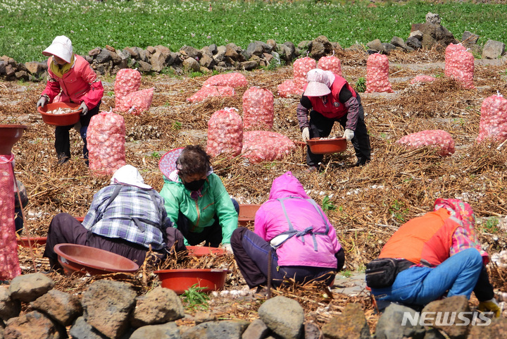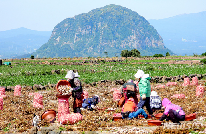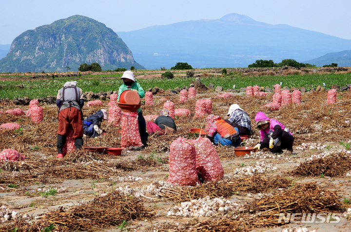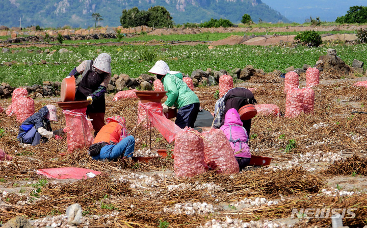 【NEWSIS】いい天気となった15日午後、済州特別自治道西帰浦市内で、ニンニクの収穫に精を出す農家の人々。