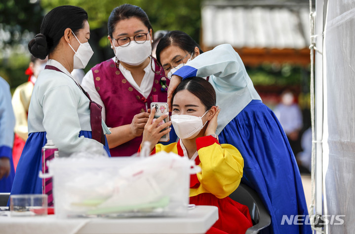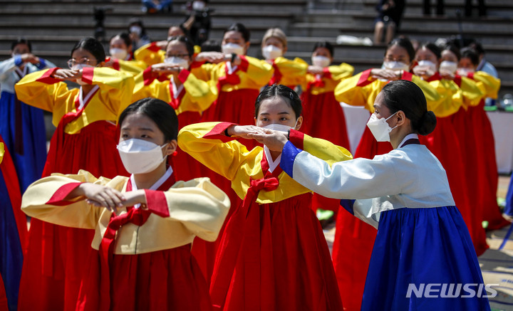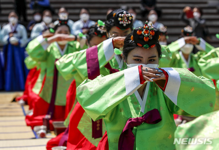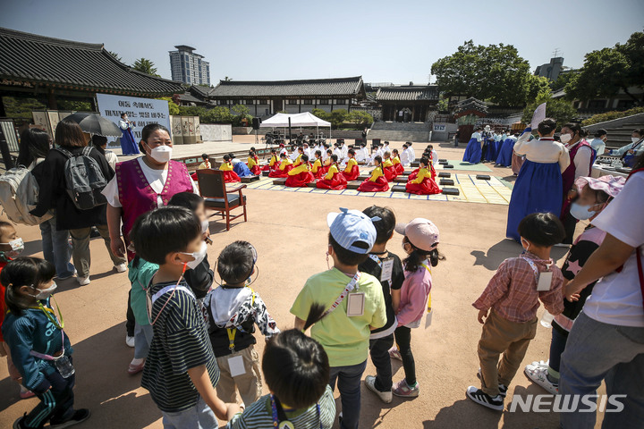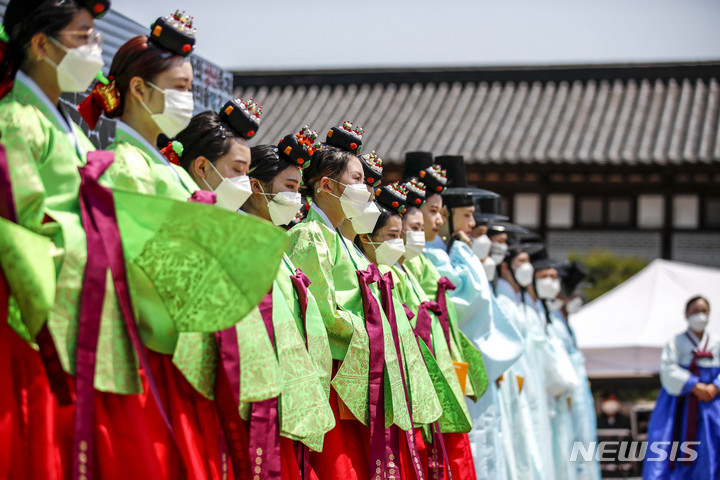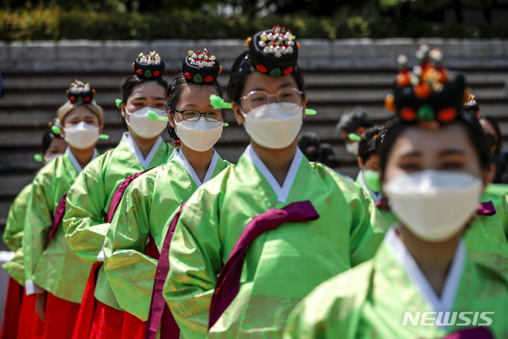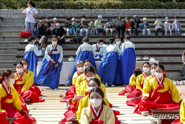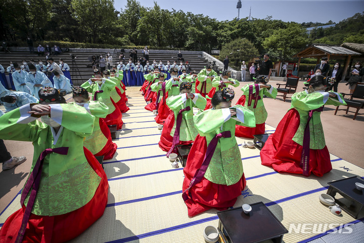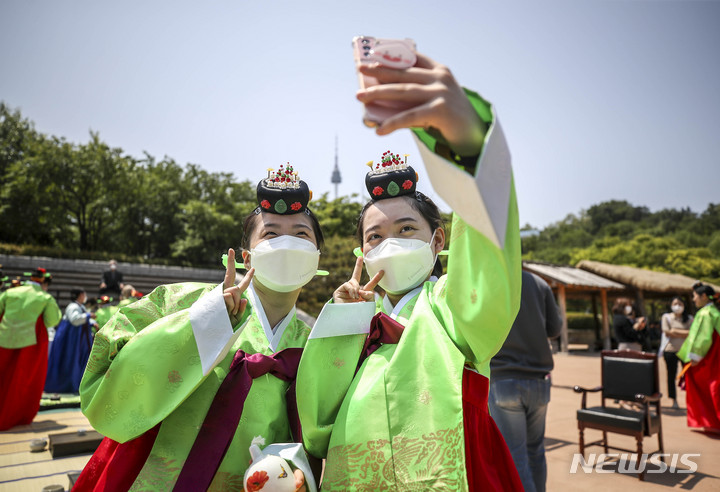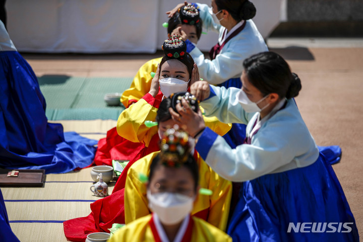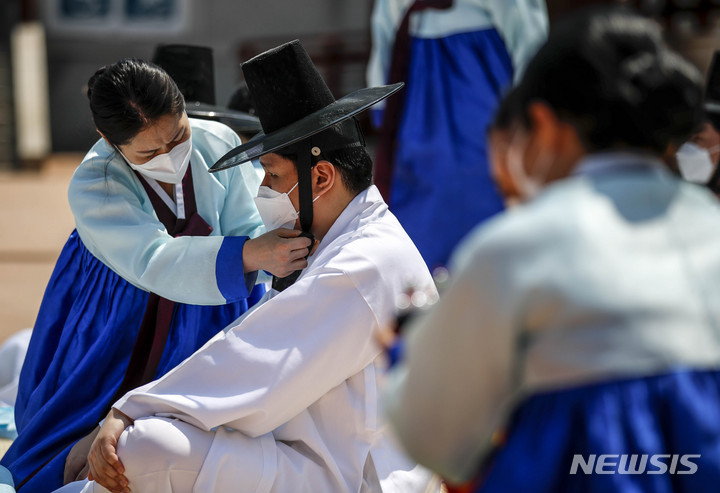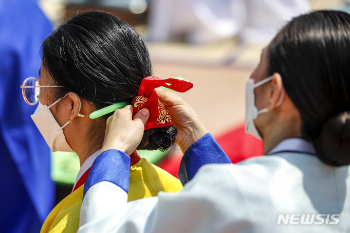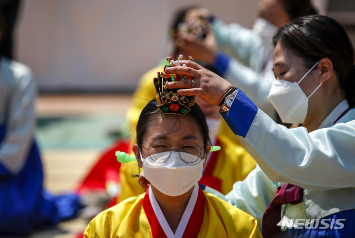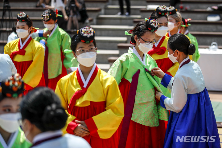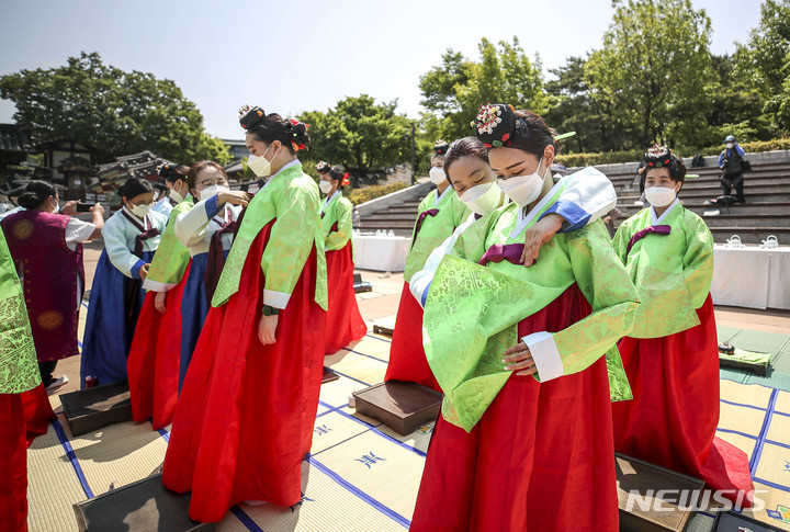 成人の日(毎年5月第3月曜日、今年は5月16日)に当たる16日午後、ソウル市中区の南山韓屋(韓国の伝統家屋)村で開催された第50回成年礼(成人式)再現イベントでは、参加者たちが儀式に臨んだ。