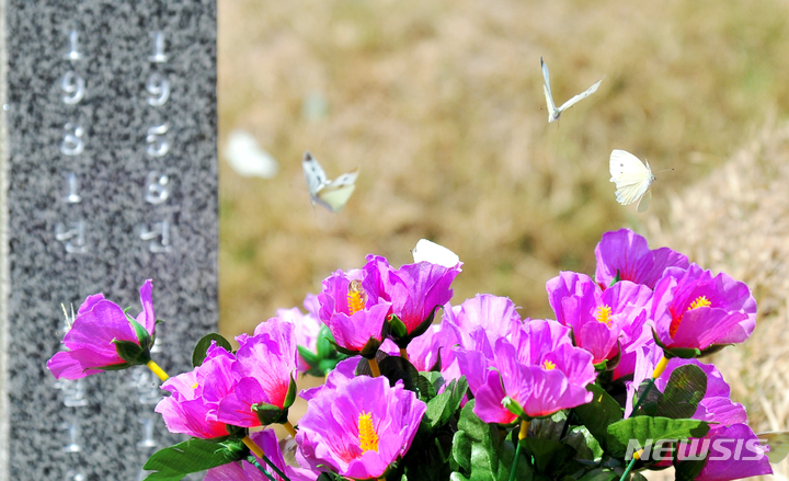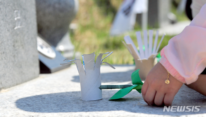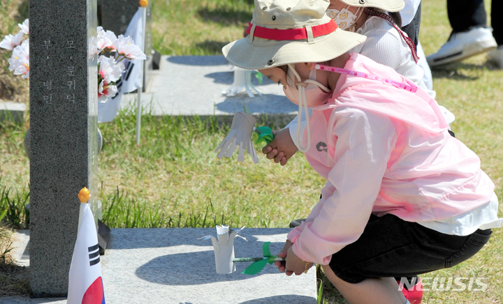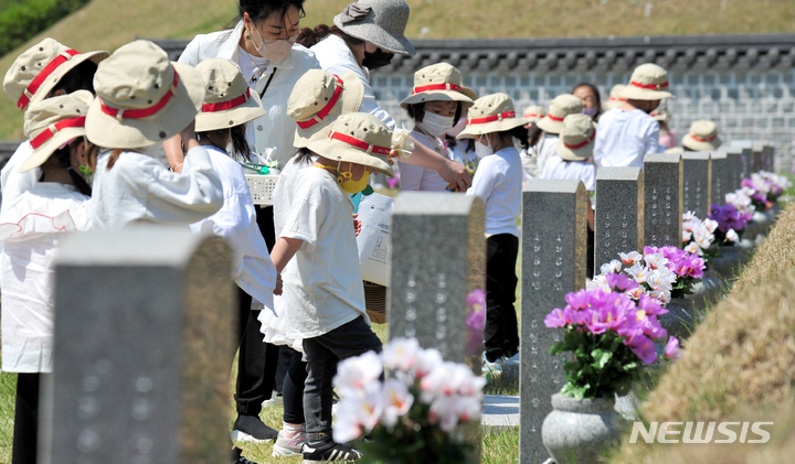 5・18民主化運動(光州事件)42周年を二日後に控えた16日午前、光州市北区雲亭洞の国立5・18民主墓地では、北区陽山洞にあるイニャン幼稚園の園児たちが参拝していた。