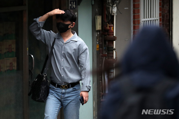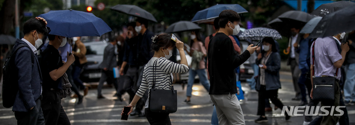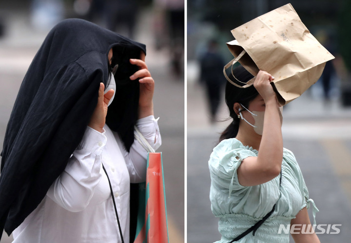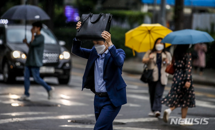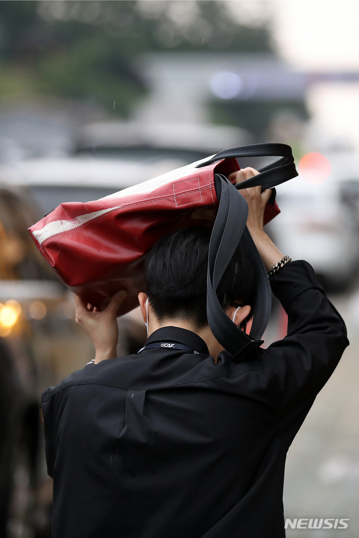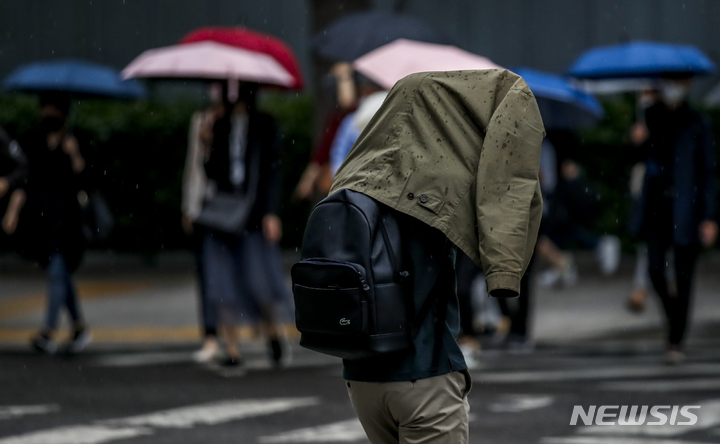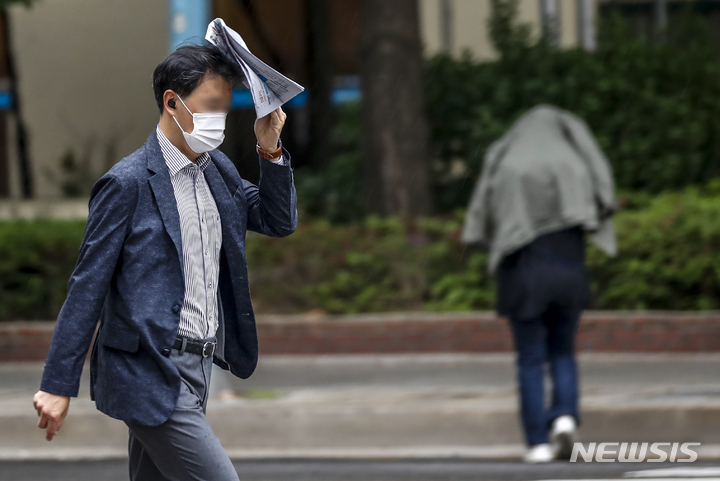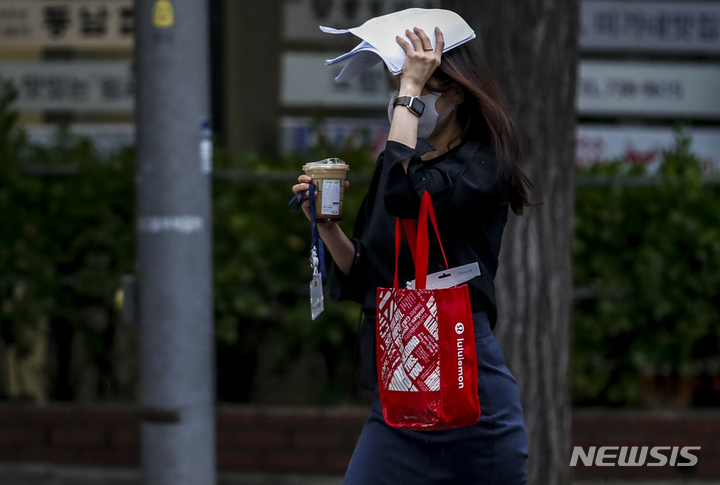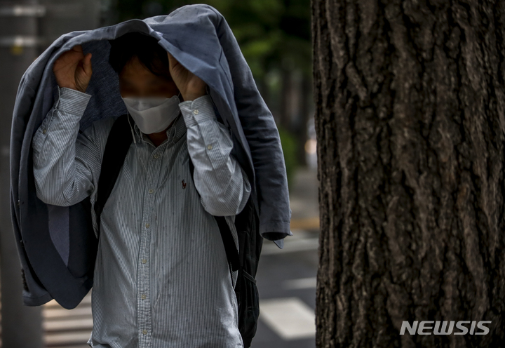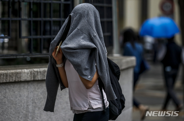 出勤時間帯に雨が降り出した18日午前、ソウル中心部では、傘を持ってこなかった人々がそれぞれの所持品で雨をよけ、足を速めていた。
