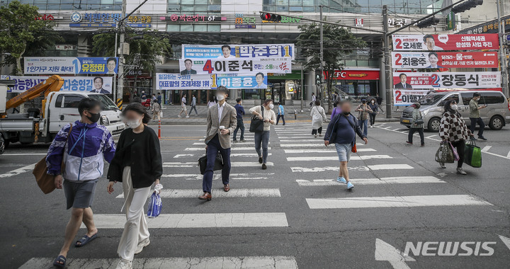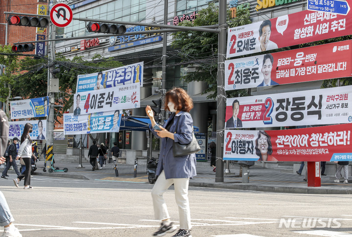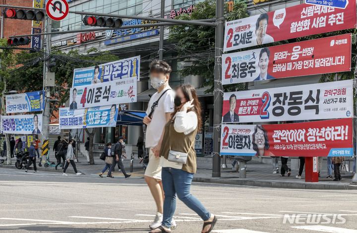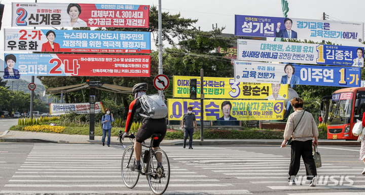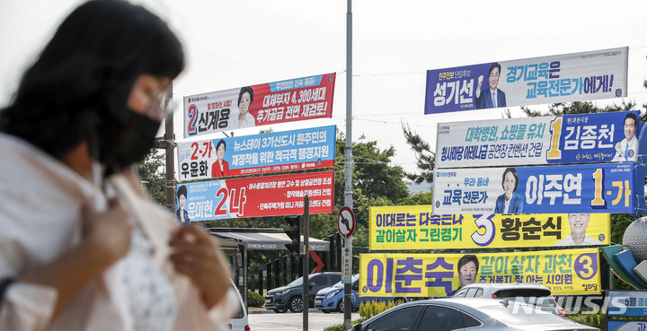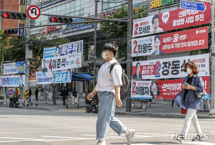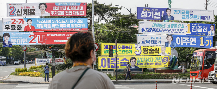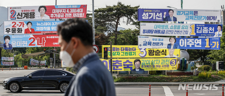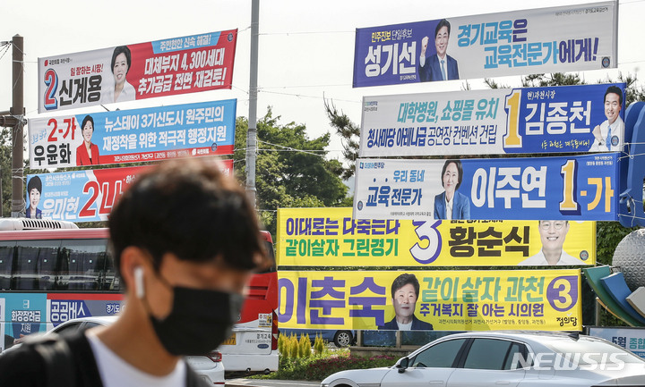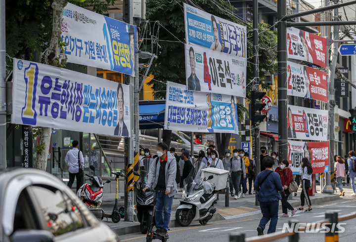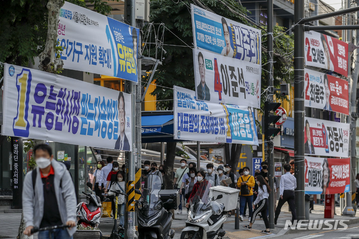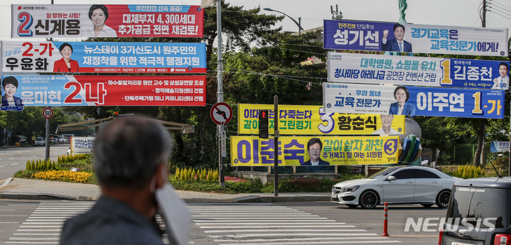 第8回全国同時地方選挙の選挙運動がスタートした19日午前、京畿道果川市のソンバウィ駅近くに候補者たちの横断幕が設置されていた。
