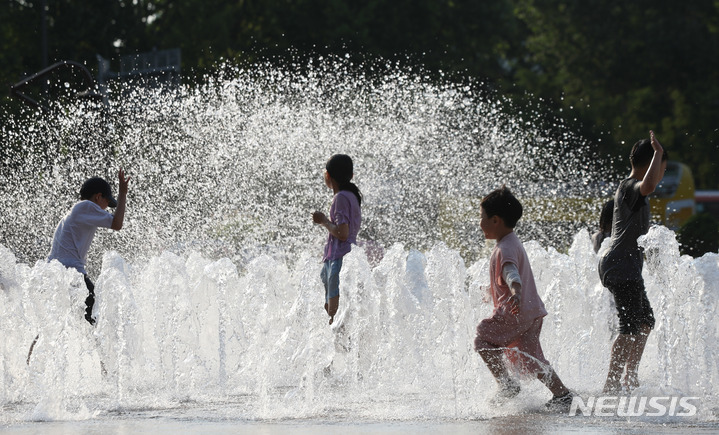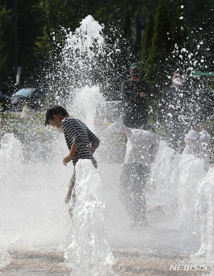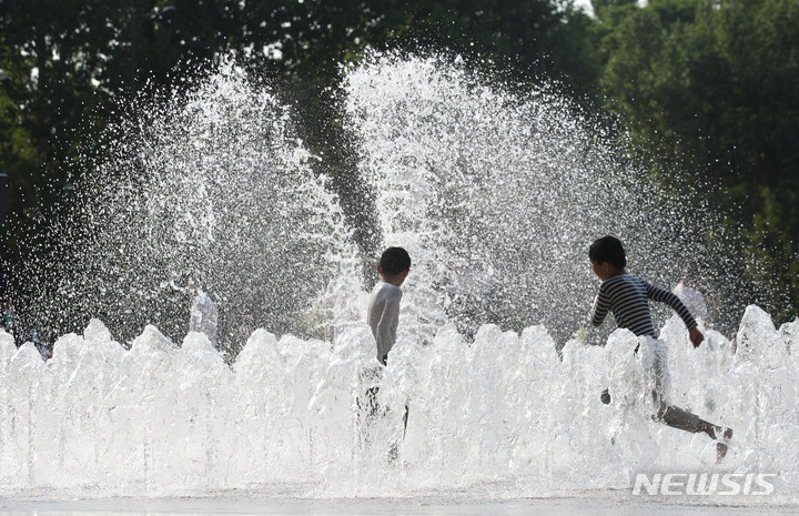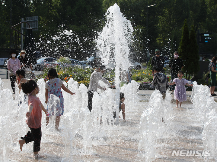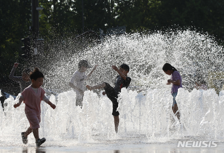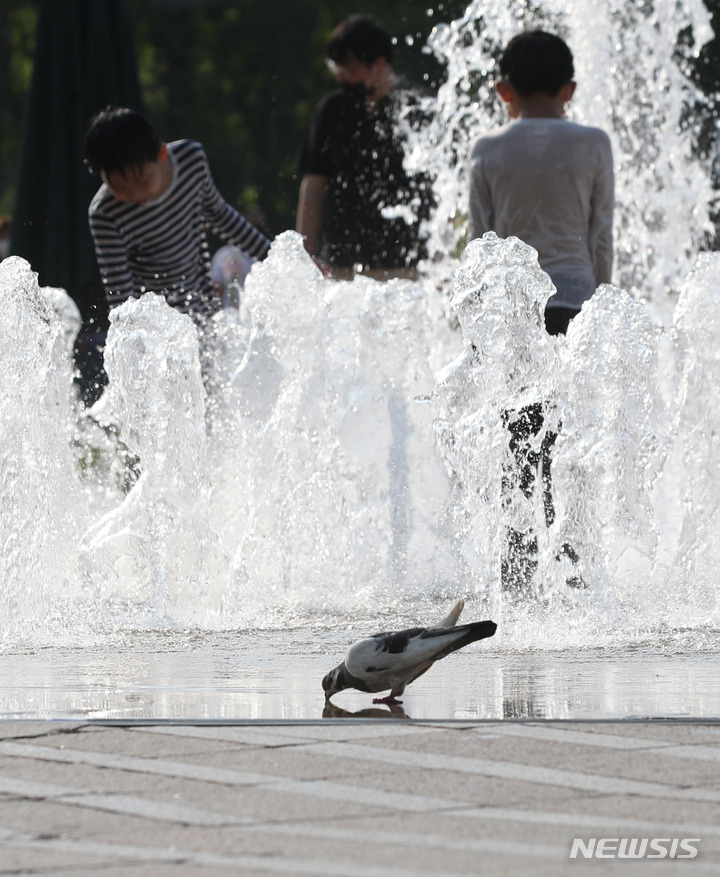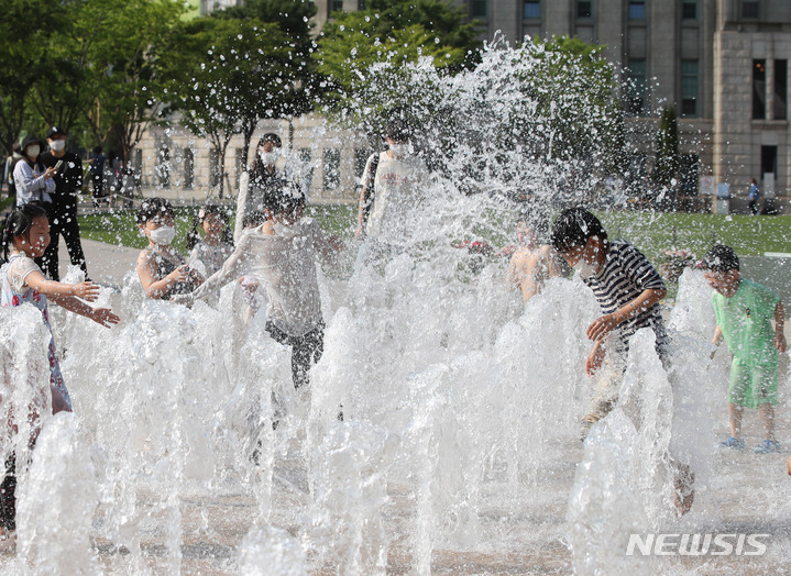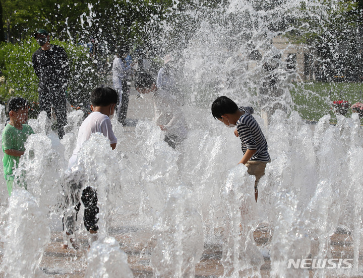 【NEWSIS】ソウルの日中の最高気温が27℃まで上がり、初夏の陽気となった22日午後、ソウル広場の噴水で水遊びをする子どもたち。