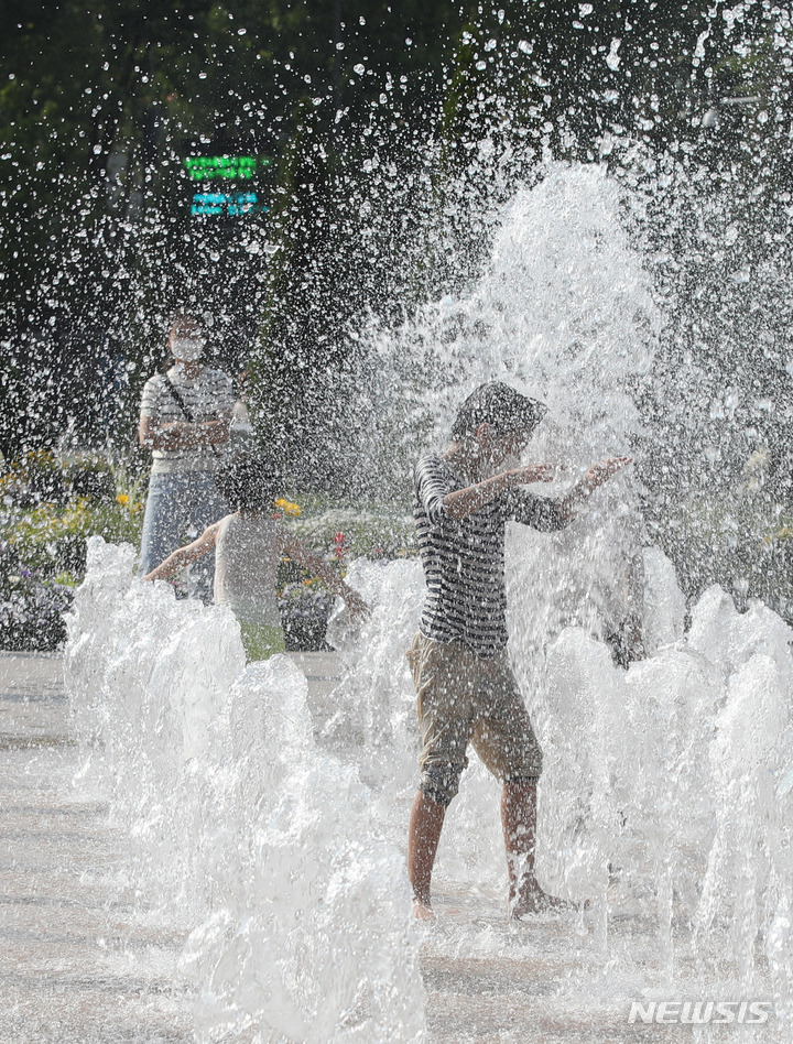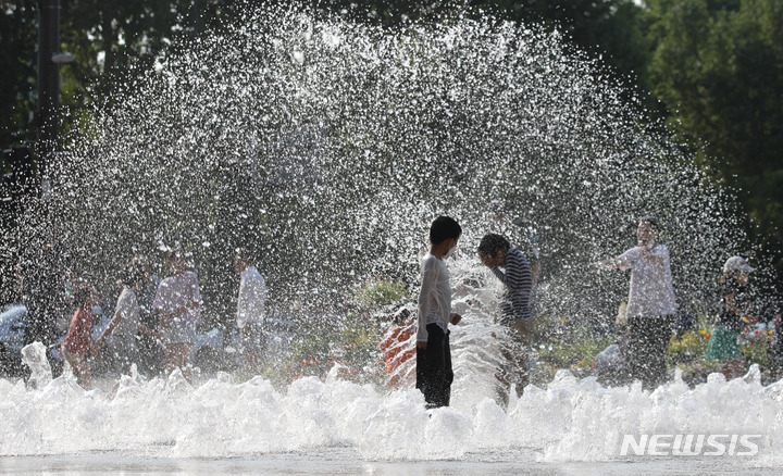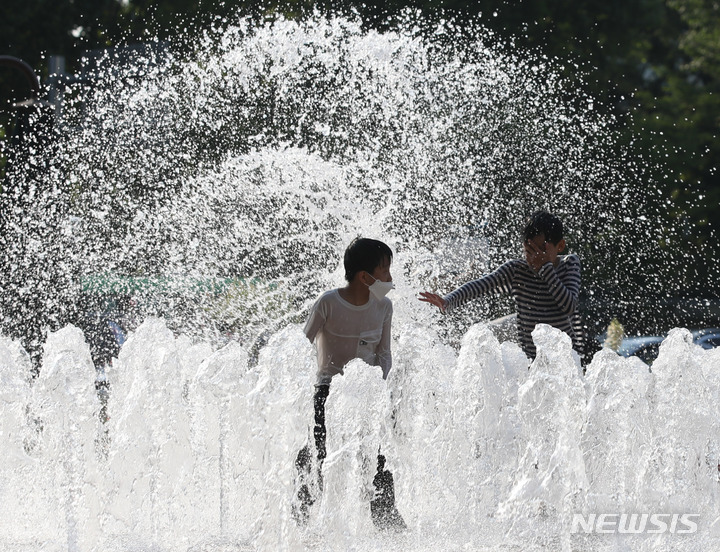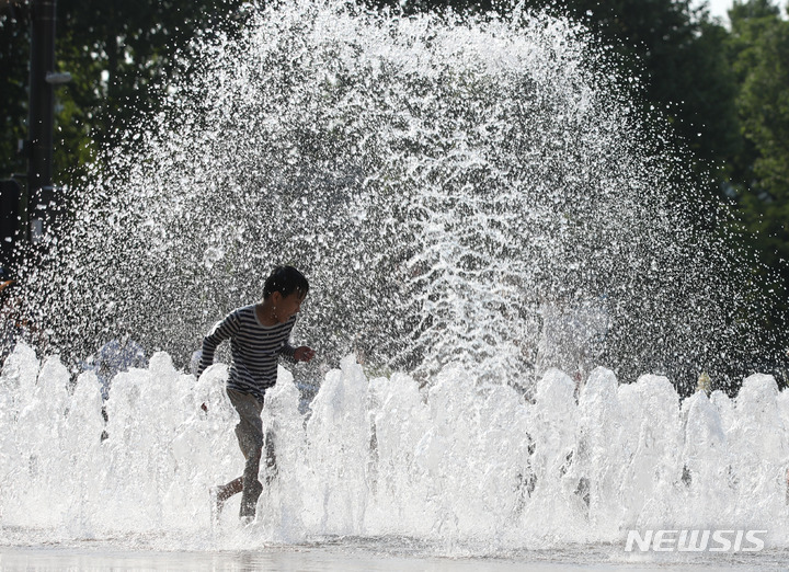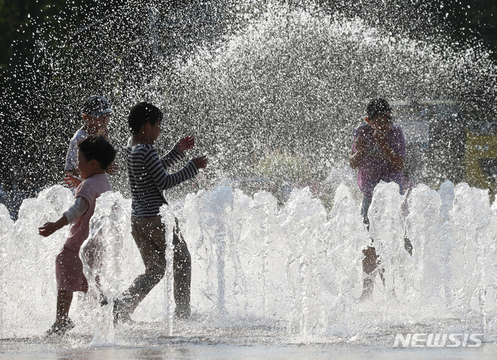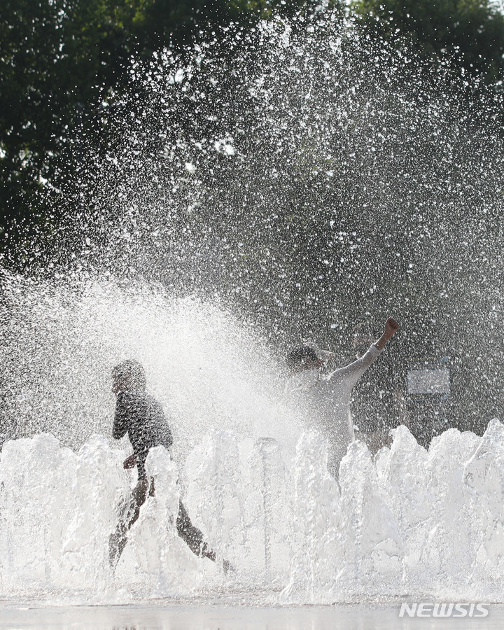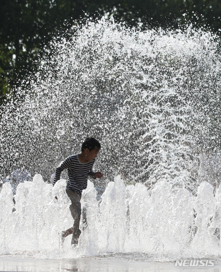 【NEWSIS】ソウルの日中の最高気温が27℃まで上がり、初夏の陽気となった22日午後、ソウル広場の噴水で水遊びをする子どもたち。