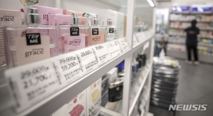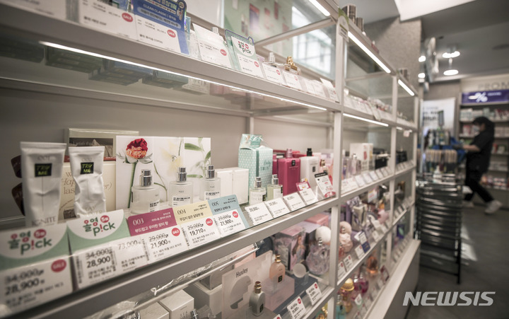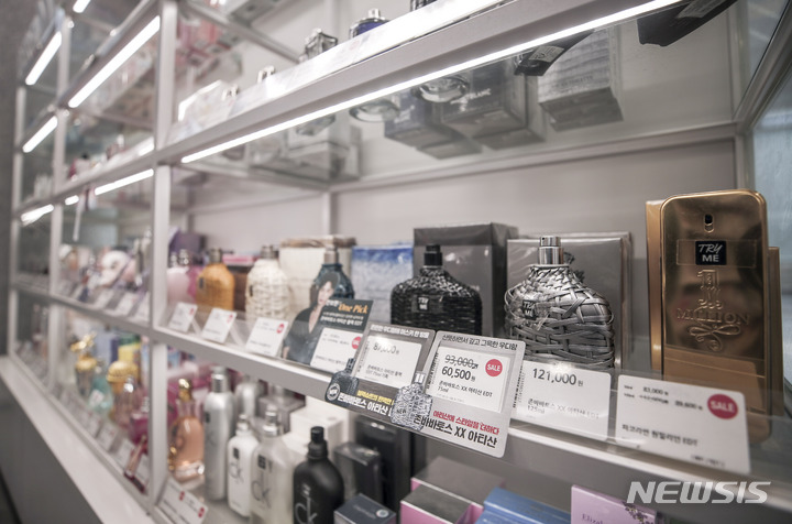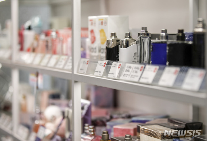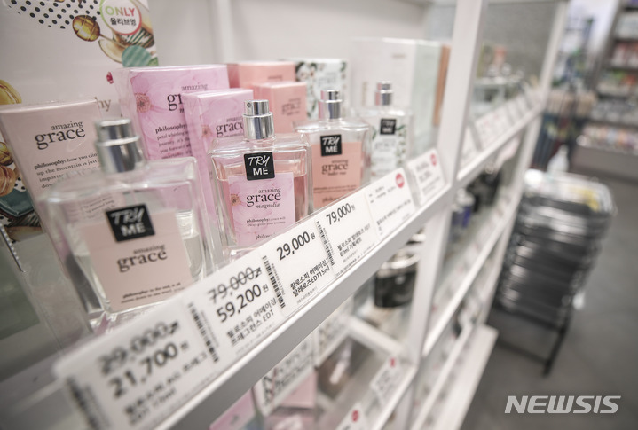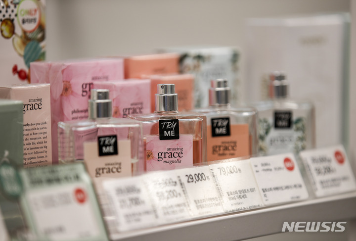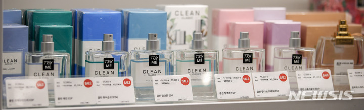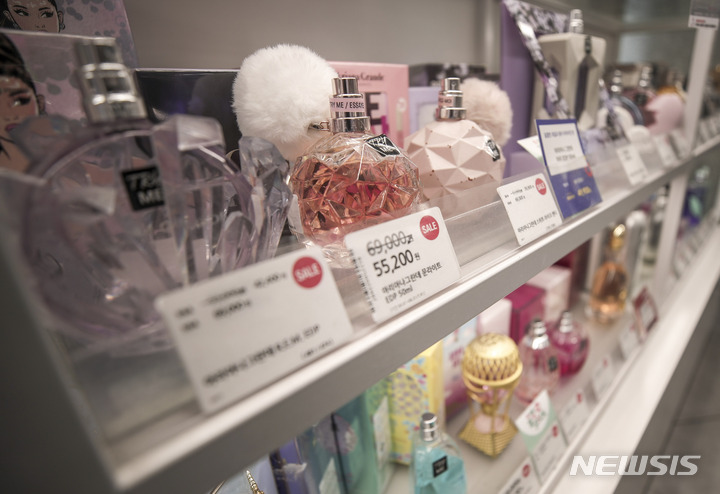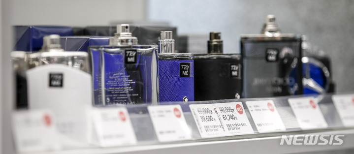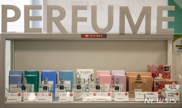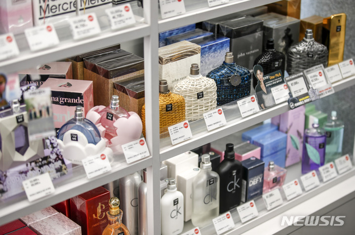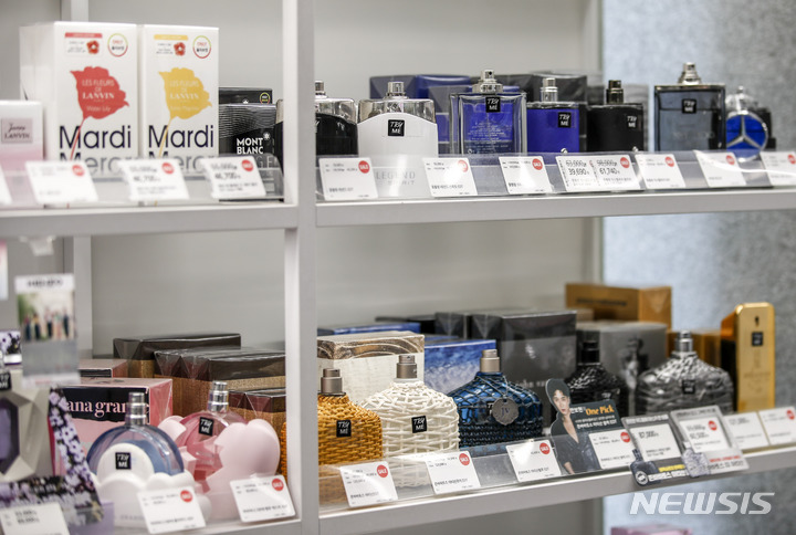 店内で香りを試すことが可能になり、香水業界の売り上げが急激に増えている23日午前、ソウル市内の化粧品セレクトショップに並んでいるさまざまな香水の様子。ロッテ百貨店によると、マスクを外して香りを試すことができるようになった先月25日から今月19日にかけて、香水の売り上げは前年同期に比べ60%以上増加したという。