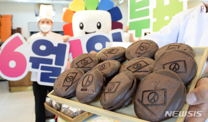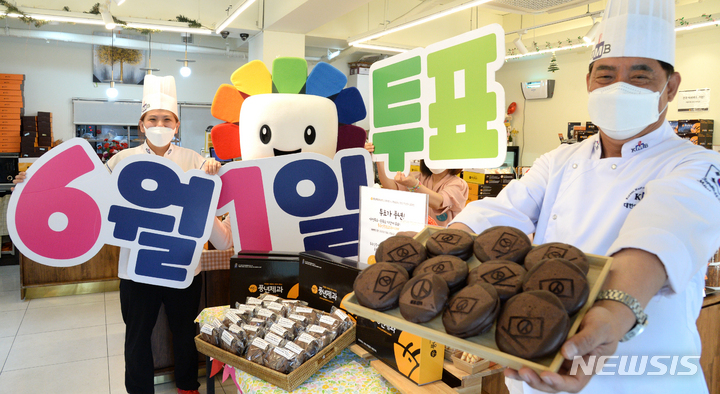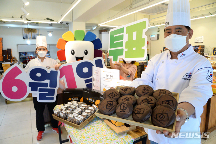 全羅北道選挙管理委員会と全州・豊年製菓本店の関係者たちが24日、全羅北道全州市内にある豊年製菓本店で、第8回全国同時地方選挙の投票を促す「行動する有権者キャンペーン」を実施し、投票チョコパイを披露した。
