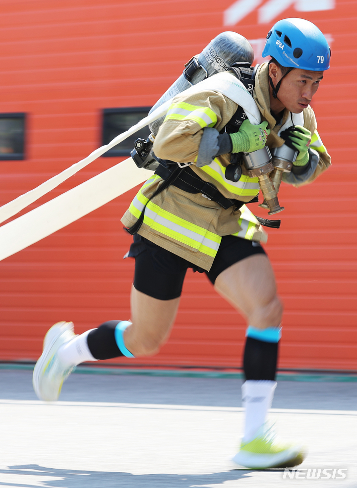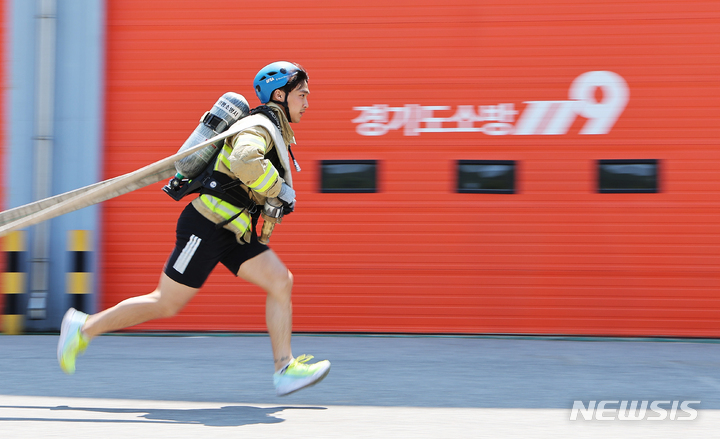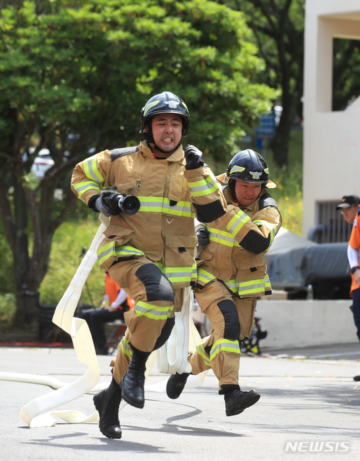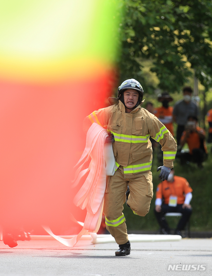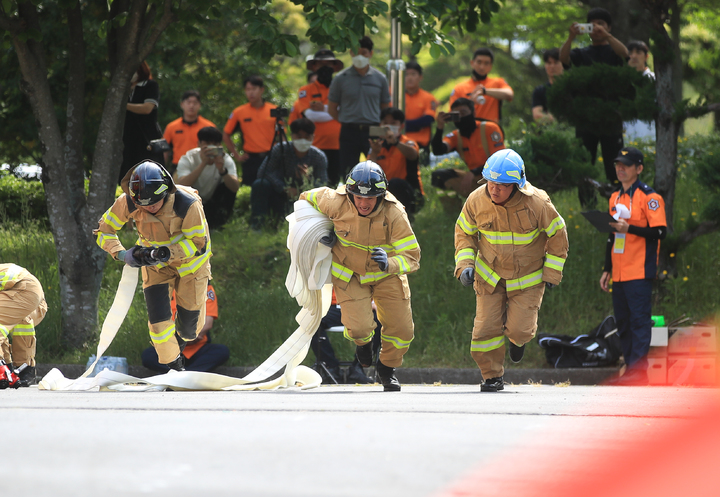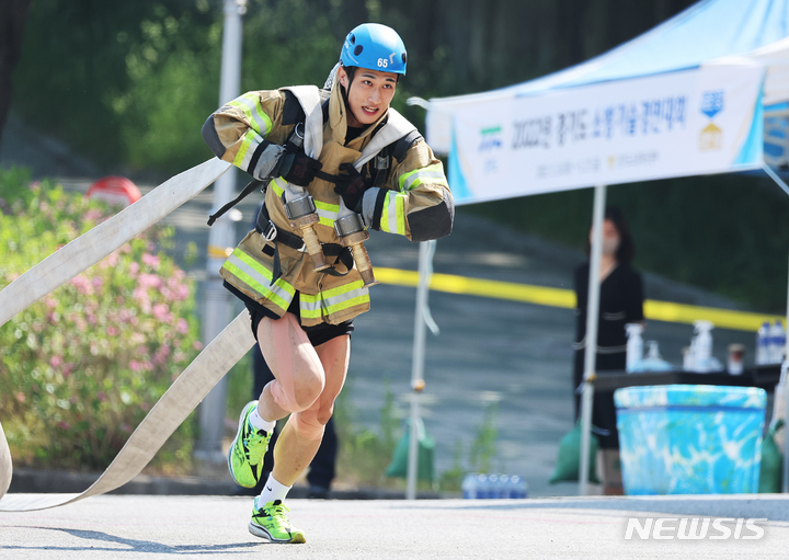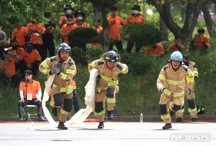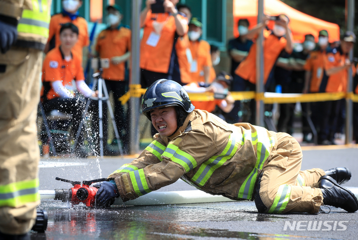 済州市我羅洞の済州道消防教育隊で24日午前、「2022年済州道消防技術競演大会」が行われ、放水競技に参加した隊員たちが消防ホースを手に力強い走りを見せた。