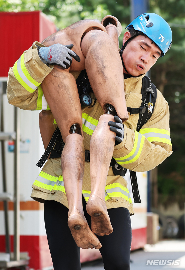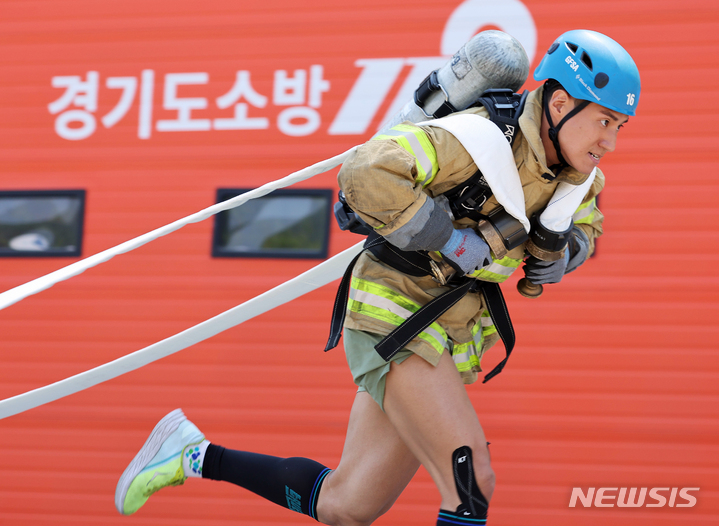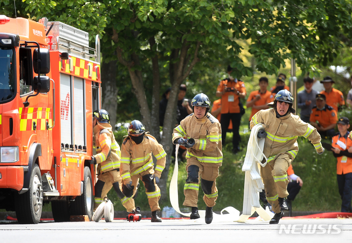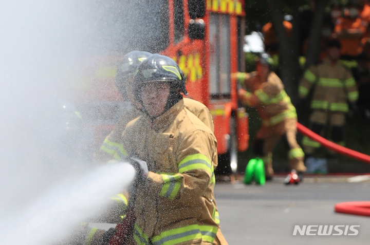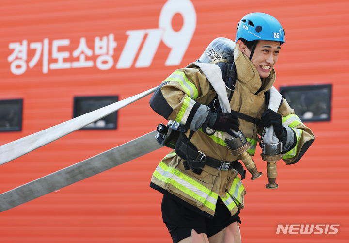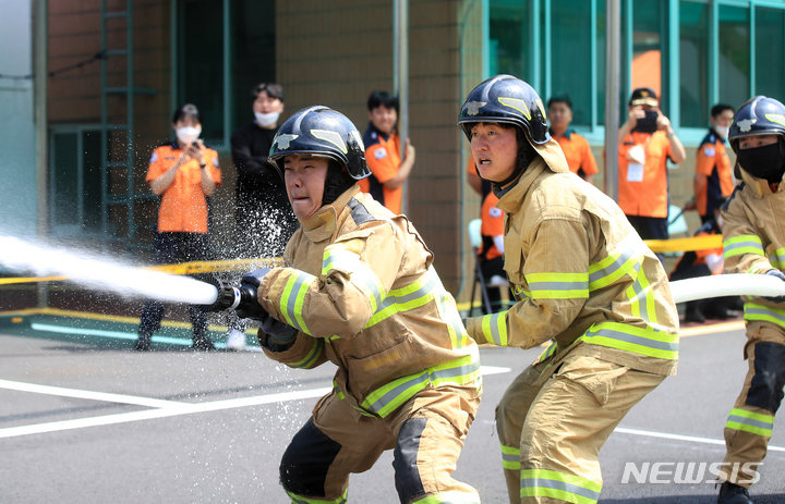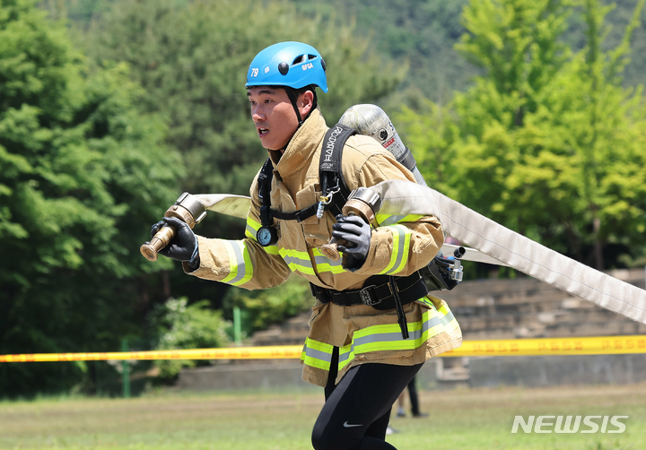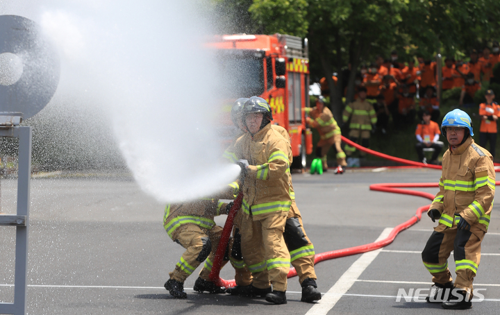 済州市我羅洞の済州道消防教育隊で24日午前、「2022年済州道消防技術競演大会」が行われ、放水競技に参加した隊員たちが消防ホースを手に力強い走りを見せた。