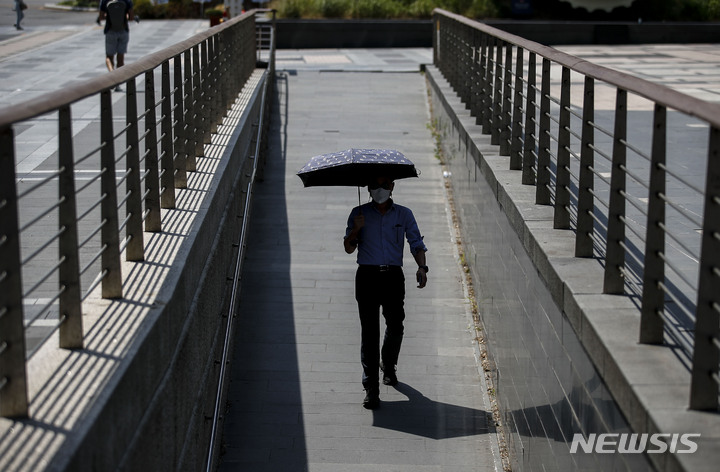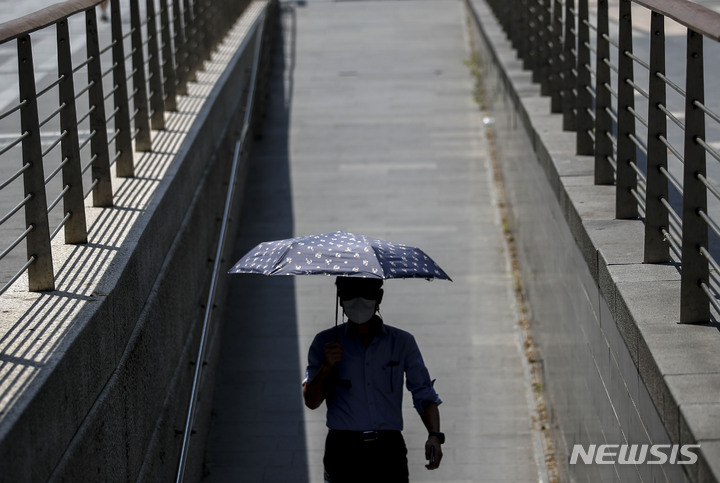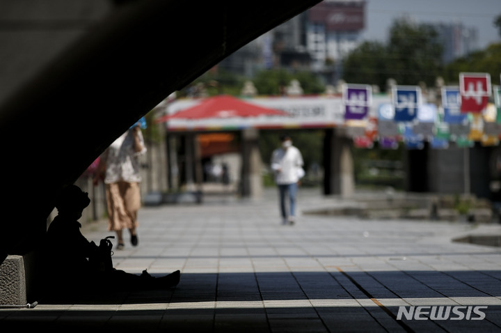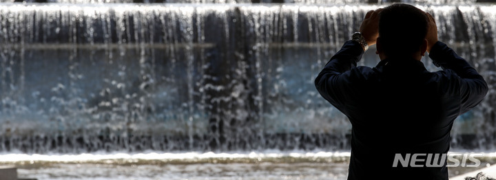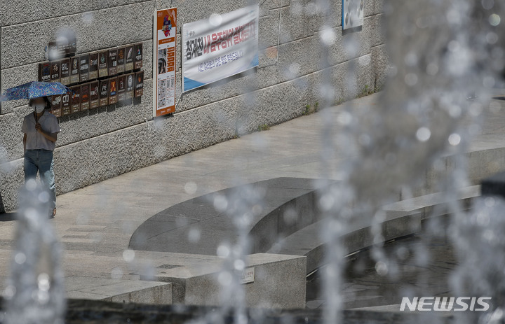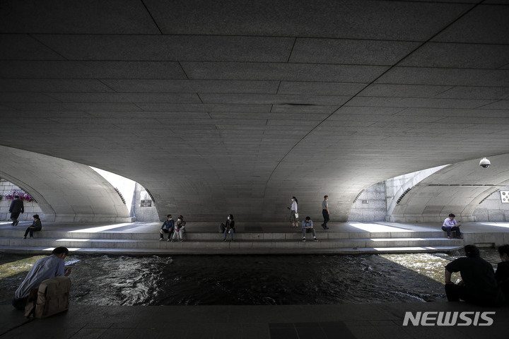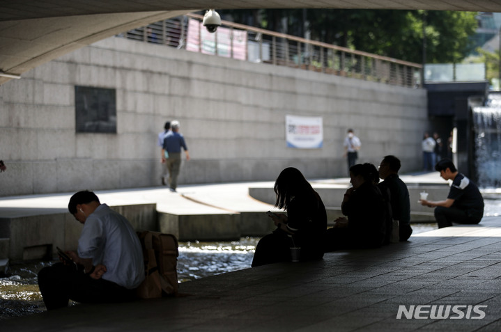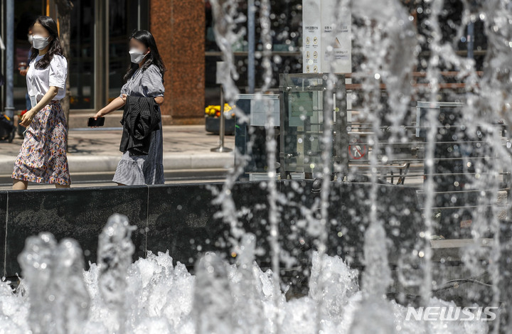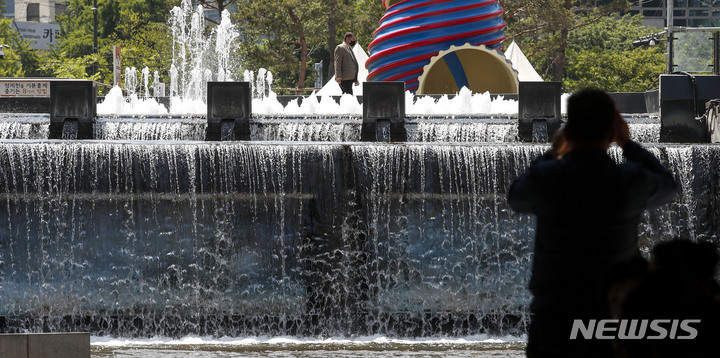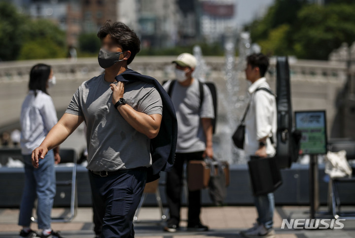 ソウルの昼間の最高気温が29度まで上がる暑い一日となった24日午後、ソウル市中区の清渓広場では、市民が上着を脱いだ姿で行き交っていた。