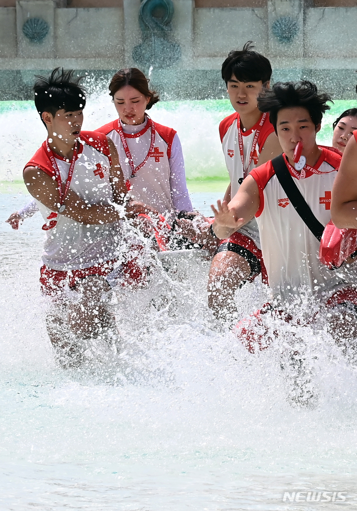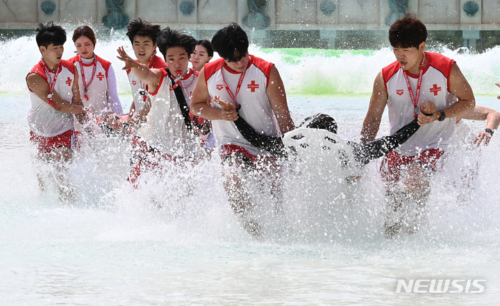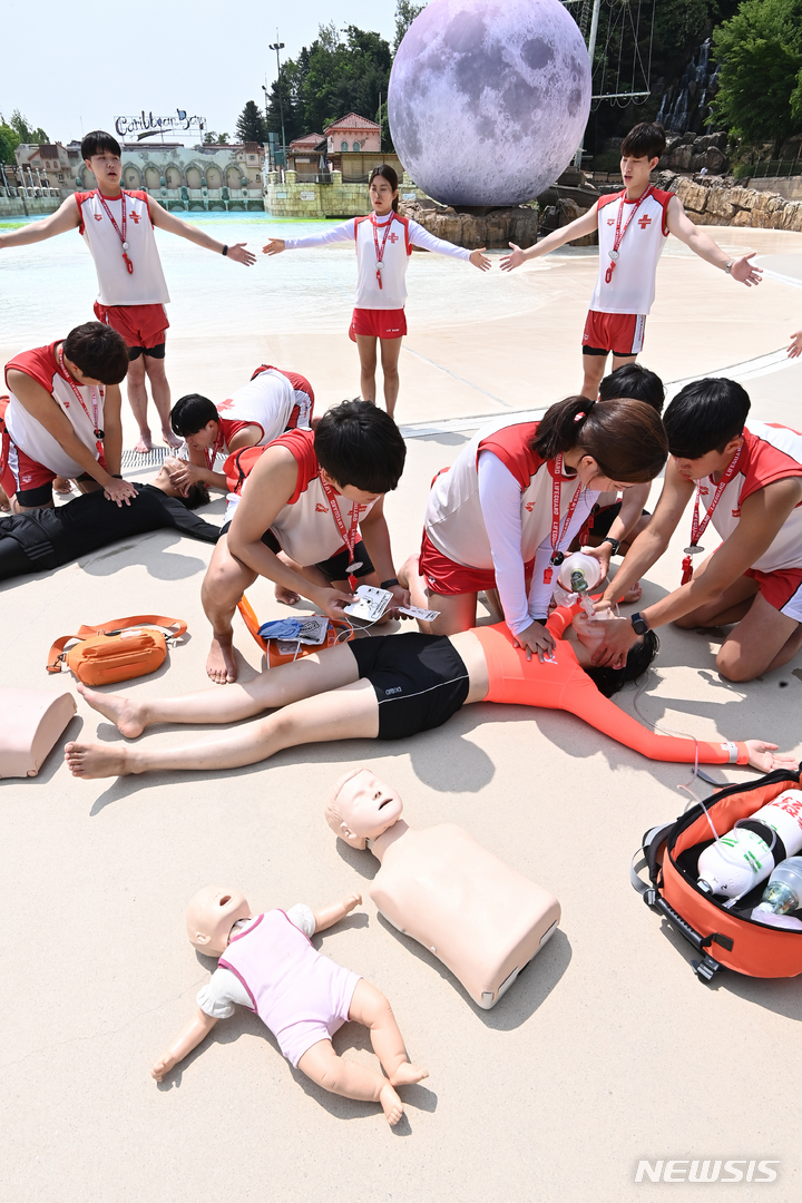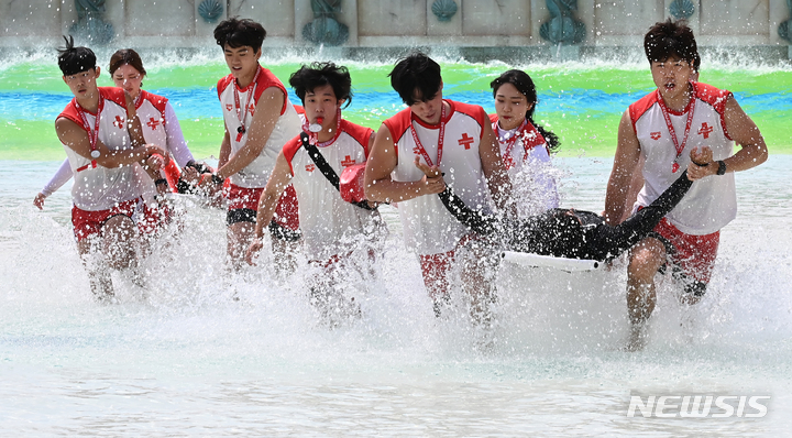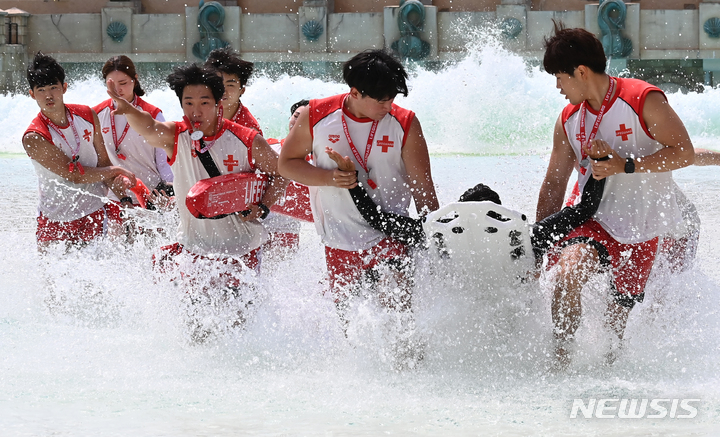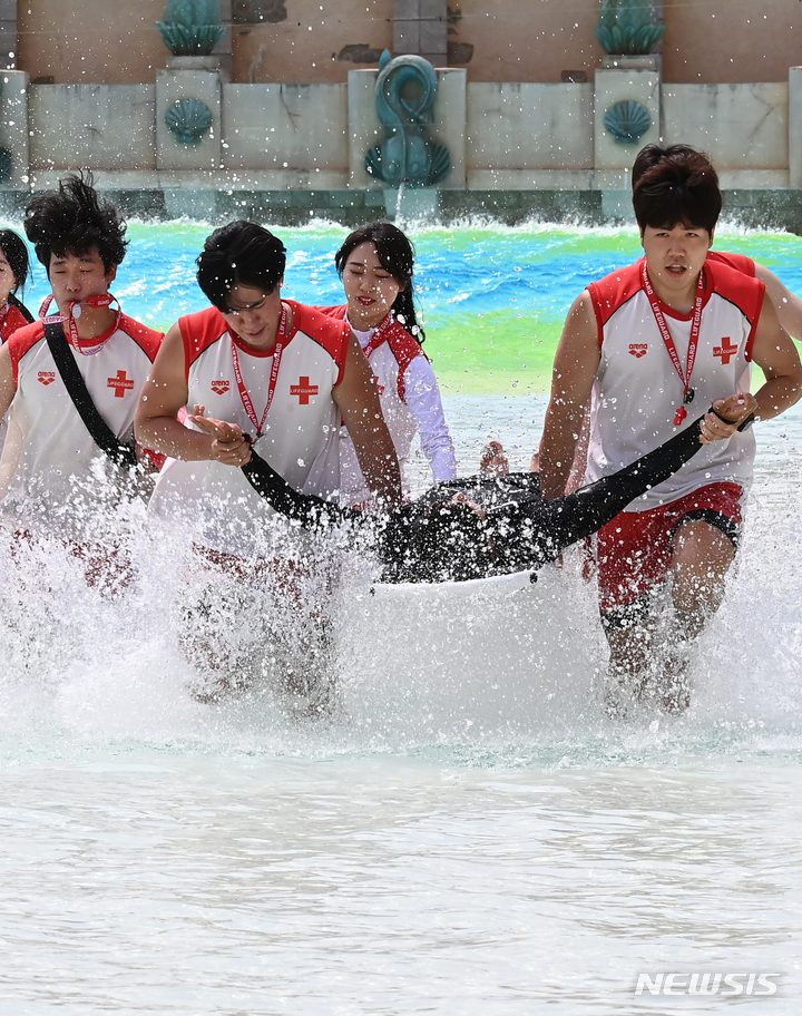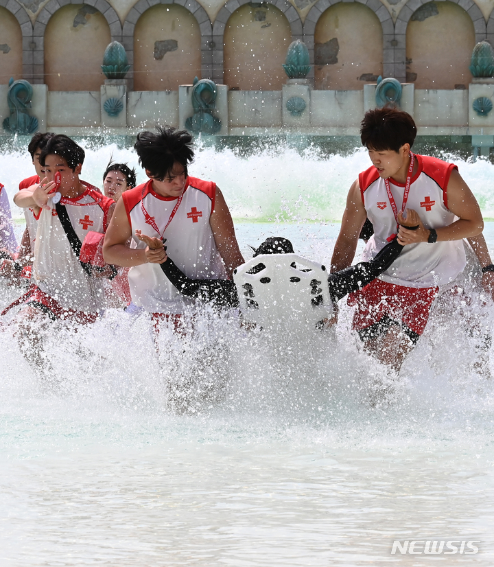 本格的な避暑シーズンを控えた25日午前、京畿道の竜仁エバーランドにある「カリビアンベイ」で、ライフガード(水上人命救助要員)が人命救助訓練を行っているところ。
