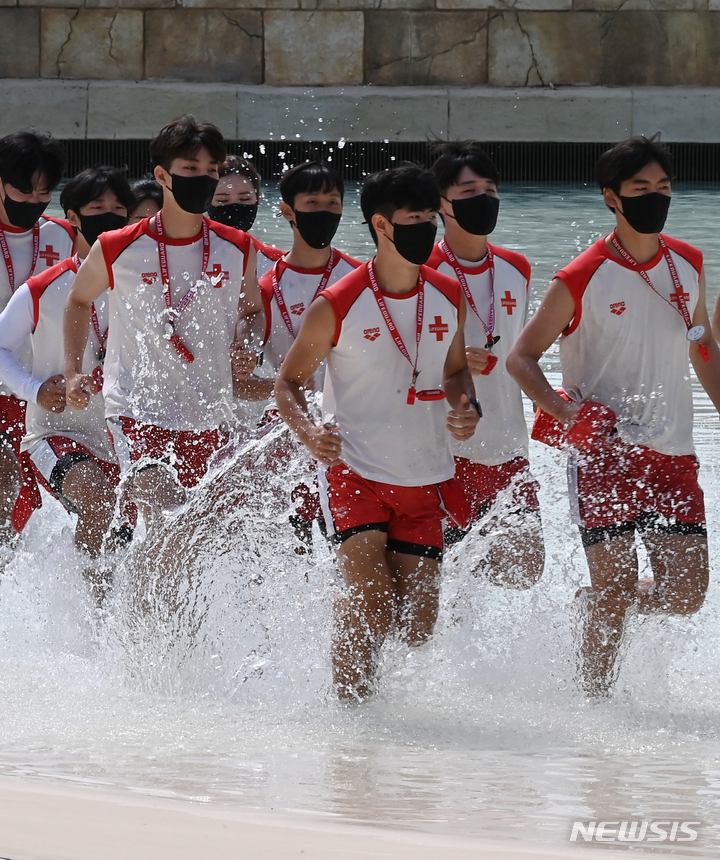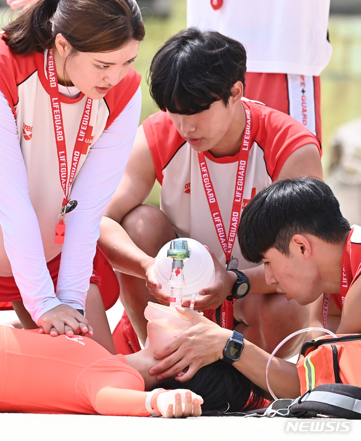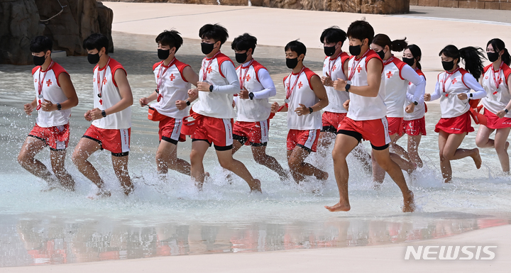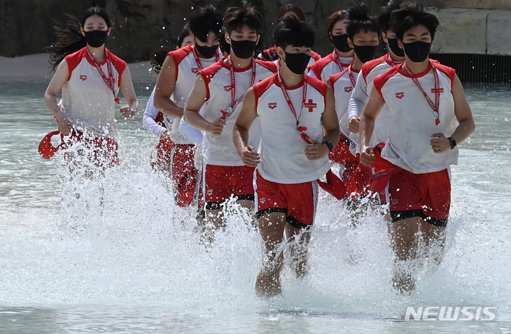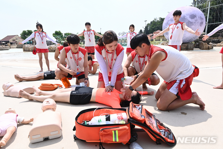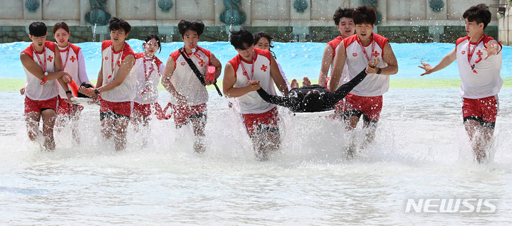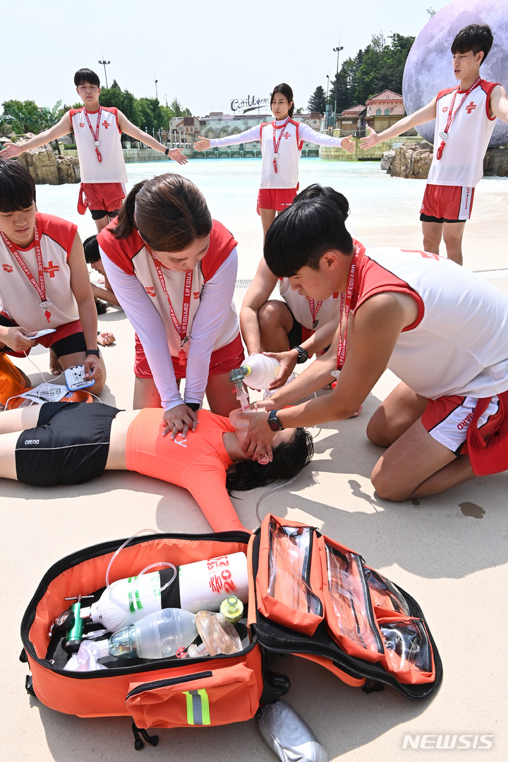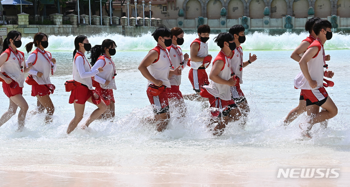 本格的な避暑シーズンを控えた25日午前、京畿道の竜仁エバーランドにある「カリビアンベイ」で、ライフガード(水上人命救助要員)が人命救助訓練を行っているところ。