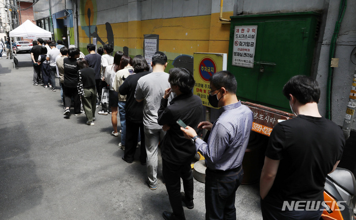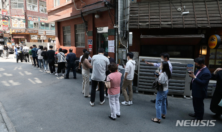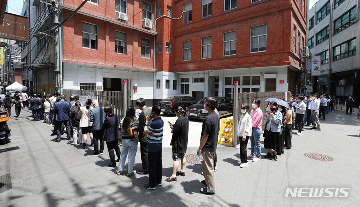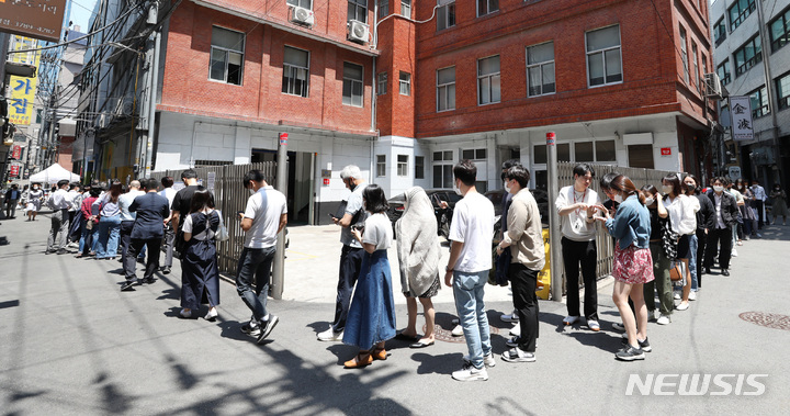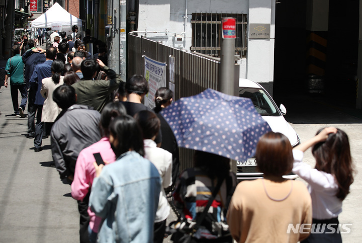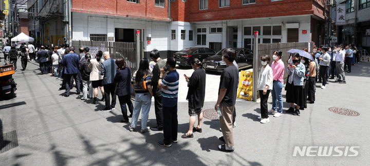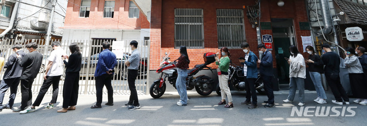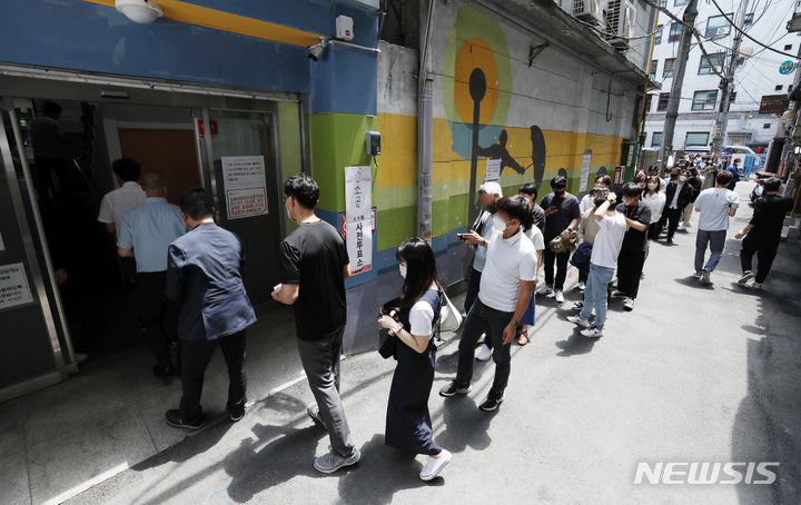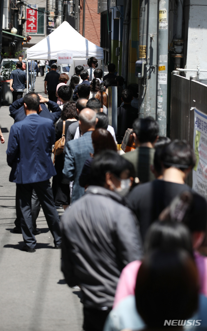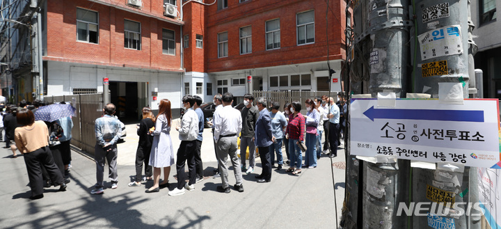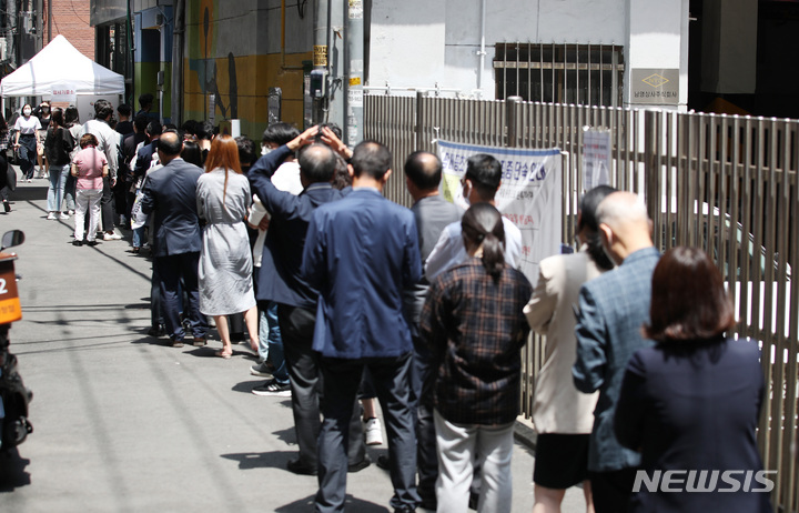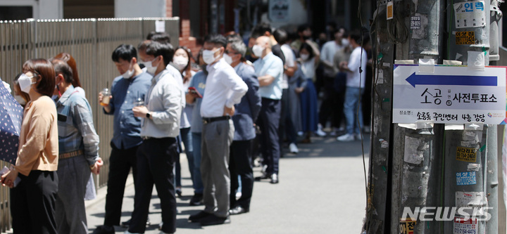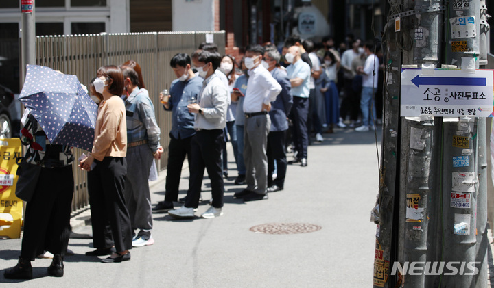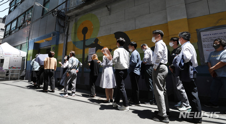第8回全国統一地方選挙の事前投票が始まった27日、ソウル市中区小公洞の事前投票所では、ランチタイムに社会人が投票のために列を作って待っていた。