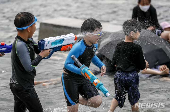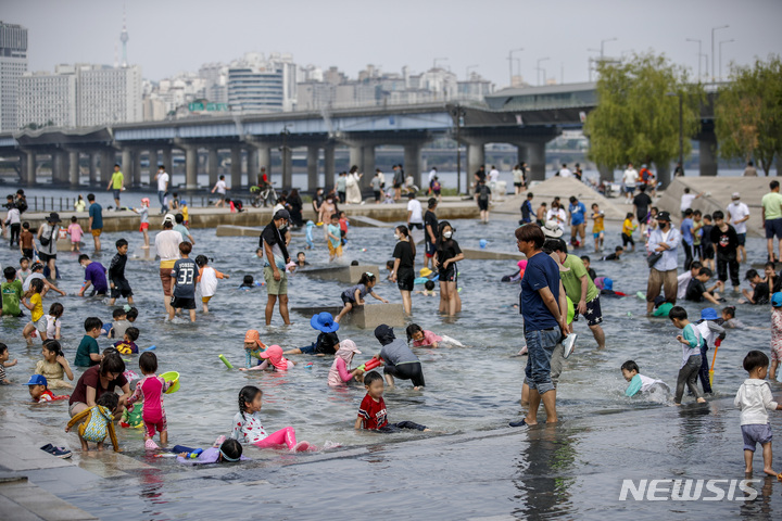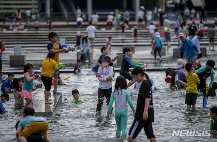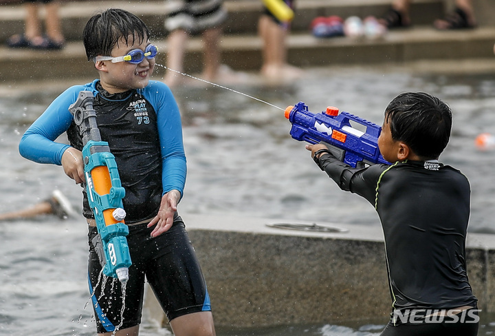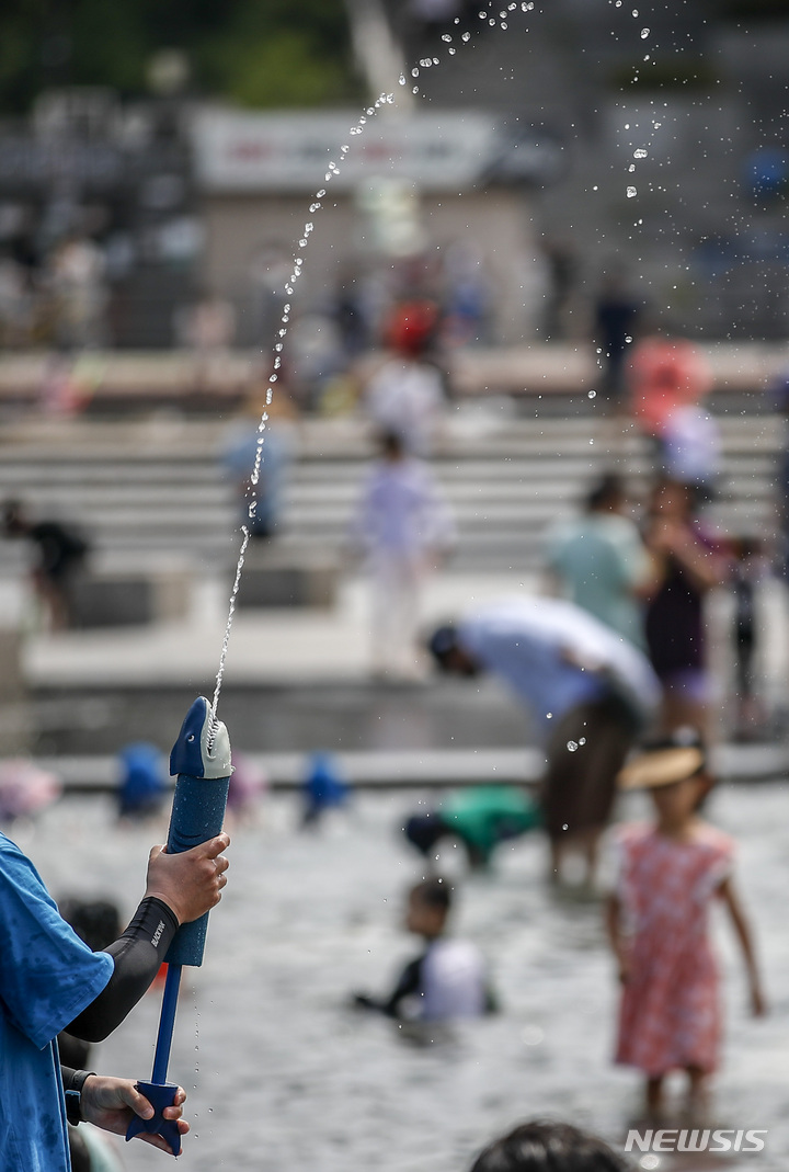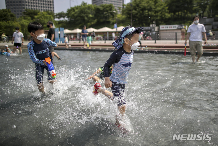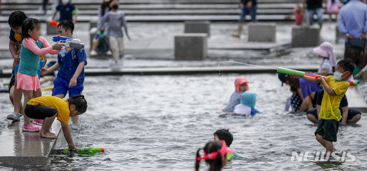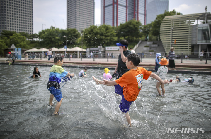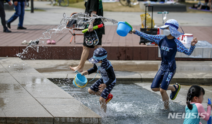 【NEWSIS】気温が上昇した29日午後、ソウル市永登浦区の汝矣島漢江公園内にあるムルビッ広場を訪れた子どもたち。水遊びをして楽しいひとときを過ごした。