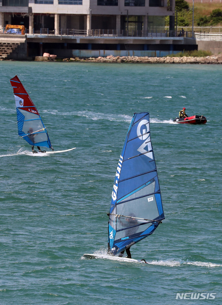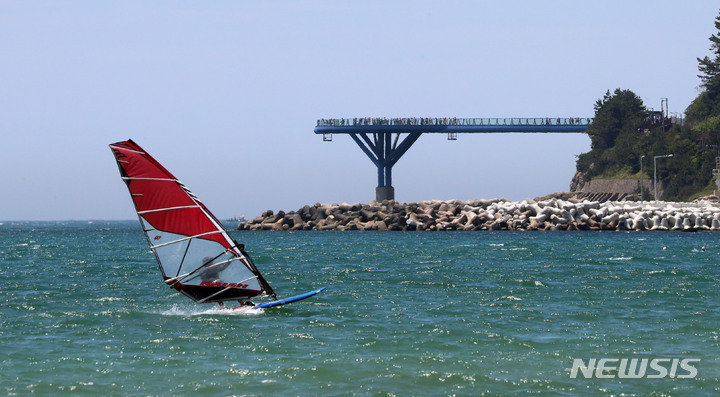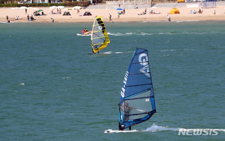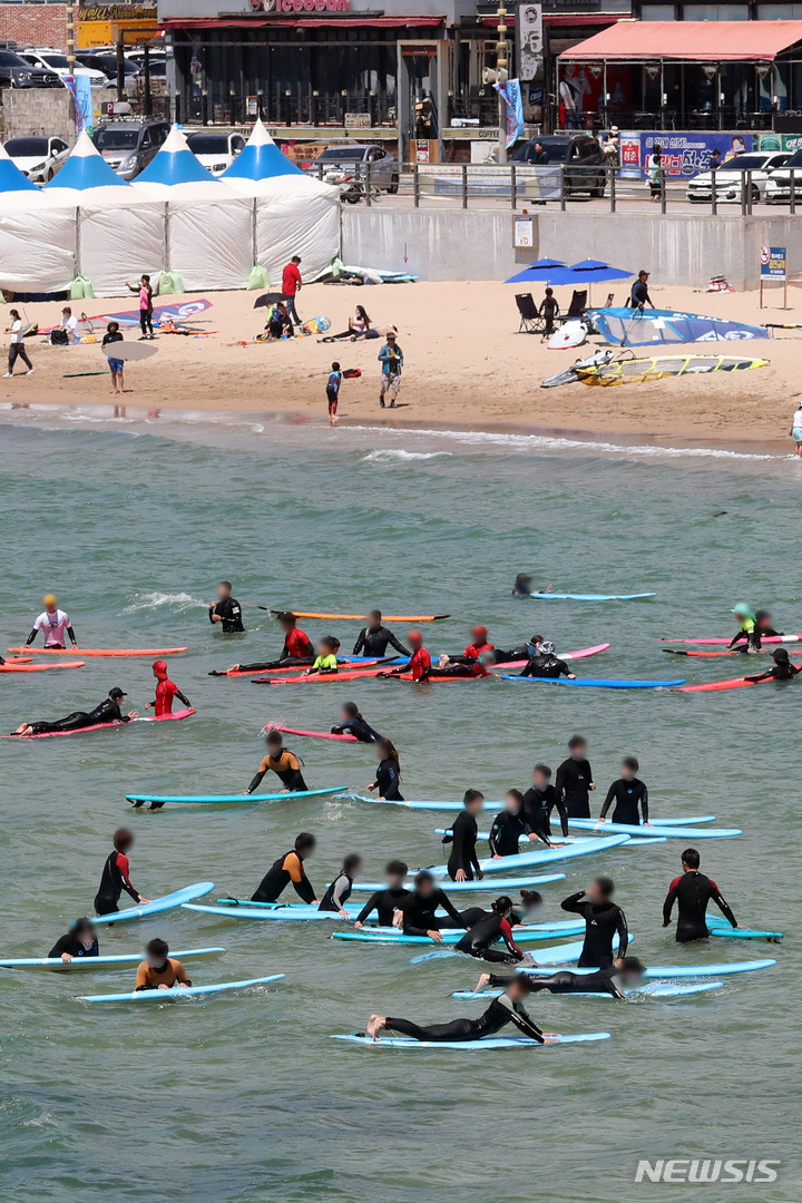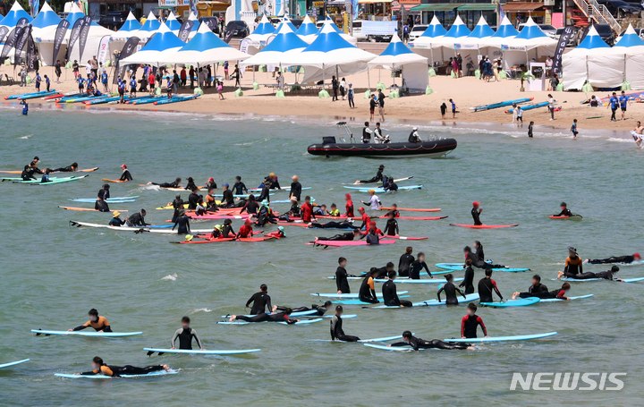 【NEWSIS】気温が上がった29日、釜山市海雲台区の松亭海水浴場を訪れ、波を楽しむサーファーたち。