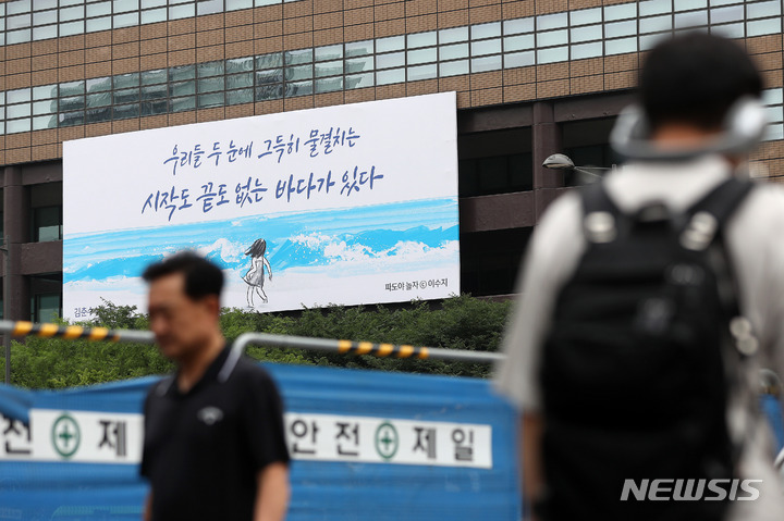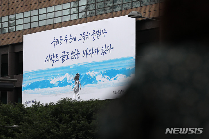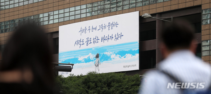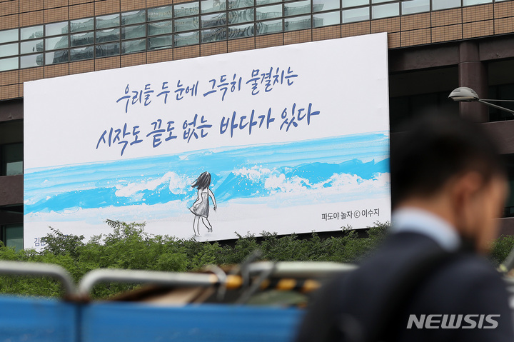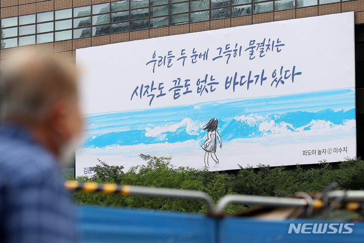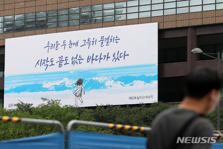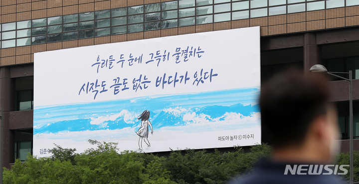 ソウル市鍾路区の教保生命ビルの外壁に30日午前、光化門文字板(広告用大型ボード)夏バージョンが掲げられた。今回のメッセージは詩人・金春洙(キム・チュンス)の詩から取ったものだ。
