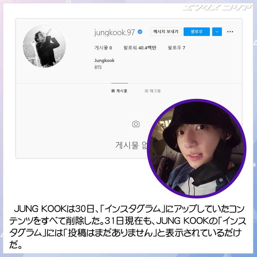 防弾少年団(BTS)のメンバー、JUNG KOOKが写真共有ソーシャル・ネットワーキング・サービス(SNS)「インスタグラム」の投稿をすべて削除した。JUNG KOOKは30日、「インスタグラム」にアップしていたコンテンツをすべて削除した。31日現在も...