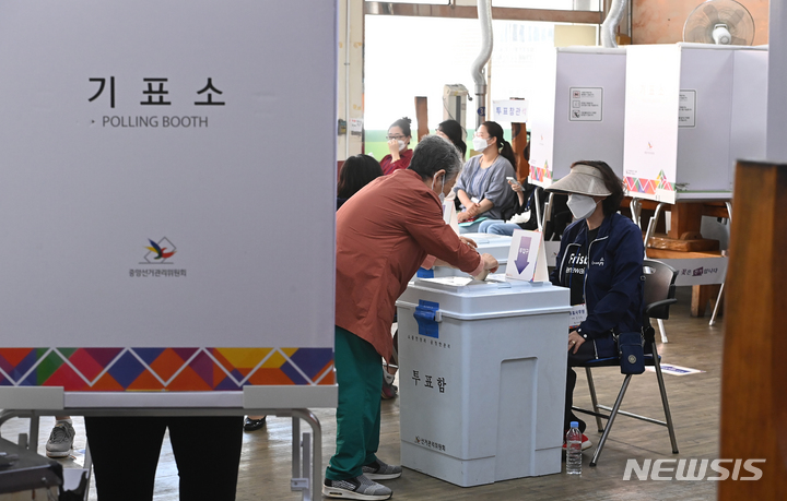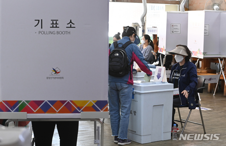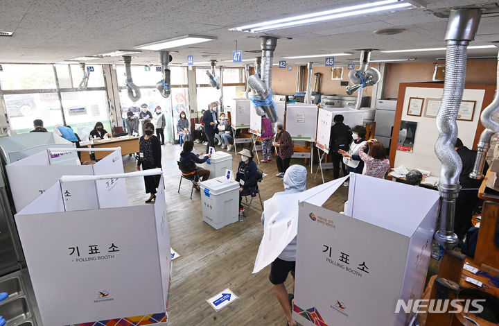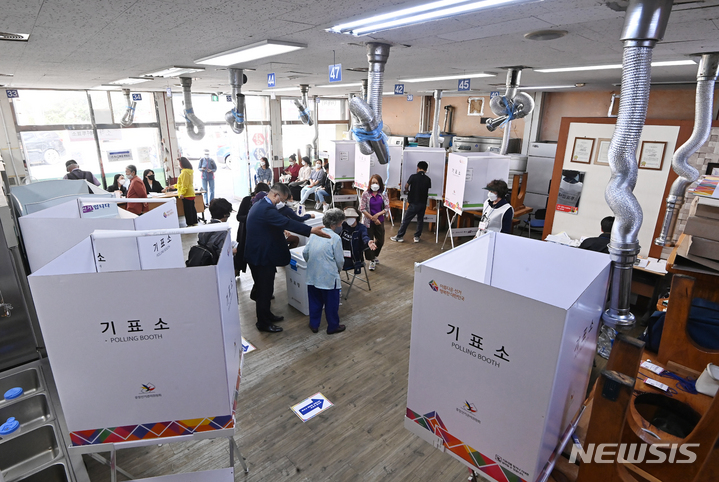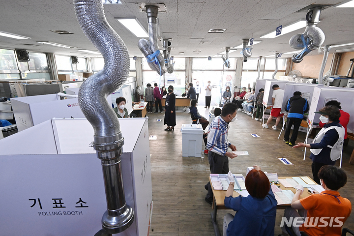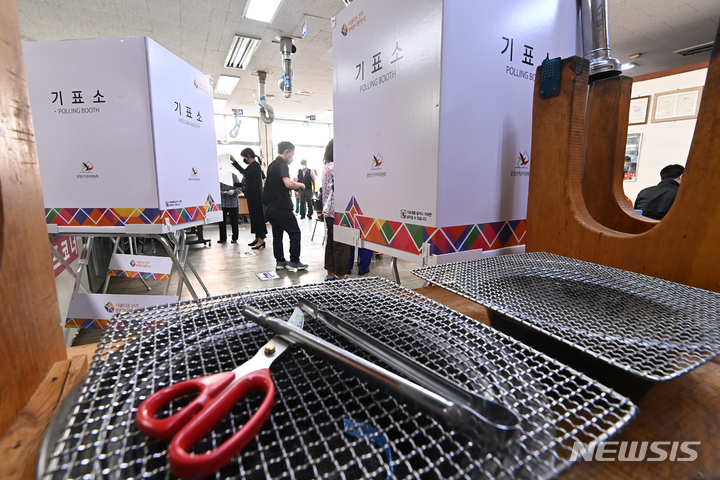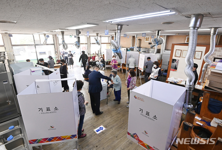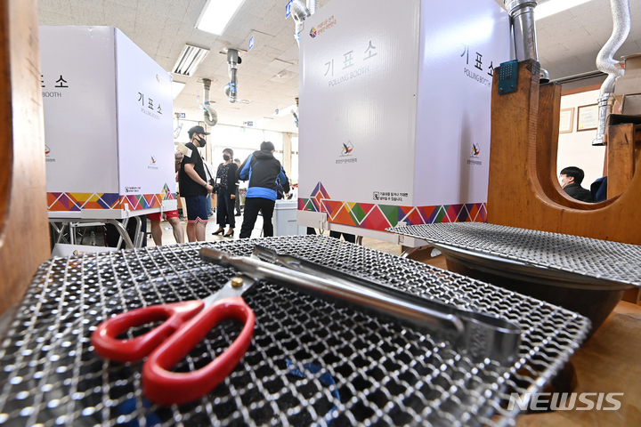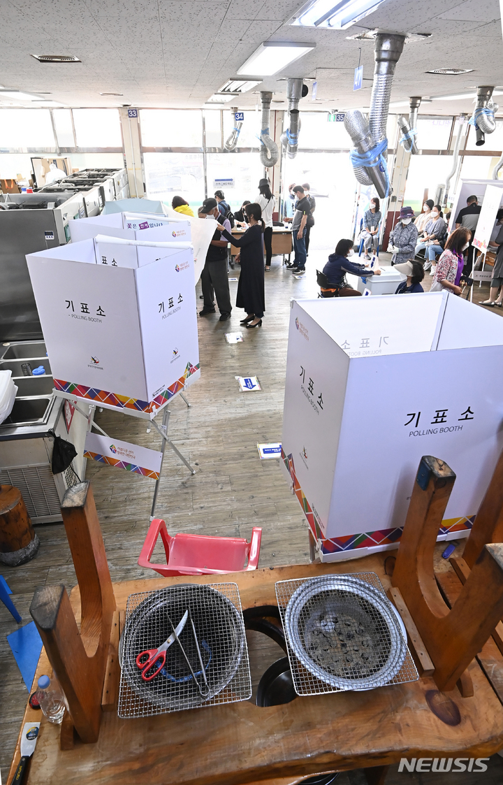 【NEWSIS】第8回全国同時地方選挙日(統一地方選挙)が行われた1日午前、京畿道光明市内の飲食店に設けられた所下洞第4投票所で投票をする有権者たち。