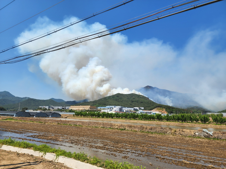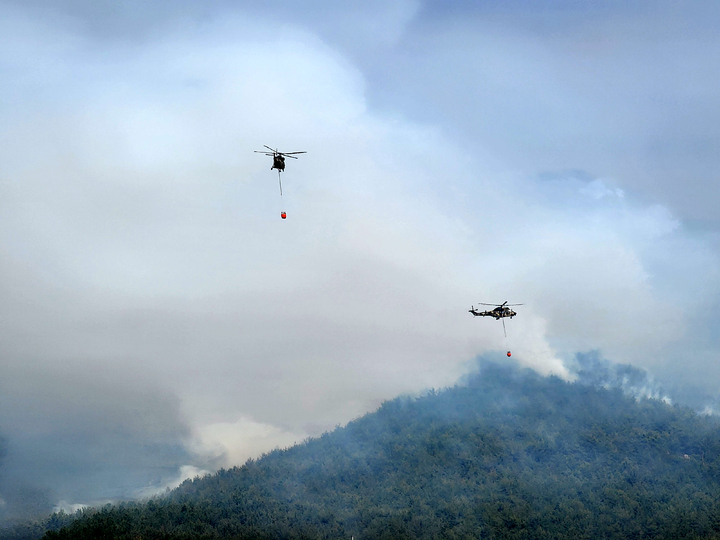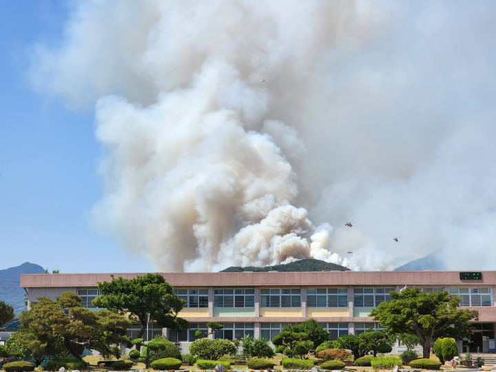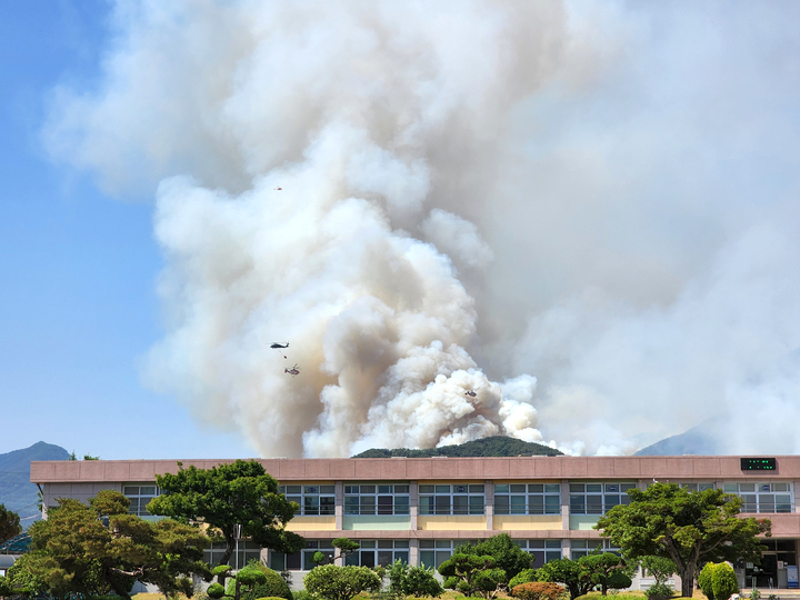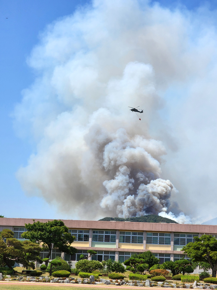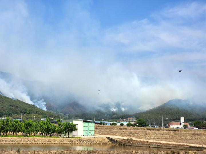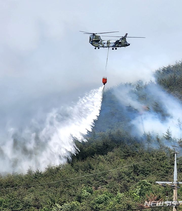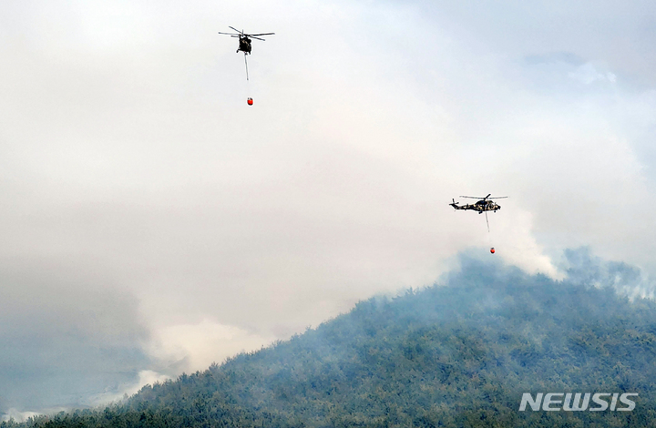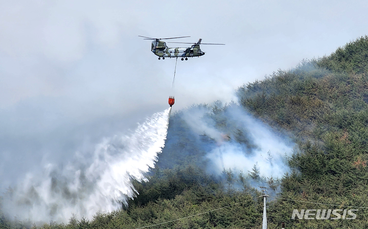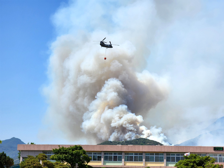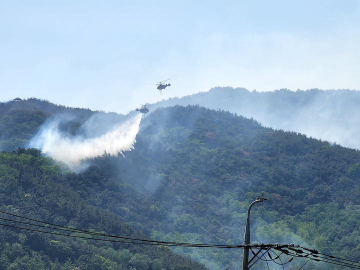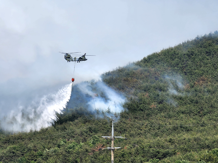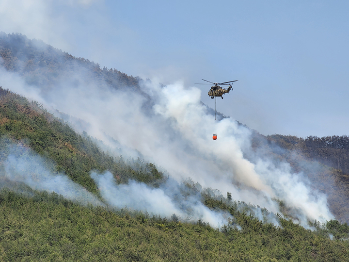 慶尚南道密陽で山火事が発生して二日目となった1日午前、密陽市上東面一帯で山火事の消火作業を行っている韓国軍のヘリコプターの様子。