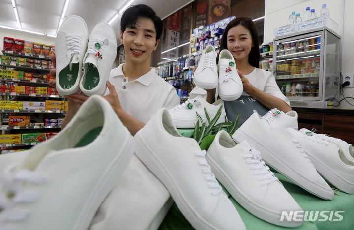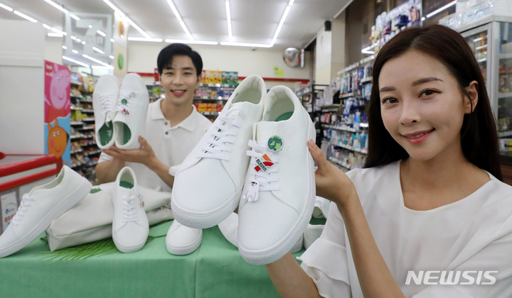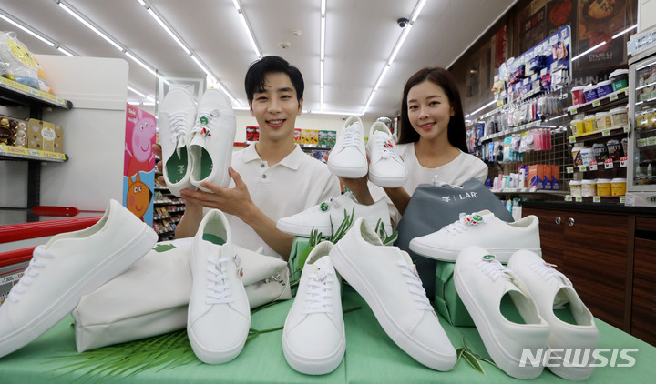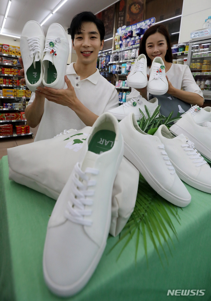 ソウル市中区のコンビニエンスストア「セブン‐イレブン」小公店で2日午前、コンパニオンらがエコなファッションブランド「LAR」とコラボした「地球スニーカー」セブン‐イレブン・スペシャル・エディションをPRした。