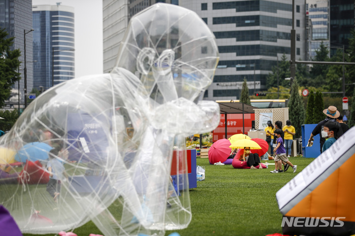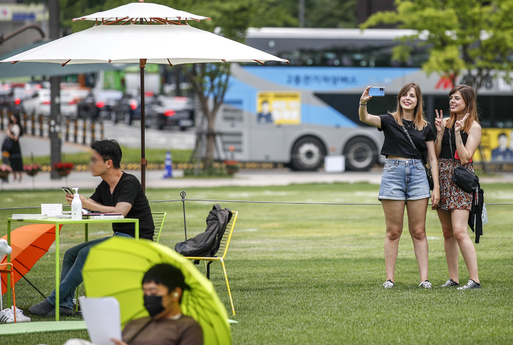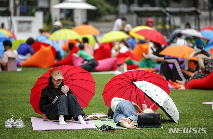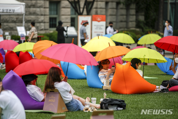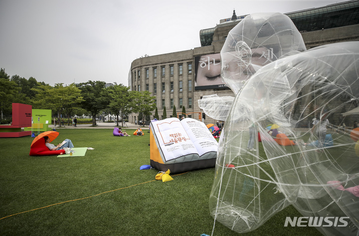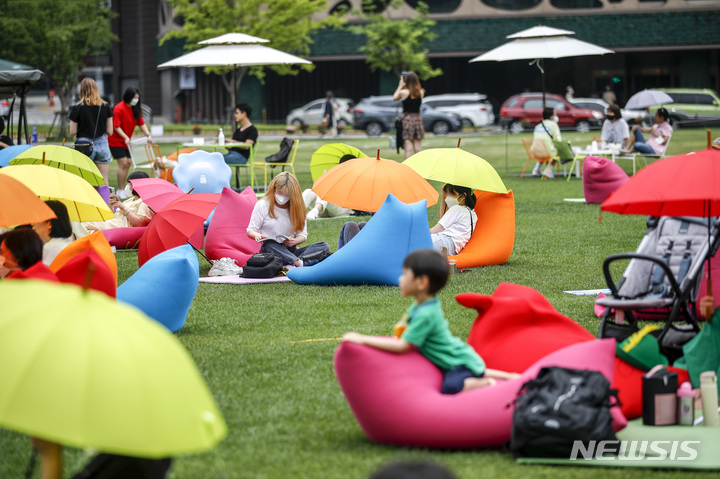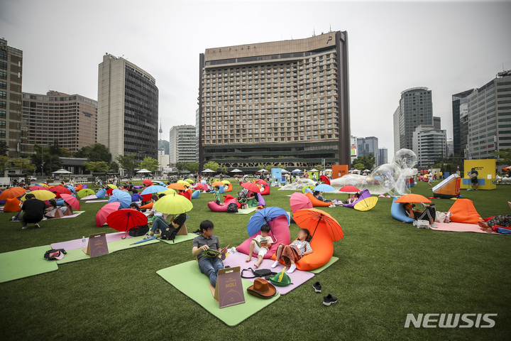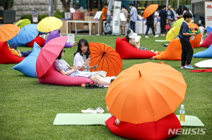 4日午後、ソウル市中区のソウル市庁前に設置された「本を読むソウル広場」を訪れて、読書しつつ休みを取っている市民の様子。