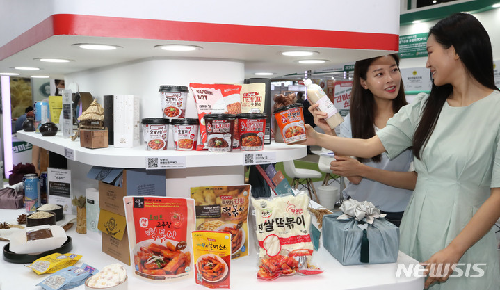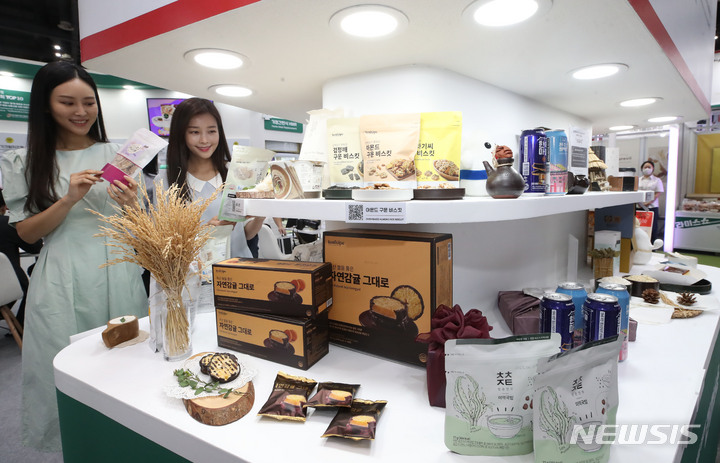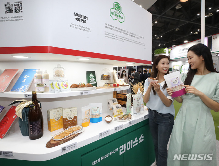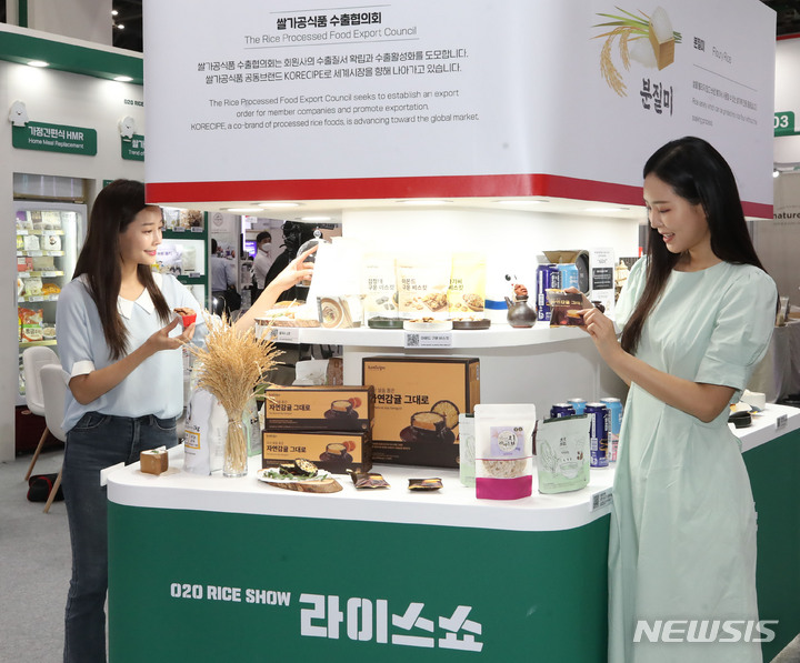 ソウル国際食品産業大展 (ソウルフード2022)の2022コメ加工食品産業大展が開幕した7日午前、京畿道高陽市のKINTEX展示場で、関係者が韓国のコメで作った加工食品を紹介しているところ。