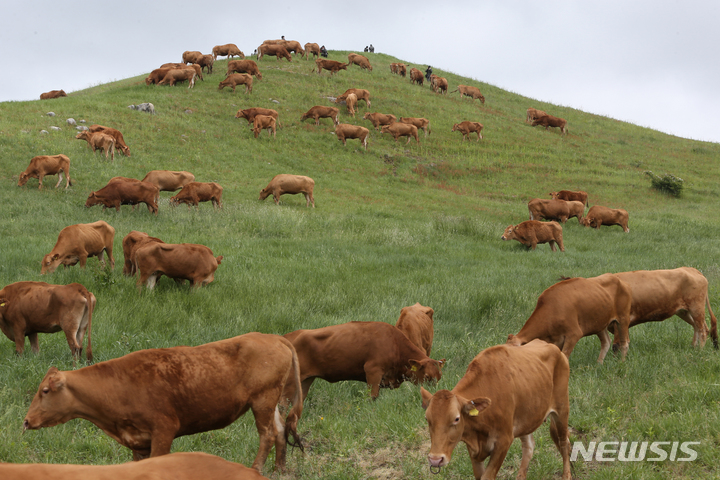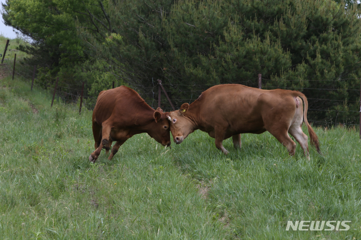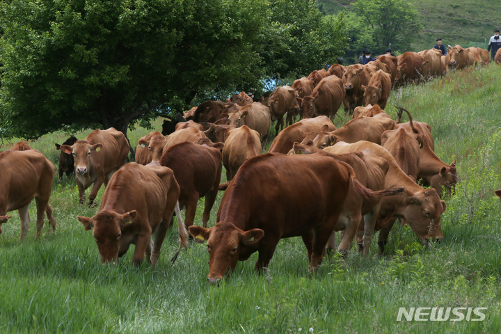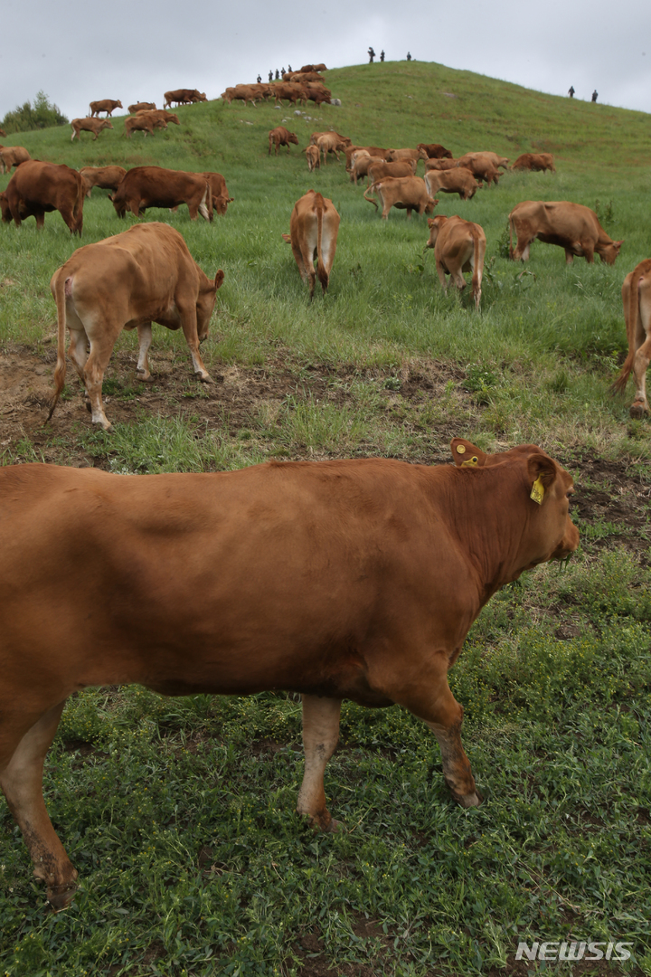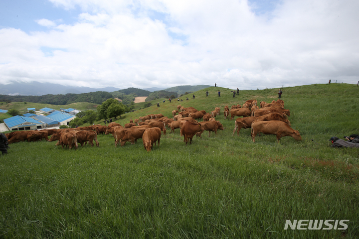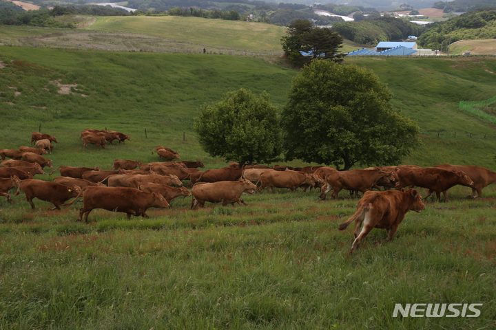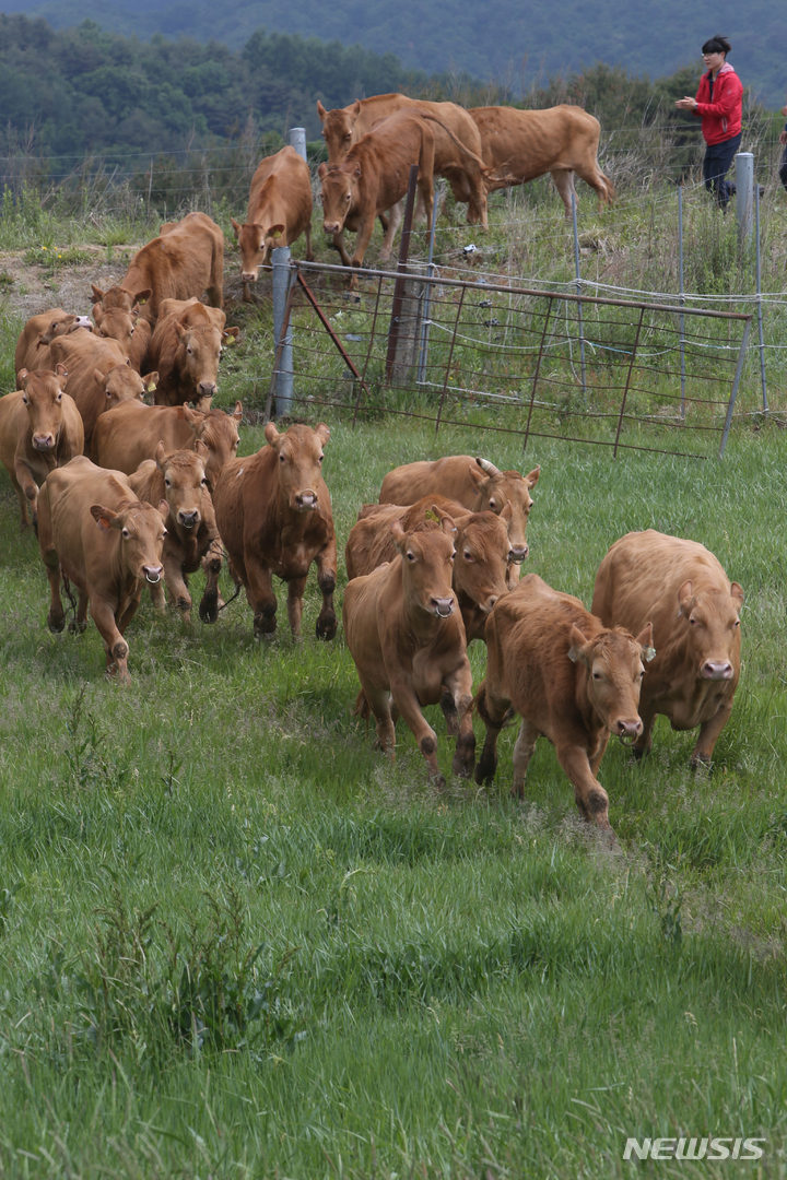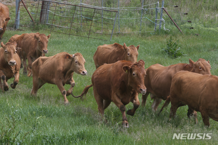 江原道平昌郡大関嶺面にある国立畜産科学院韓牛研究所の草地で8日午前、韓牛(韓国伝統の肉牛)たちが走っていた。今年初めて韓牛200頭が草地に放牧された。