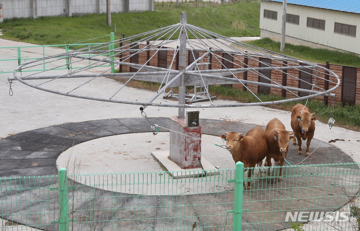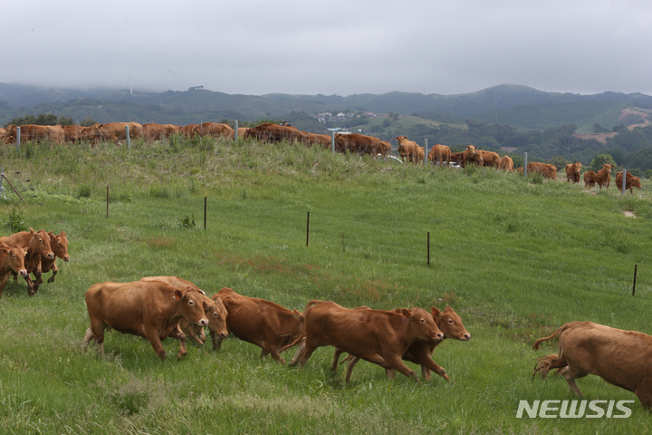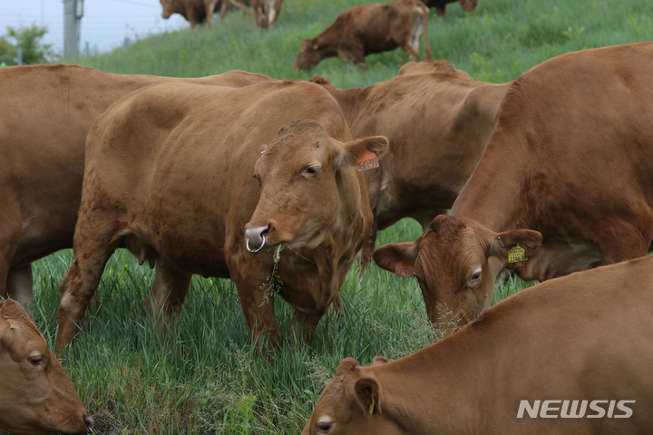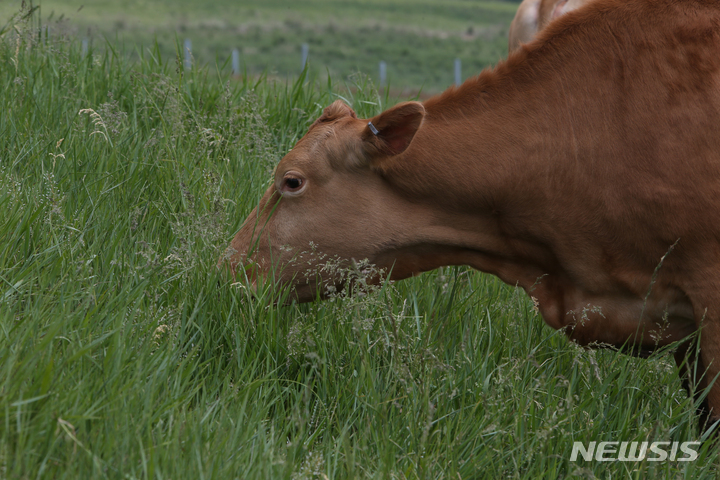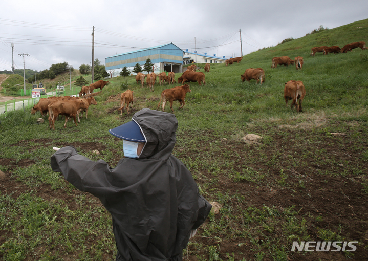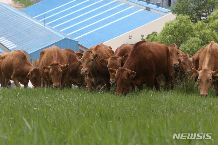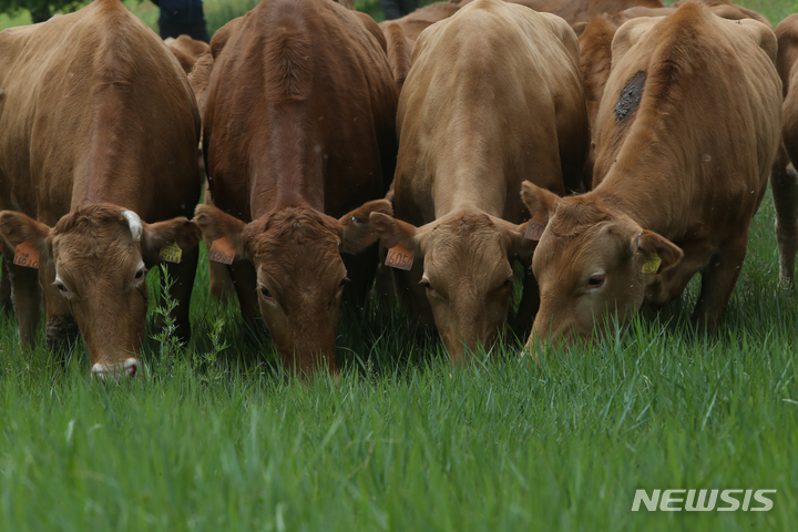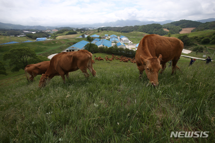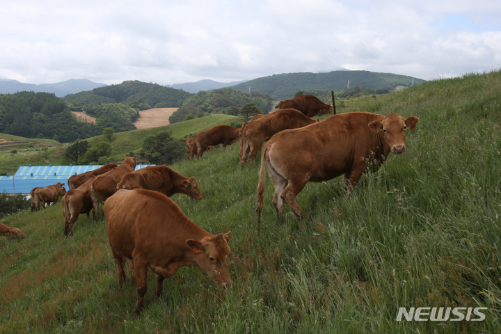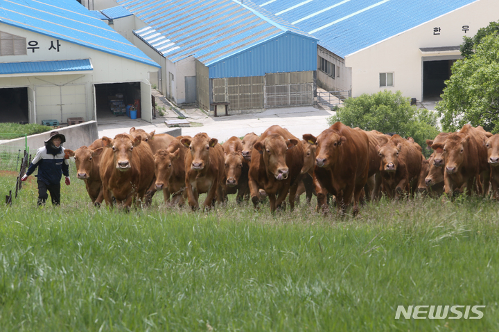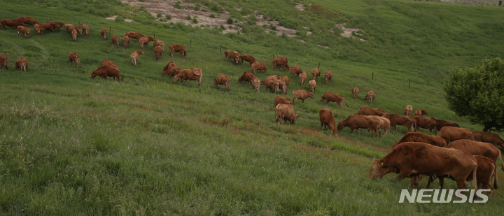 江原道平昌郡大関嶺面にある国立畜産科学院韓牛研究所の草地で8日午前、韓牛(韓国伝統の肉牛)たちが走っていた。今年初めて韓牛200頭が草地に放牧された。