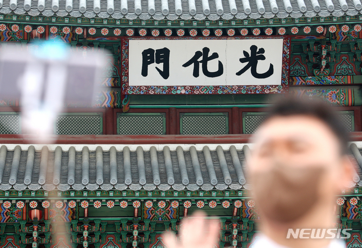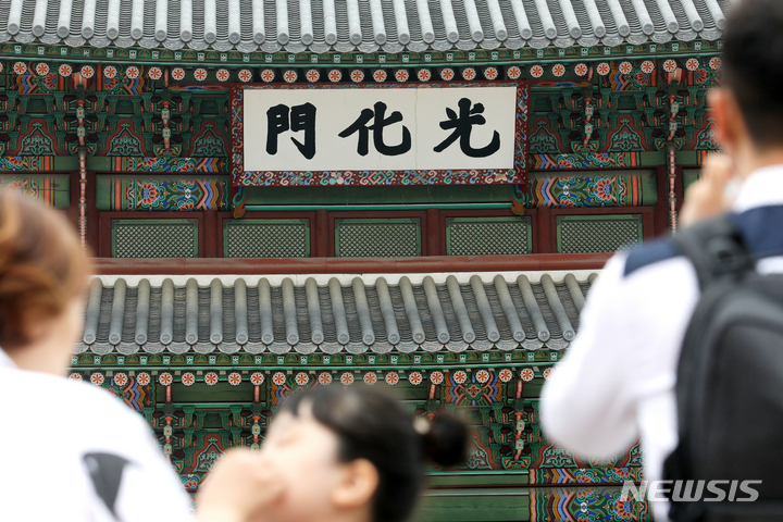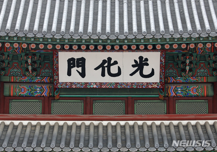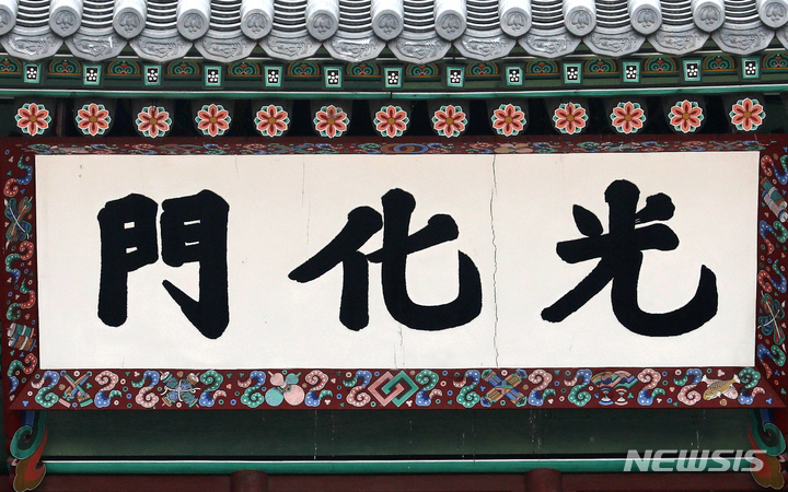 9日午前、ソウル市内にある光化門の扁額(へんがく=伝統建築の門戸に掲げられる額)の「光」と「化」の間にひびが入っていた。文化財庁は「扁額をあらためて製作中だ。来年下半期に終わる予定」と説明した。