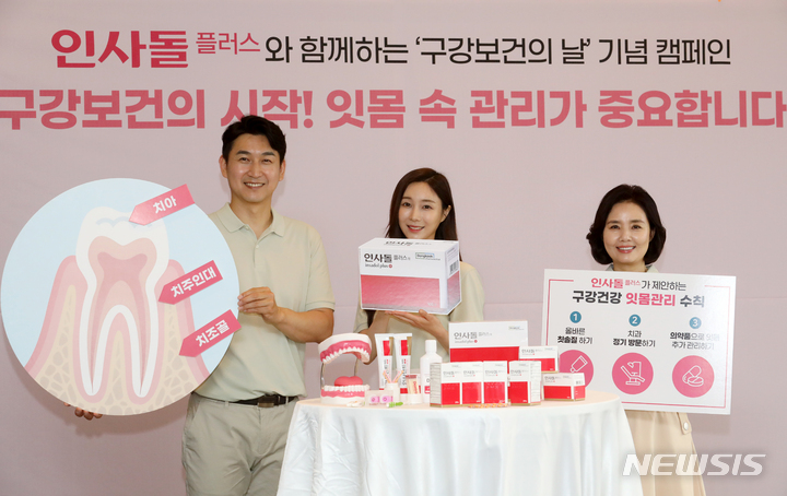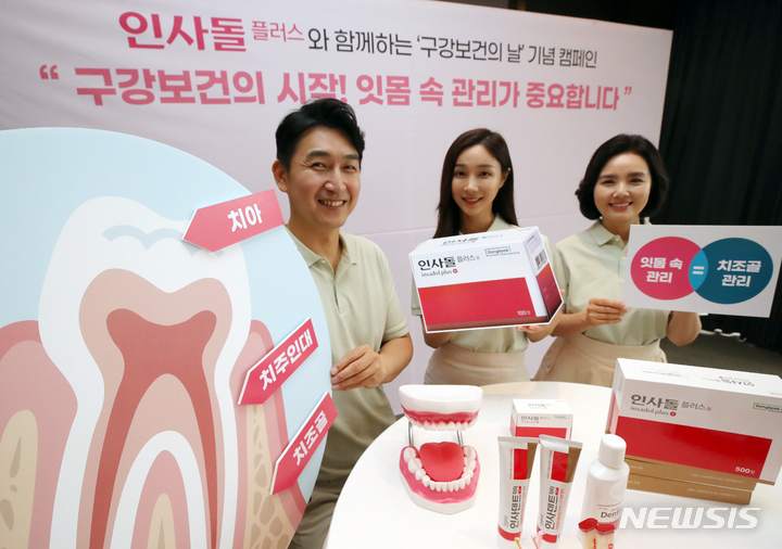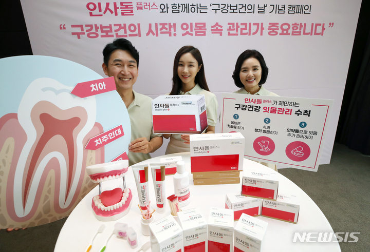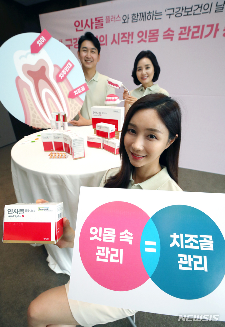 東国製薬が9日午前、ソウル市中区のザ・プラザホテルで「インサドル・プラスと共にある口腔保健の日キャンペーン」を行った。写真は、歯茎の薬を配合した「インサドル・プラス」を紹介するコンパニオンの様子。