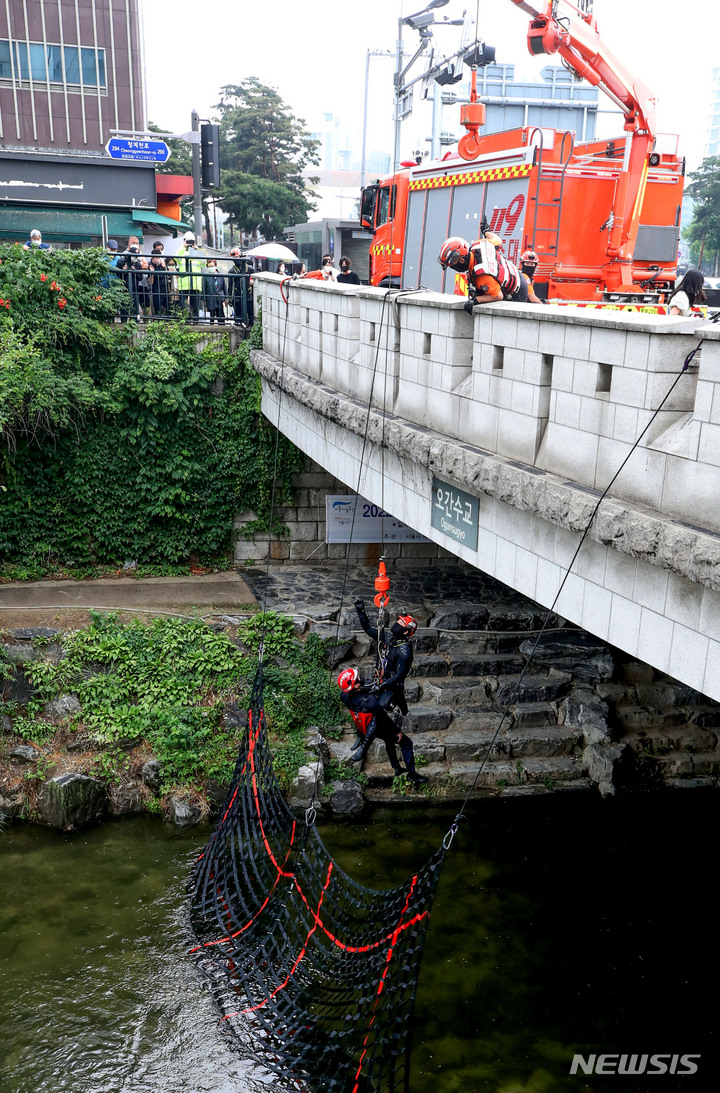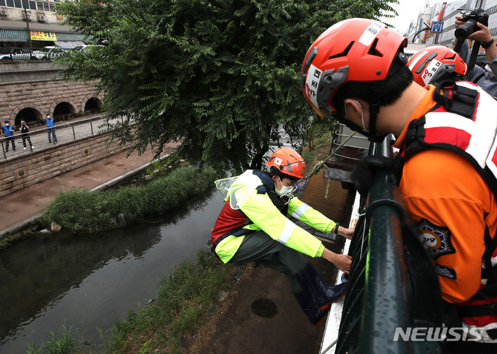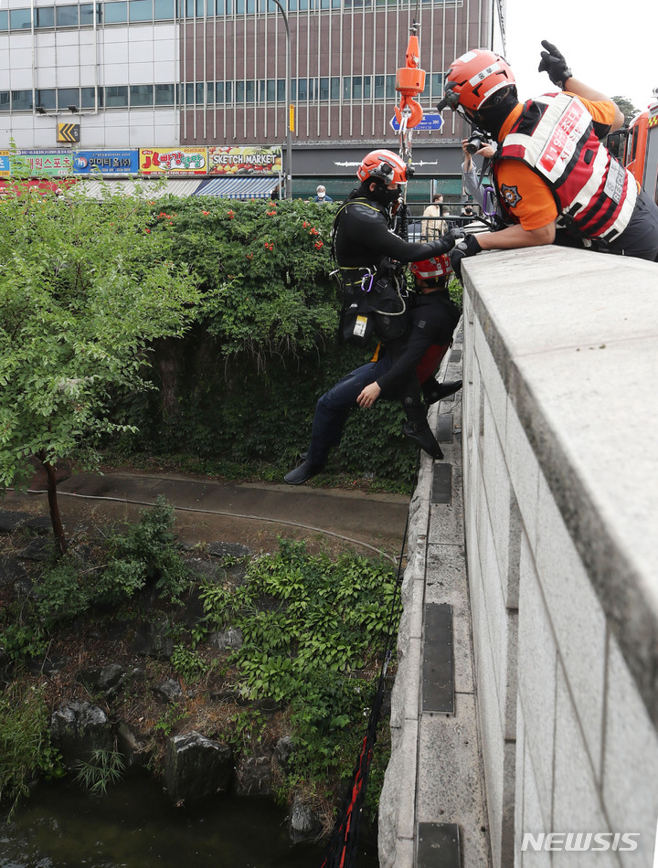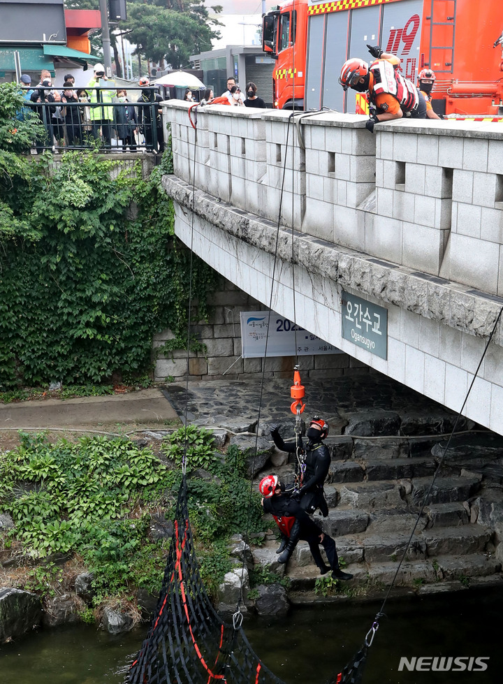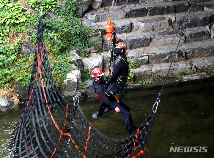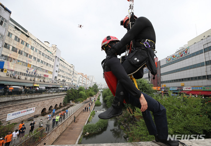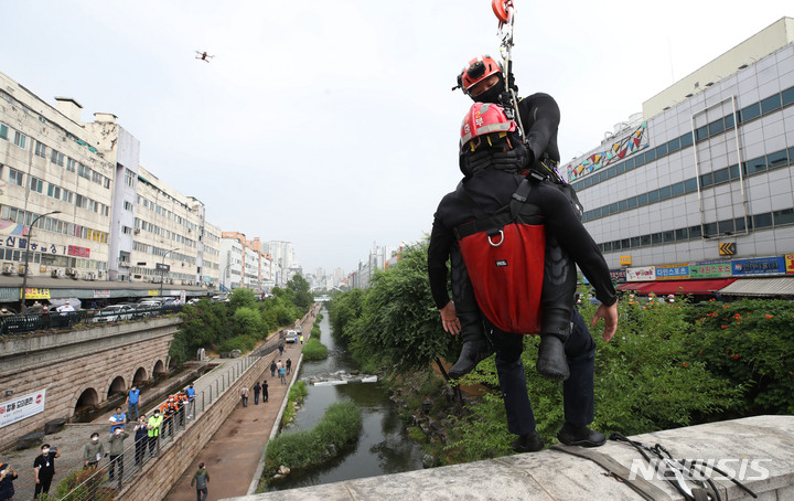 夏場の局地性集中豪雨により清渓川で市民が孤立したという緊急事態を想定し、ソウル市とソウル施設公団の職員、鍾路消防署および中部消防署の消防隊員などが9日午後、清渓川の五間水橋(ソウル市鍾路区)で市民救助模擬合同訓練を行っているところ。