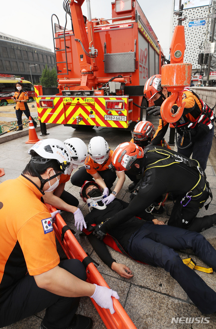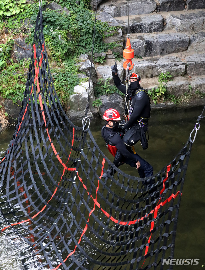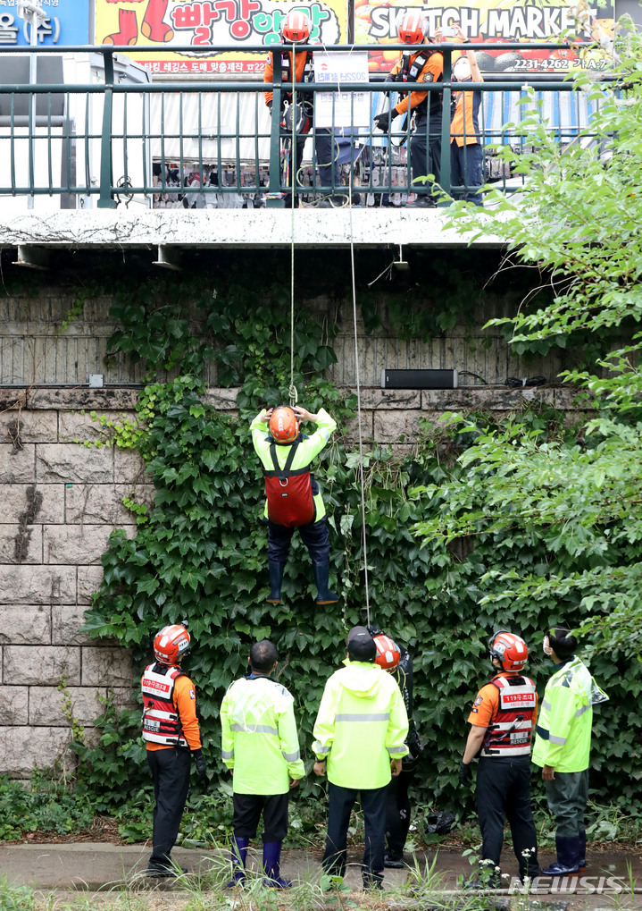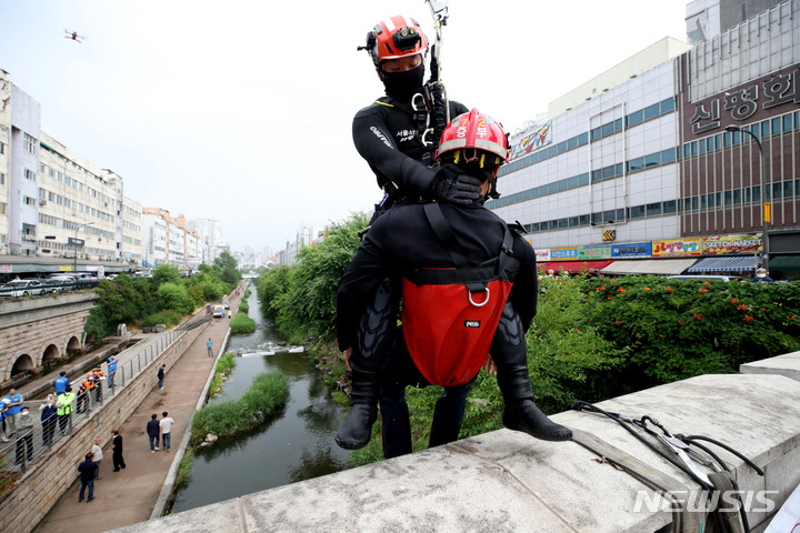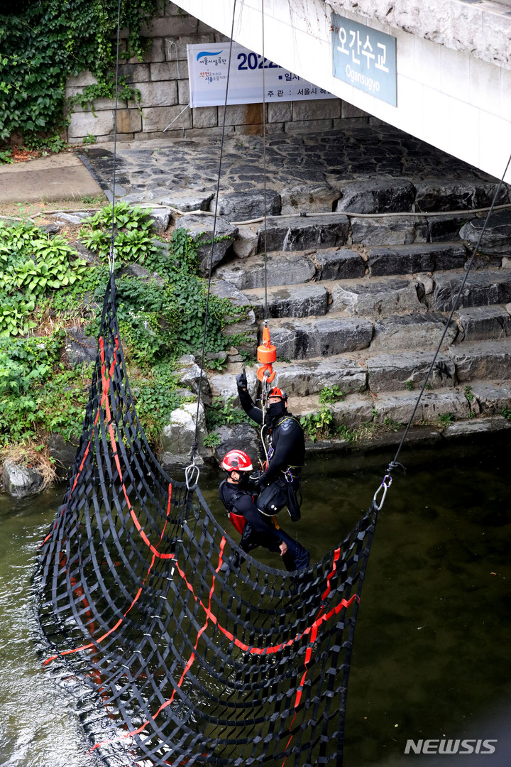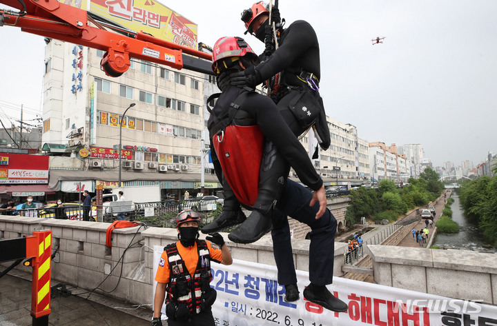 夏場の局地性集中豪雨により清渓川で市民が孤立したという緊急事態を想定し、ソウル市とソウル施設公団の職員、鍾路消防署および中部消防署の消防隊員などが9日午後、清渓川の五間水橋(ソウル市鍾路区)で市民救助模擬合同訓練を行っているところ。