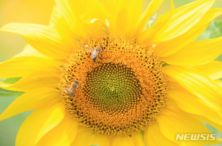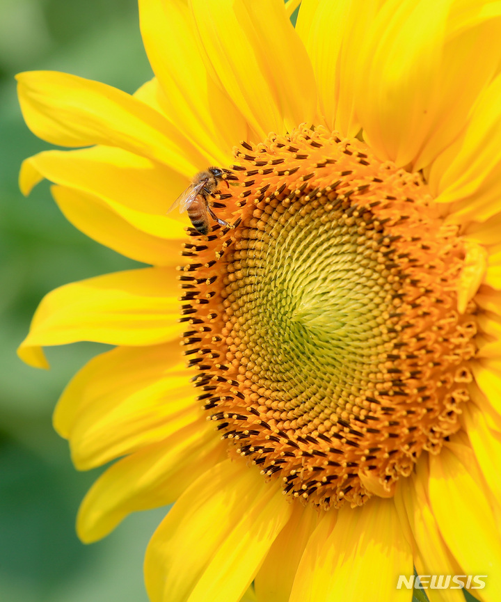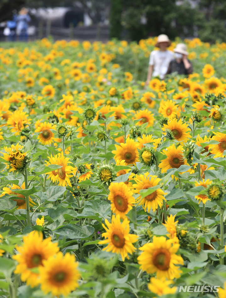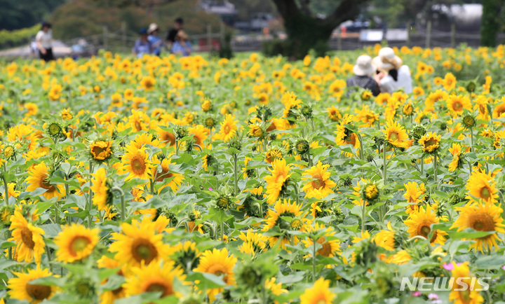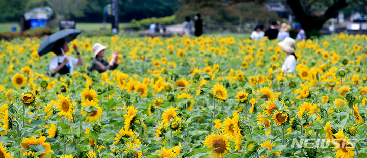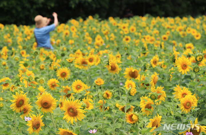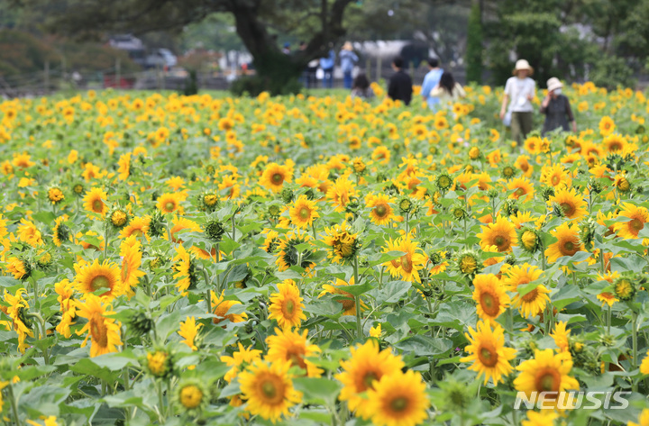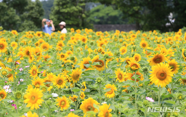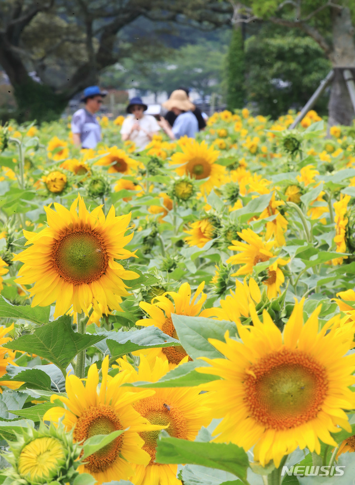 済州島内の昼間の気温が27度を超えるなど明らかな初夏の天気となった16日午前、済州市涯月邑缸坡頭里の抗蒙遺跡地では、訪れた人々が大きく咲いたヒマワリを鑑賞しつつ楽しいひとときを過ごしていた。
