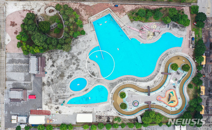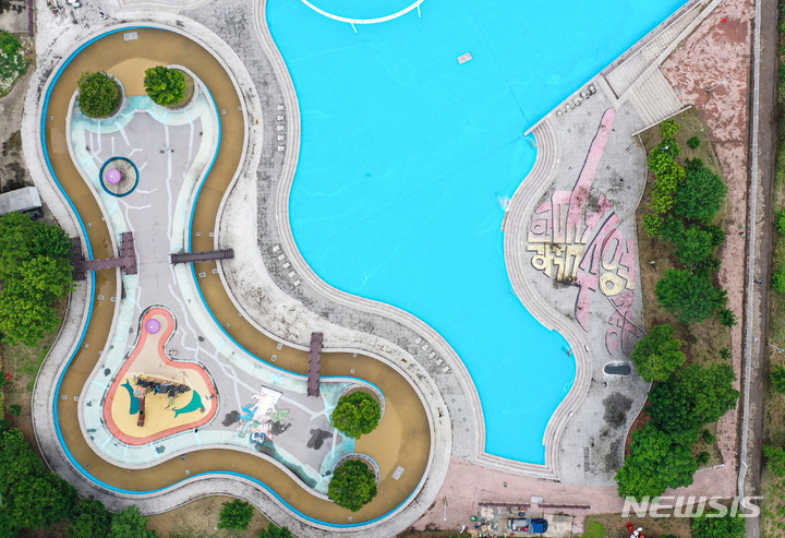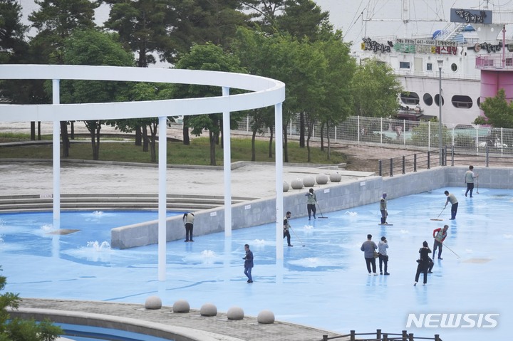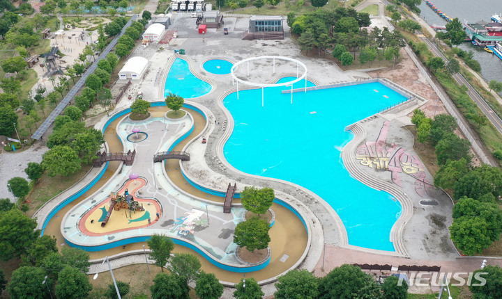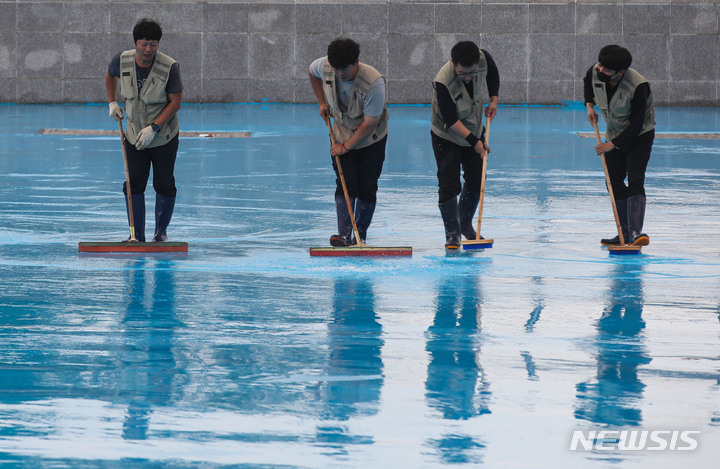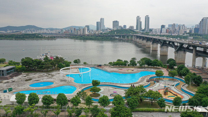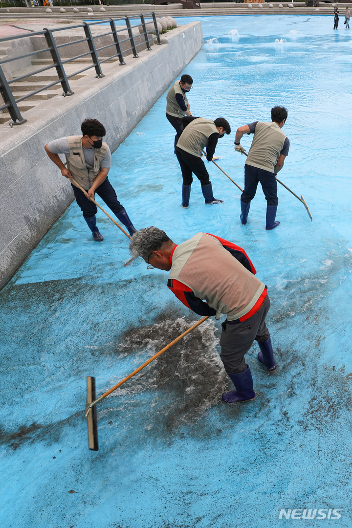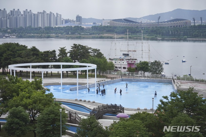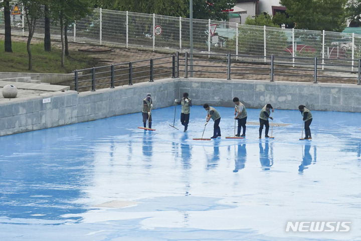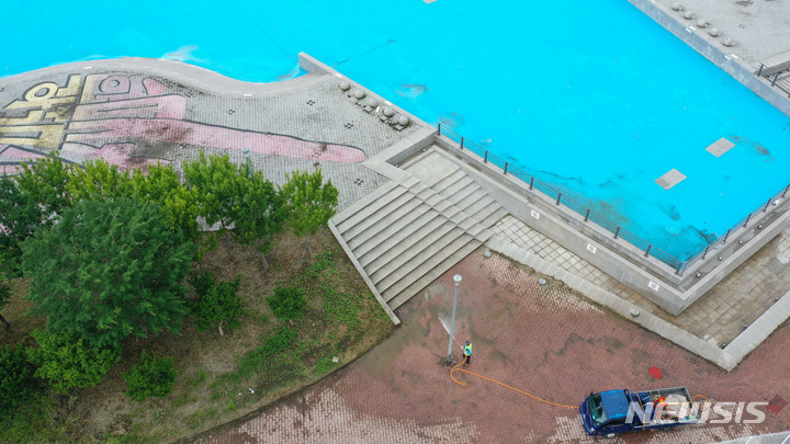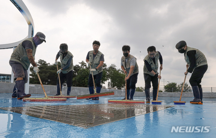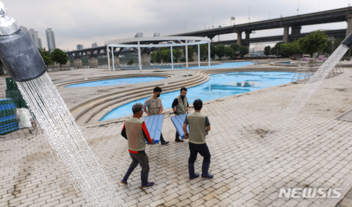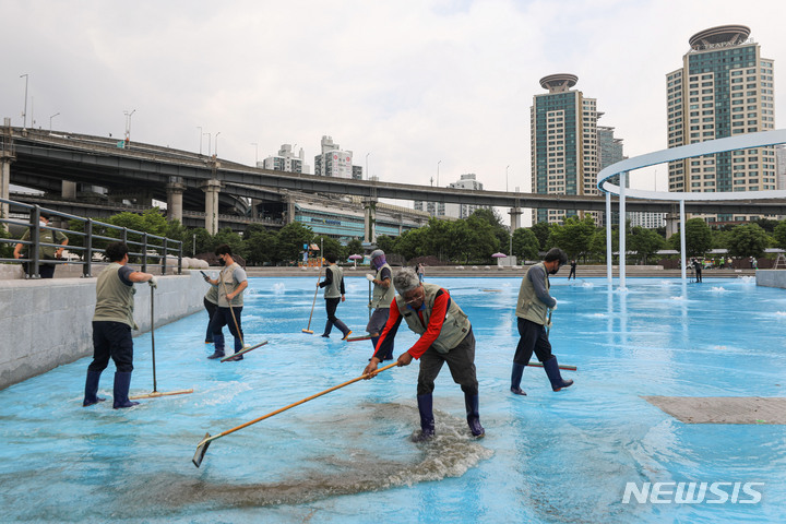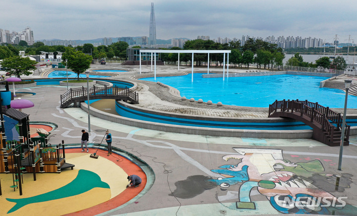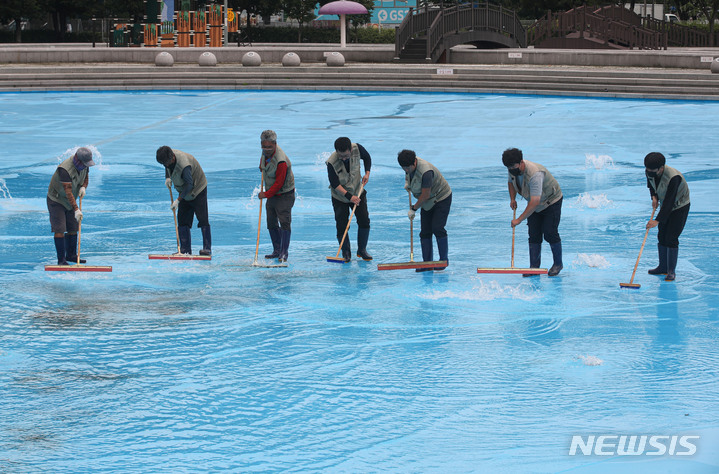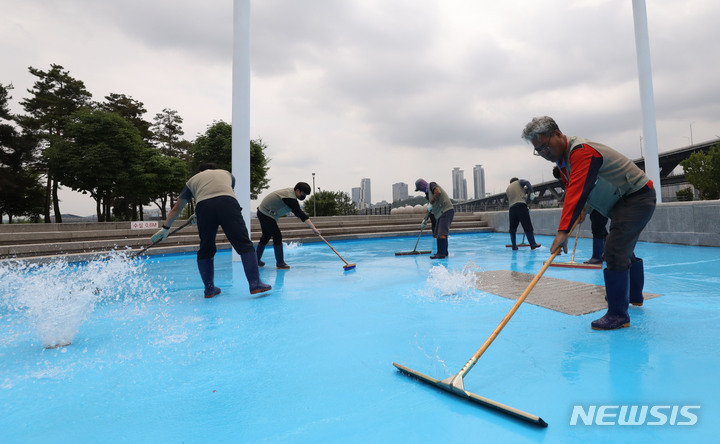 漢江事業本部の関係者が16日午後、ソウル市広津区のトゥクソム漢江公園プールのオープン準備のため清掃を行っているところ。