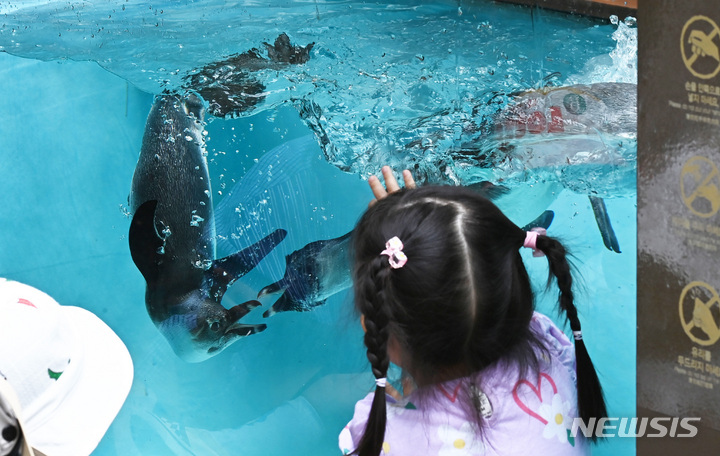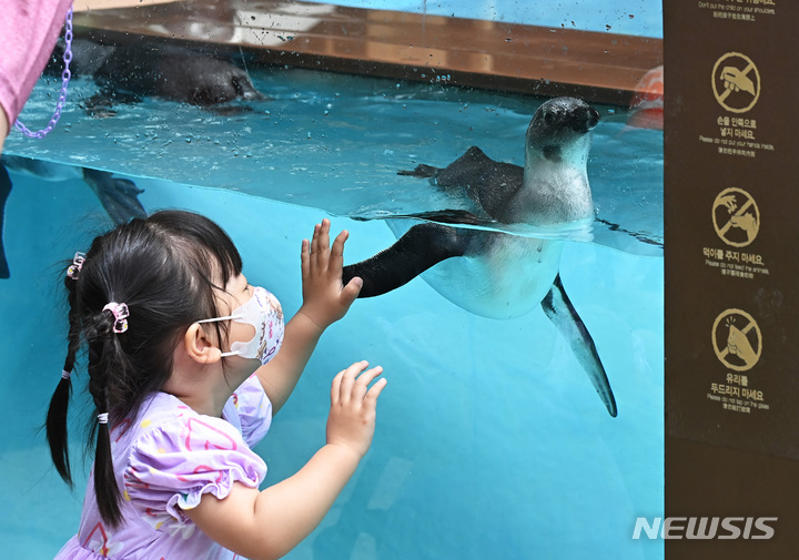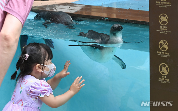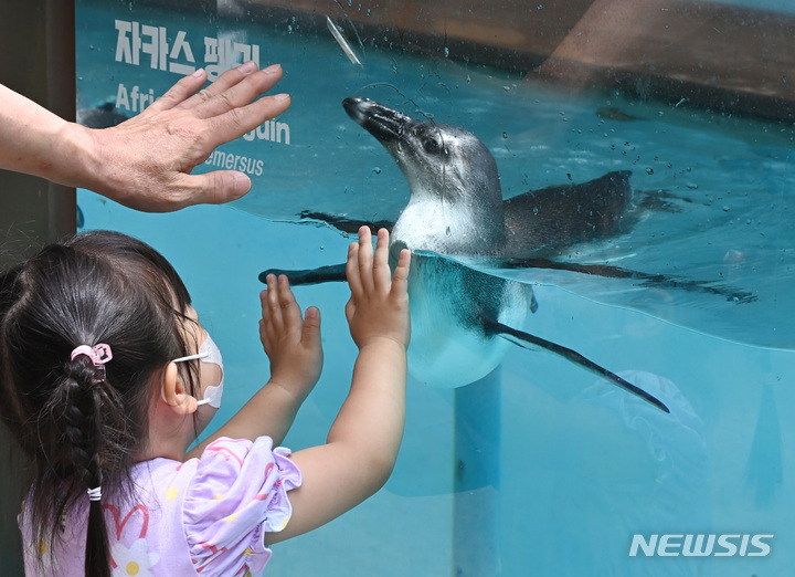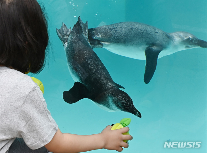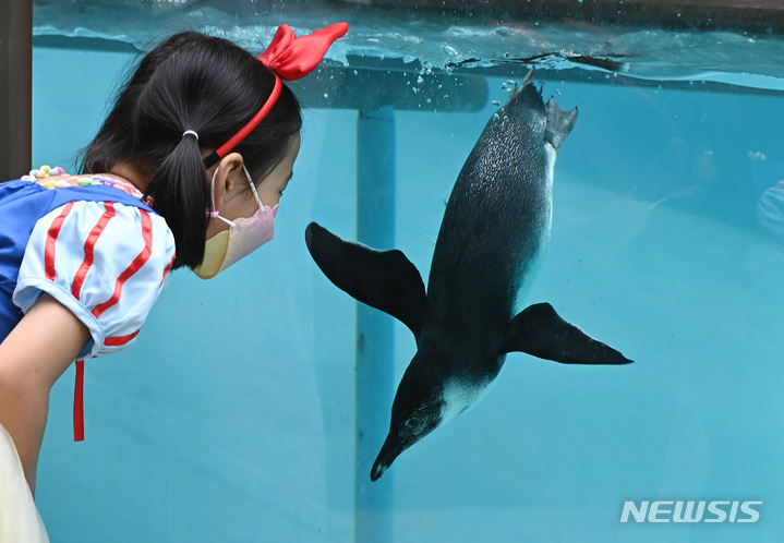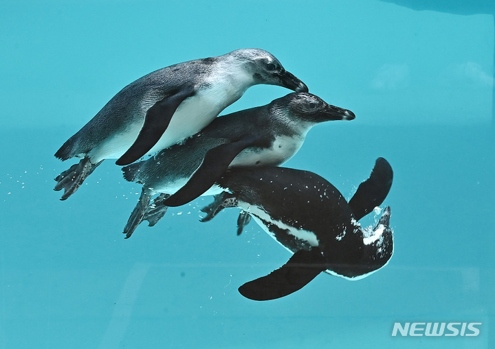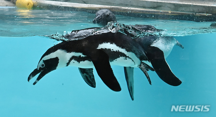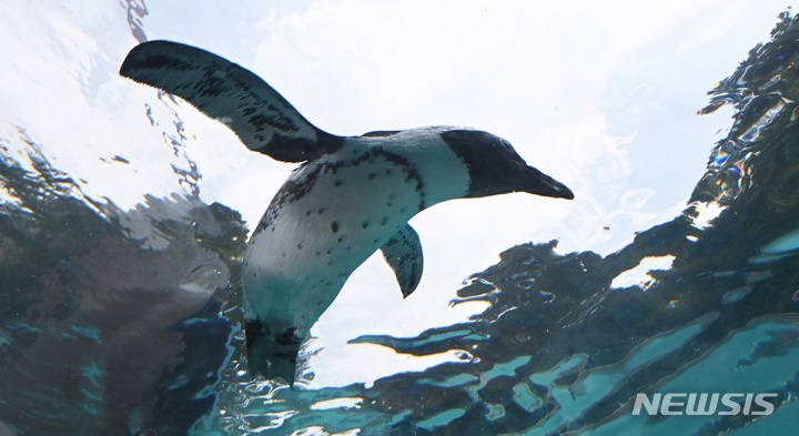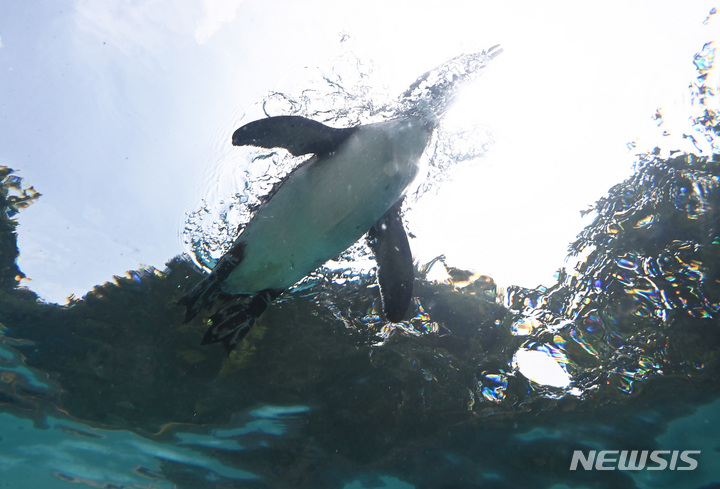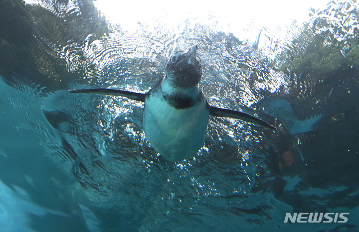 初夏の天気となった17日、京畿道竜仁のエバーランドにて、水の中を泳ぐケープペンギンの様子。