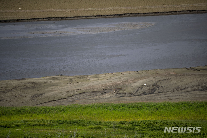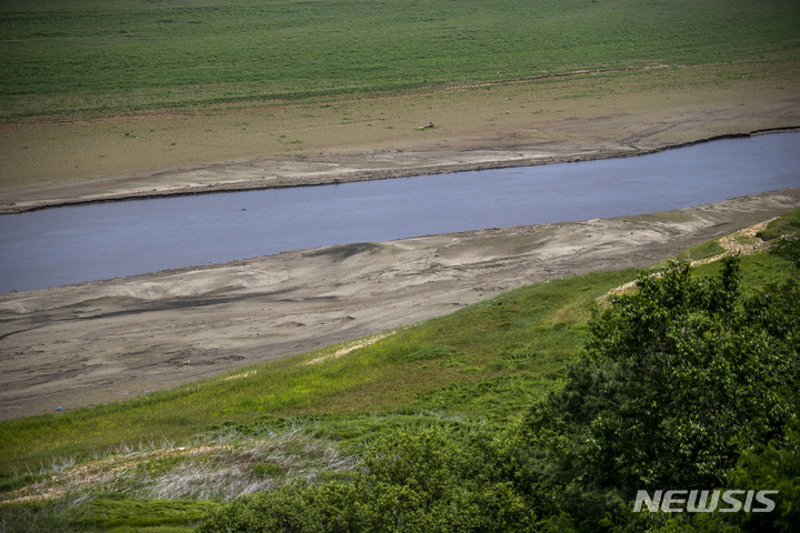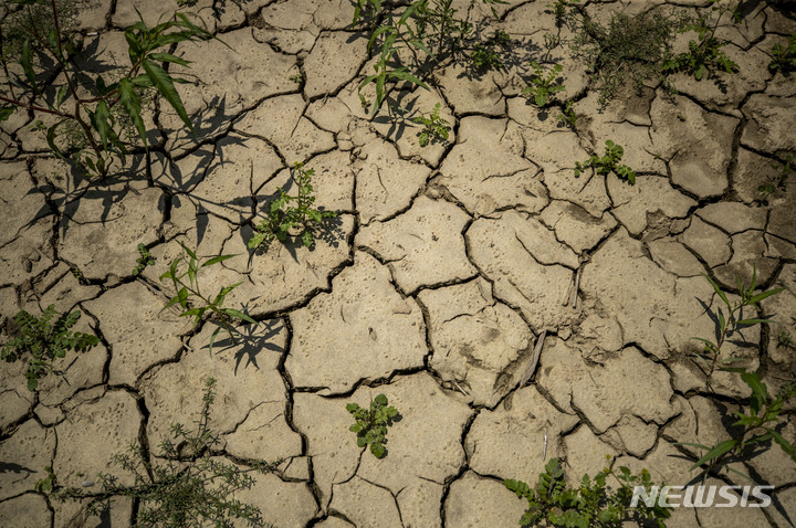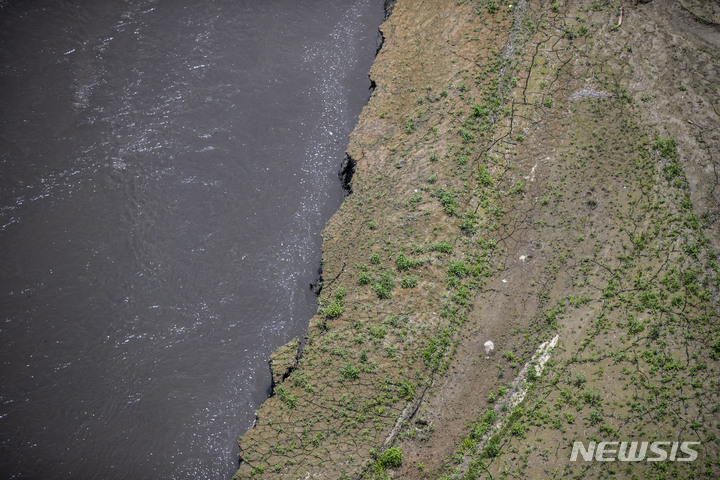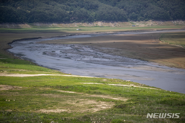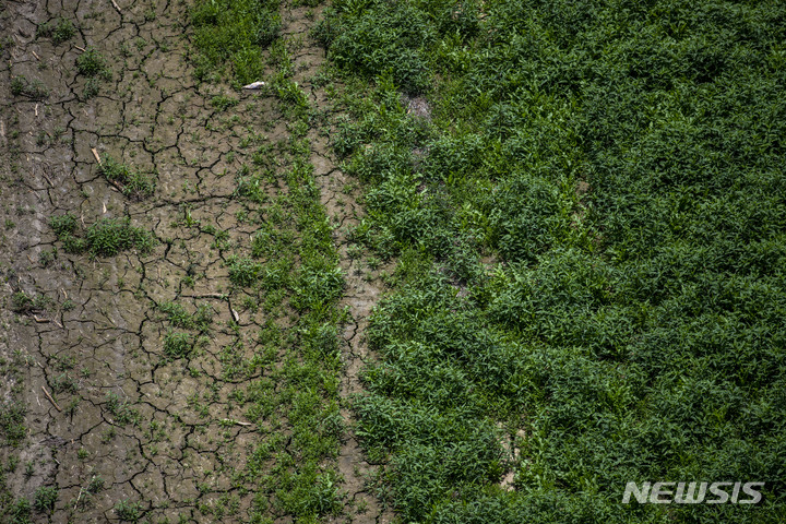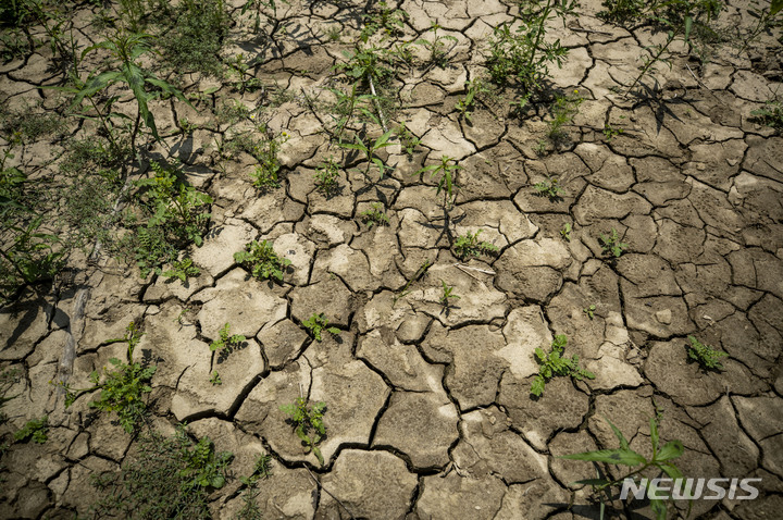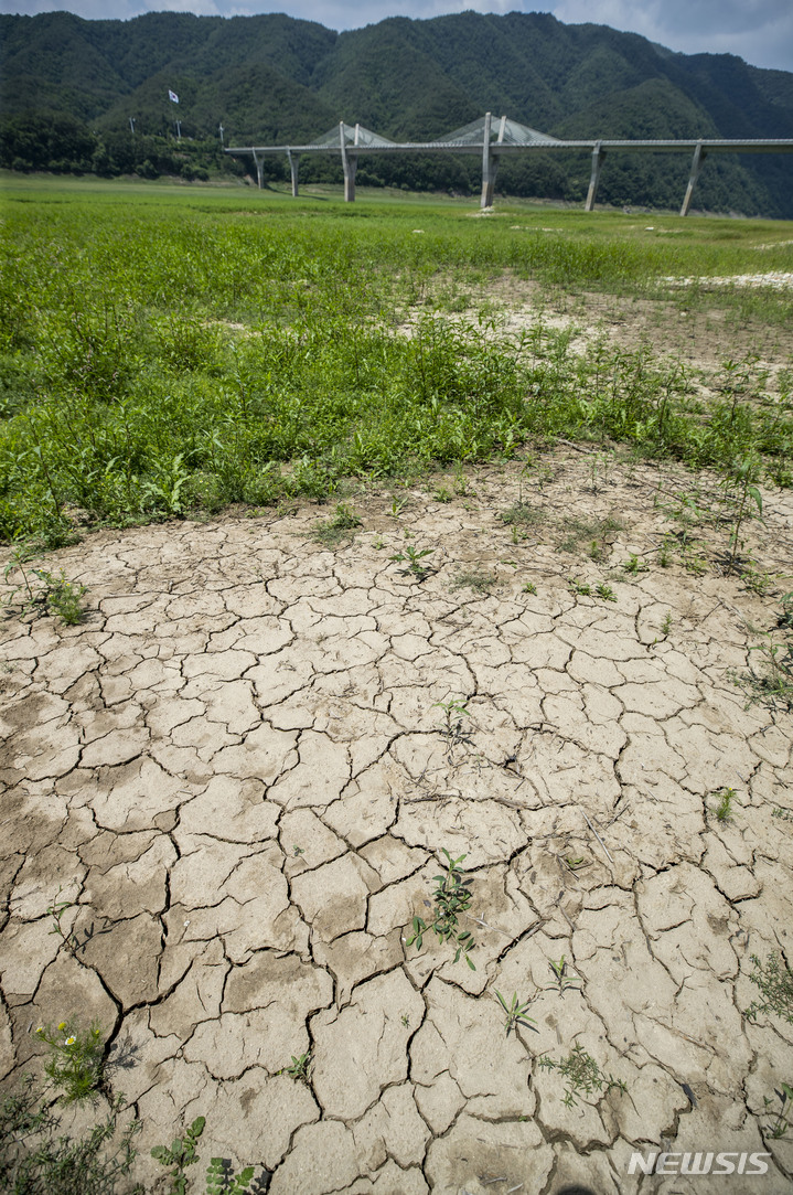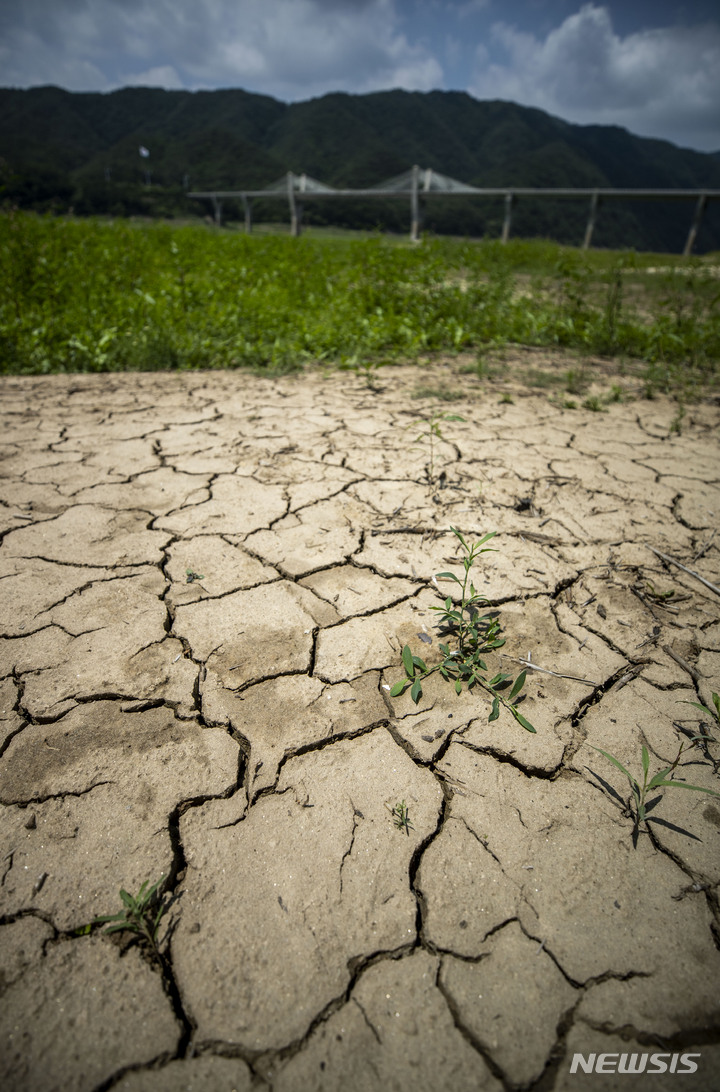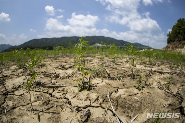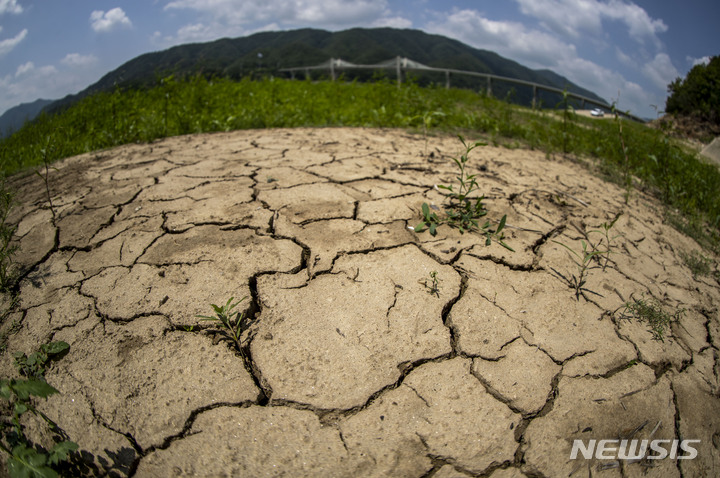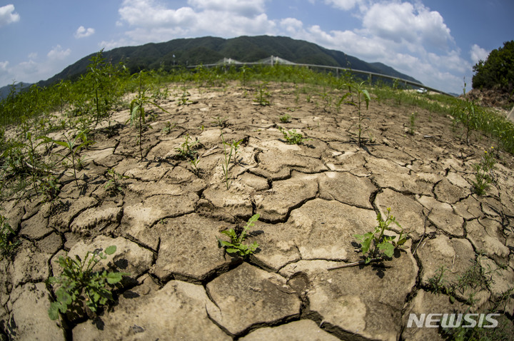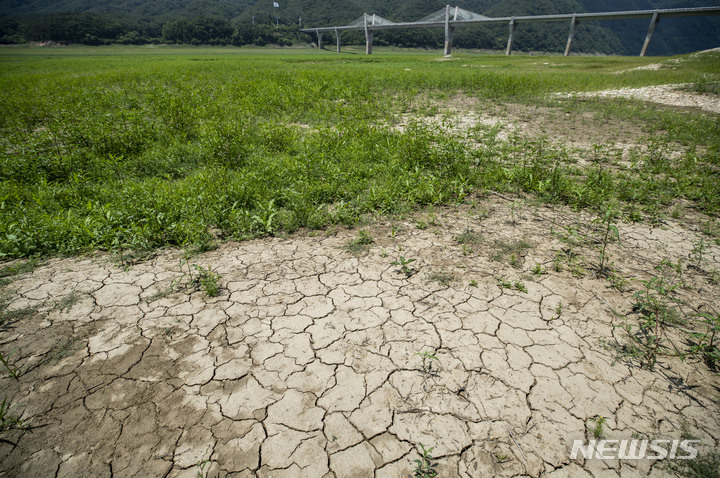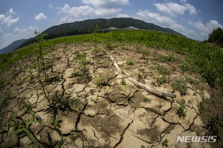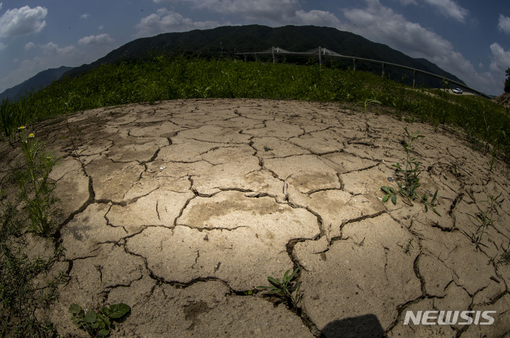 韓国各地で極度の日照りが続いている20日午後、江原道麟蹄郡の昭陽湖では、露出した湖底が干上がってひび割れていた。