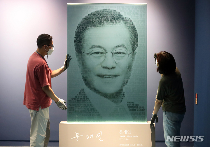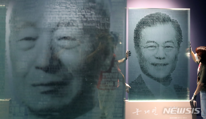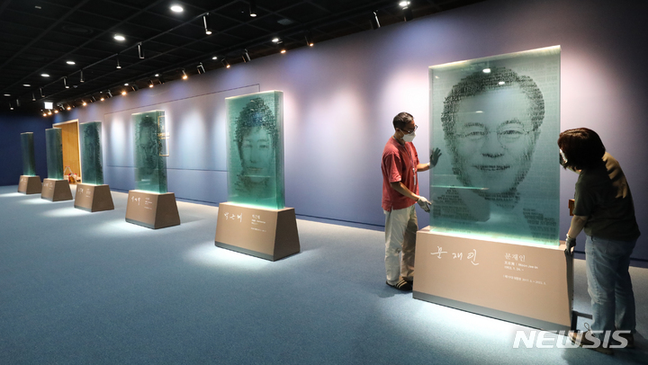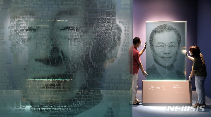 韓国の文在寅(ムン・ジェイン)前大統領の主な記録物が今月21日から一般に公開される、こうした中、世宗市オジン洞の大統領記録館にて、就任演説のキーワードを利用して大統領の顔を8枚のガラスに再現したテキストアートの造形物を調べる関係者の様子。今回展示される記録物は、今年5月に大統領記録館へ移管された記録物のうち、保護期間の指定がない公開記録物の一部だ。