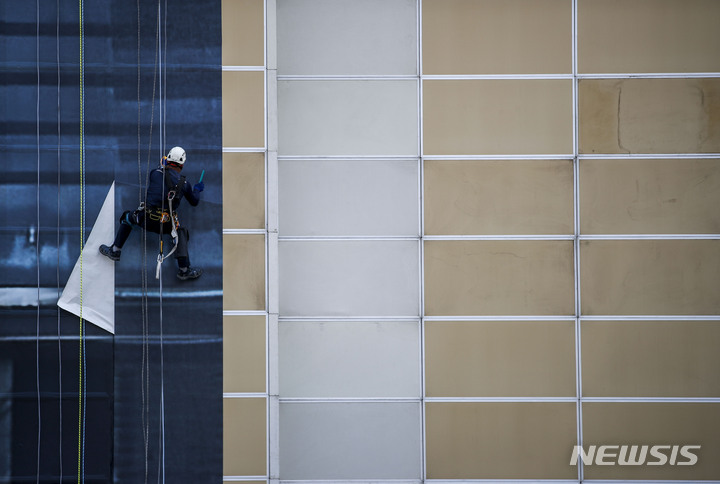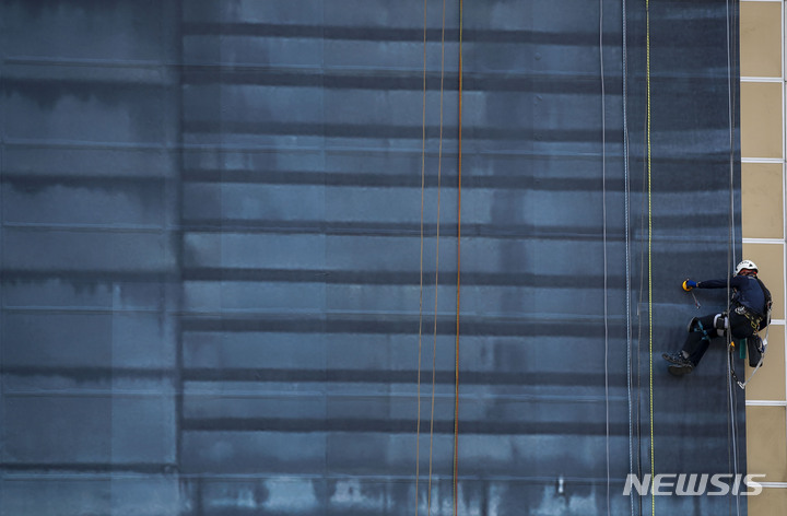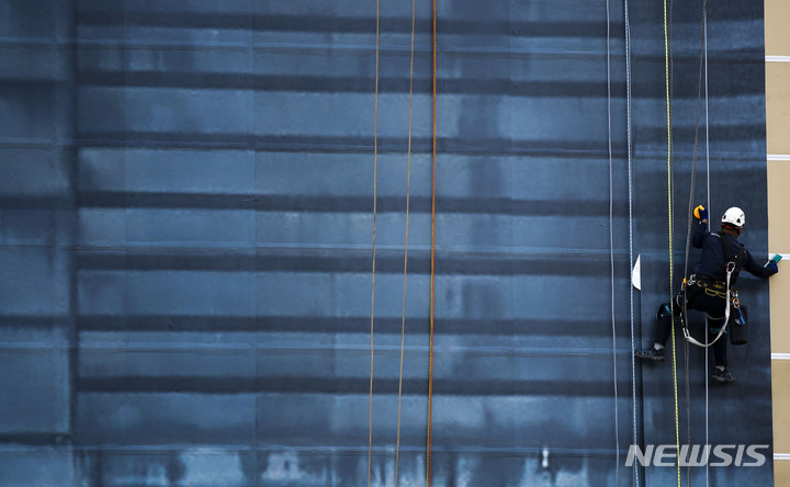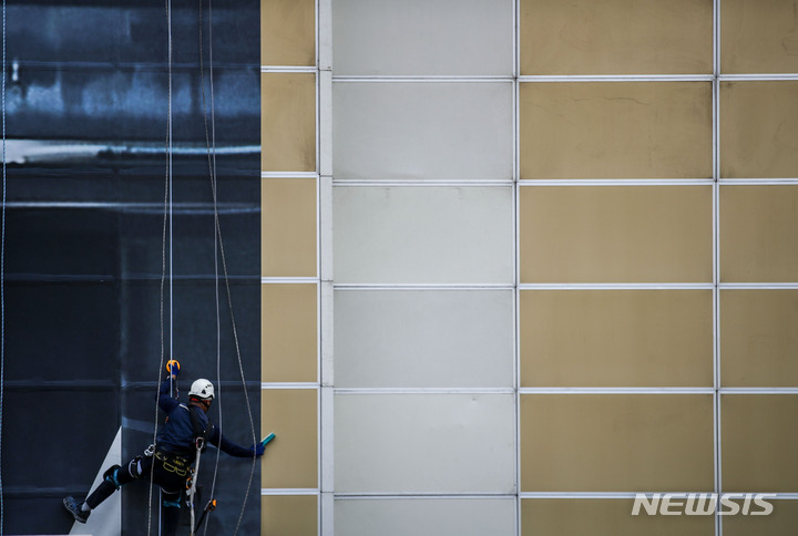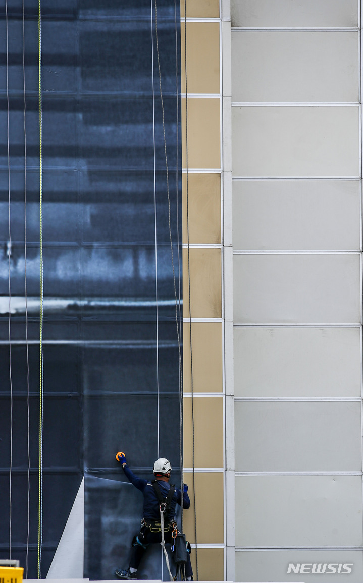 ソウル市鍾路区の光化門KT社屋工事現場で21日、関係者がビルの外壁のラッピング作業を手掛けていた。光化門KT社屋のリモデリング工事は、2023年4月の再オープンを予定している光化門広場の改善事業に合わせて2023年下半期完了の見通しだ。