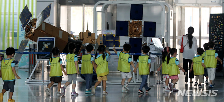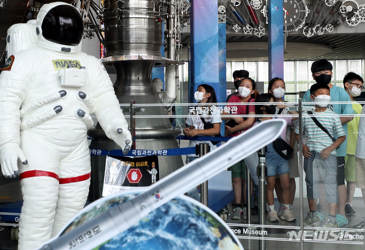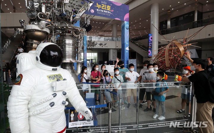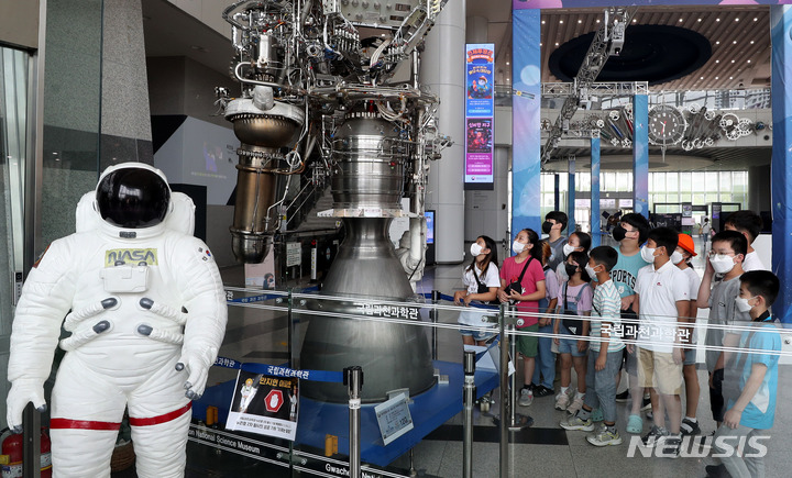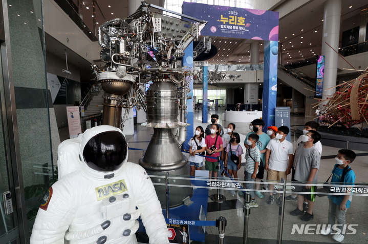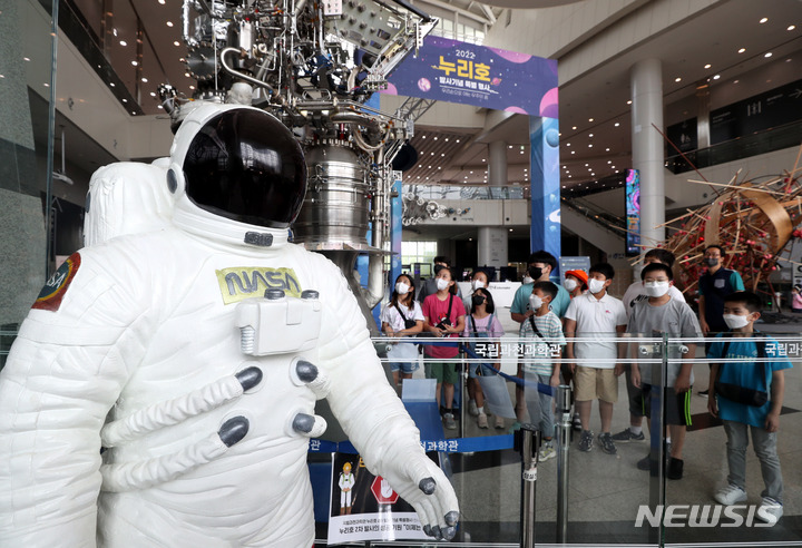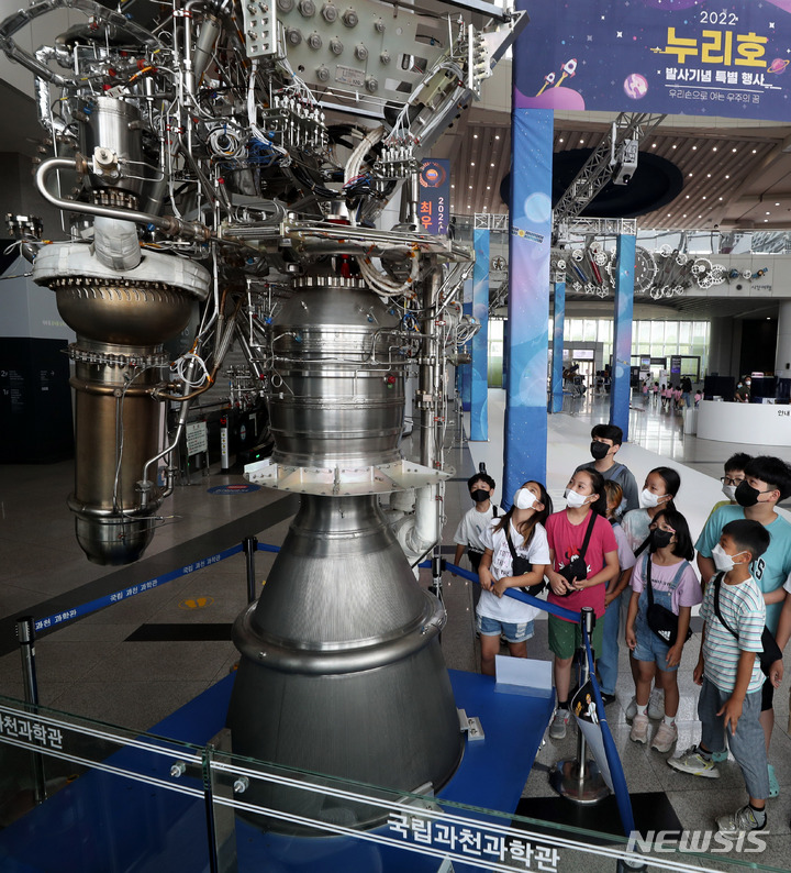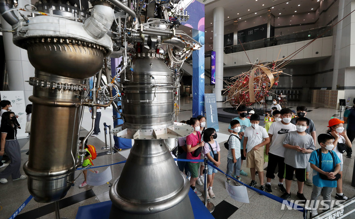 韓国型発射体ヌリ号の打ち上げ成功で宇宙科学に対する関心が高まっている。写真は22日午前、京畿道果川市の国立果川科学館に用意されたヌリ号打ち上げ記念特別イベント会場で、唐津市の新村小学校の児童が、実際に試験で使われた「ヌリ号1段目エンジン」を見学しているところ。