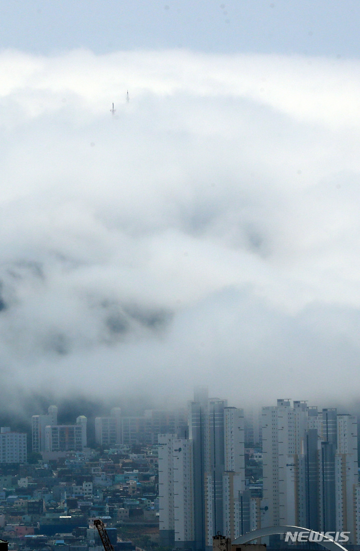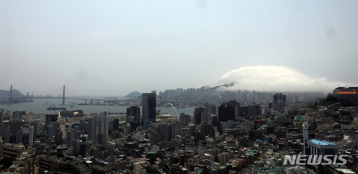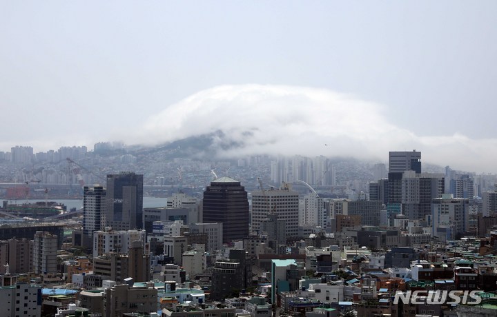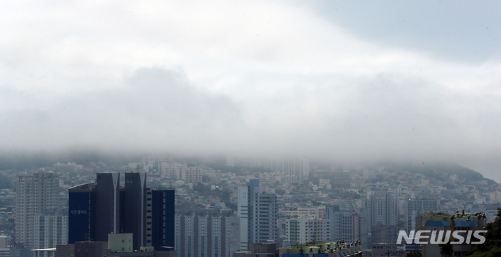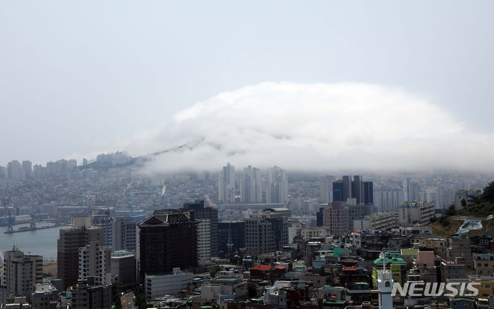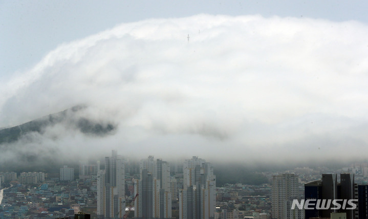 蒸し暑い天気が続く22日、釜山市影島区蓬莱山一帯は濃い海霧に覆われ、壮観を演出していた。