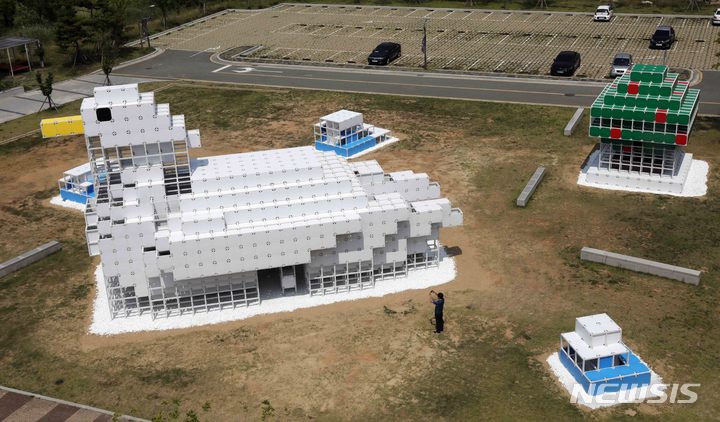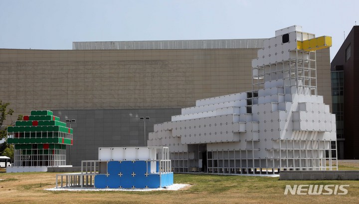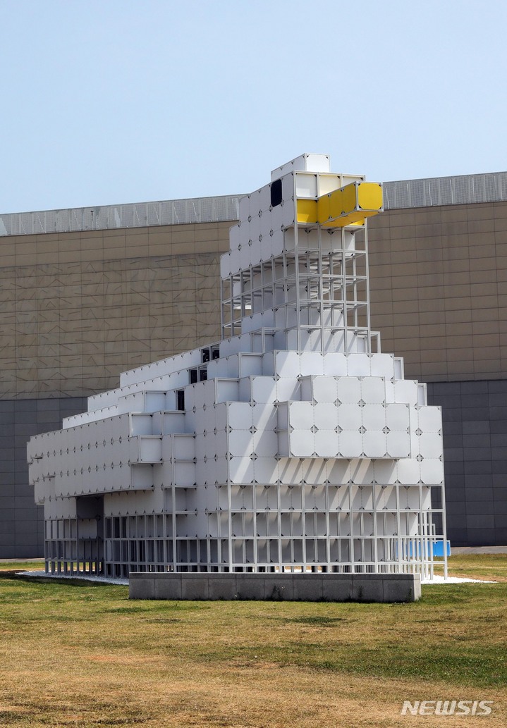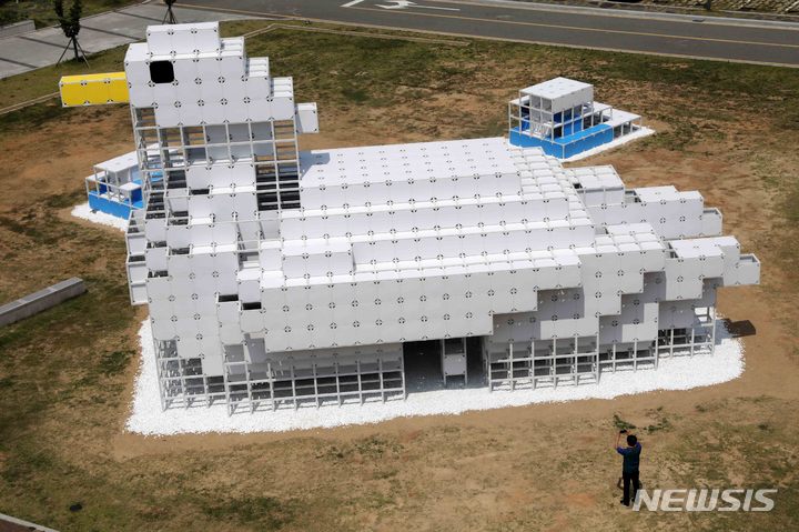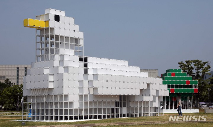 野外パビリオンプロジェクト「Re:新-鳥-ジャングル」が開かれた22日、釜山市沙下区の釜山現代美術館野外公園に、乙淑島の渡り鳥「コサギ」のパビリオンが展示されている様子。このパビリオンは、韓国各地に捨てられた廃プラスチック27トンを集め、高機能性プラスチック(ABS樹脂)とポリ塩化ビニル(PVC)に分離成形した計1万5000個のモジュラーで作ったもの。今回の展示は10月23日まで行われている。