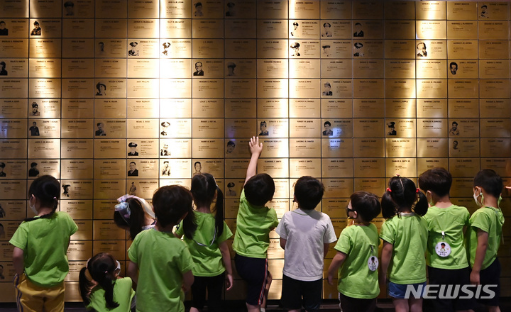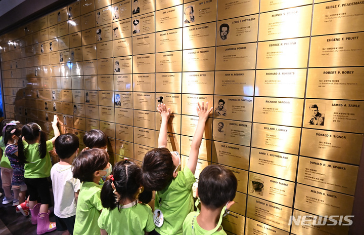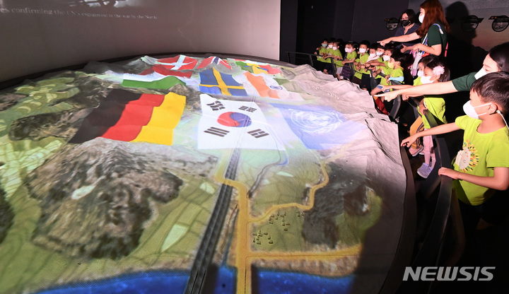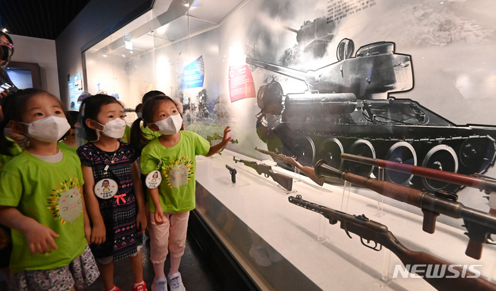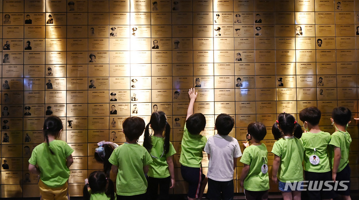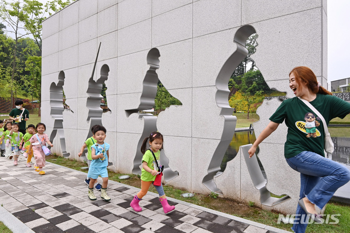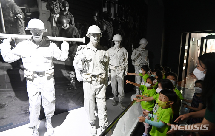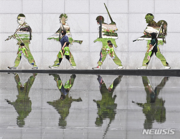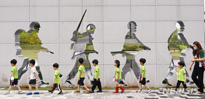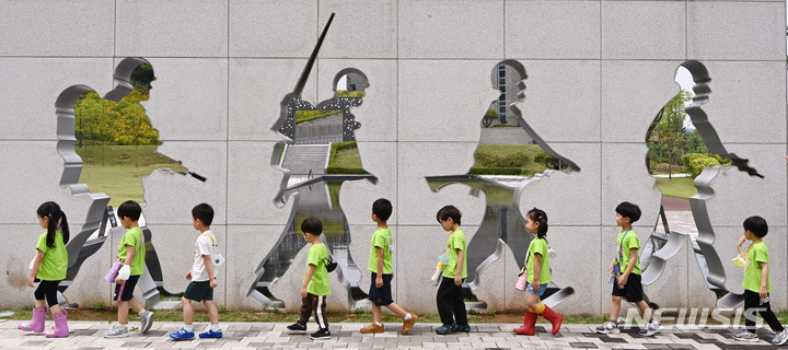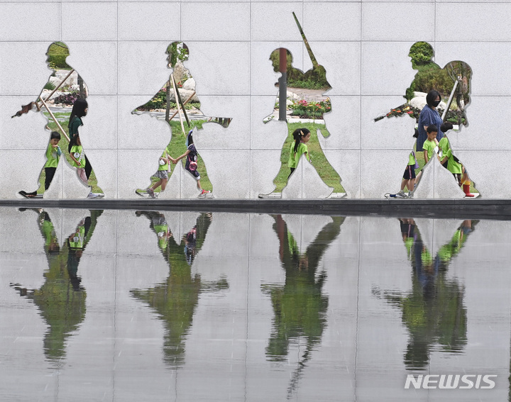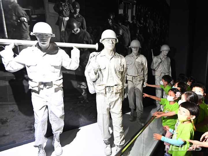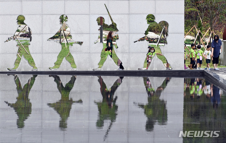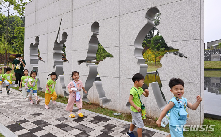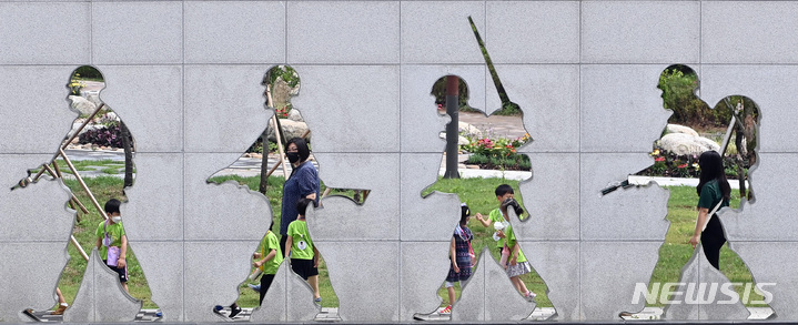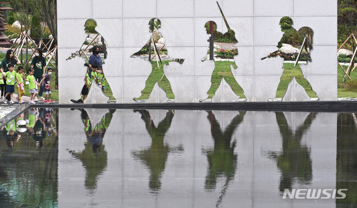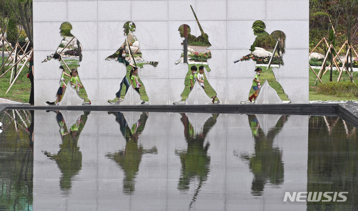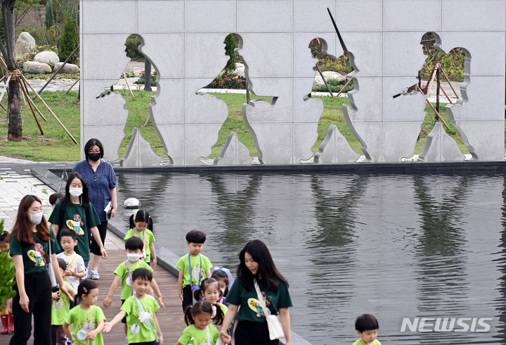 6.25戦争72周年をあすに控えた24日午前、京畿道烏山市の竹美嶺平和公園では、現場学習にやって来た子どもたちが国連軍の「スミス支隊の行軍の様子を表現した造形物の前を歩いている様子。