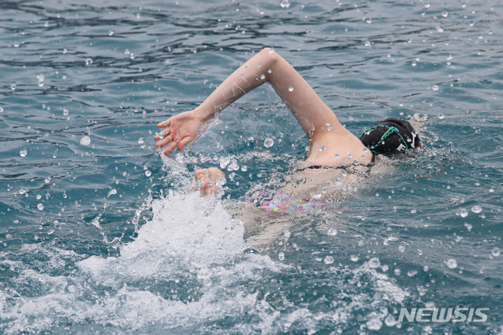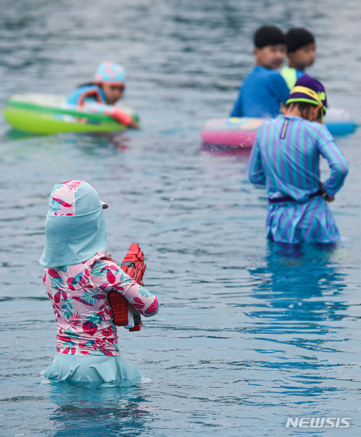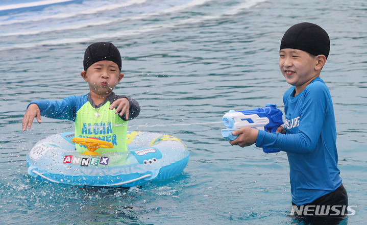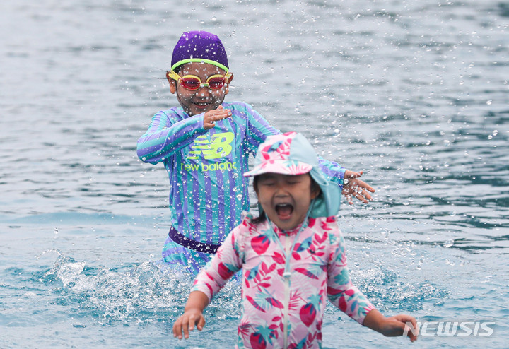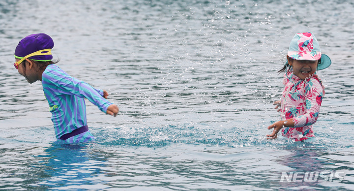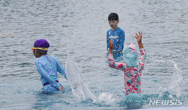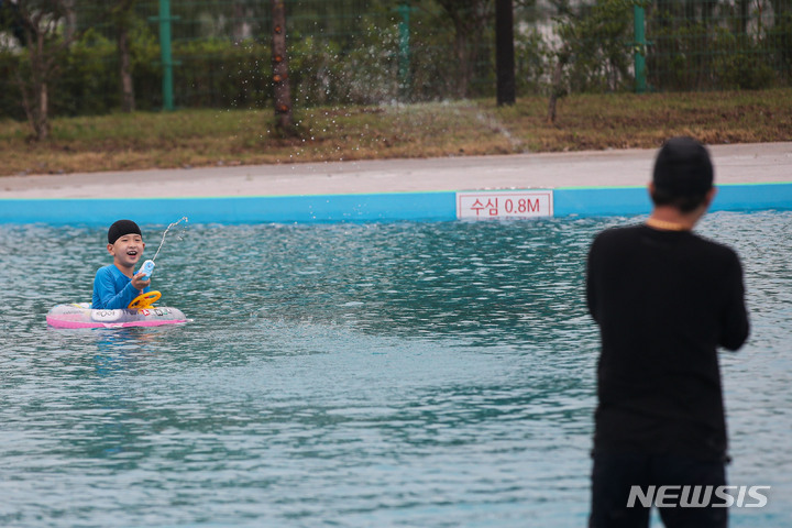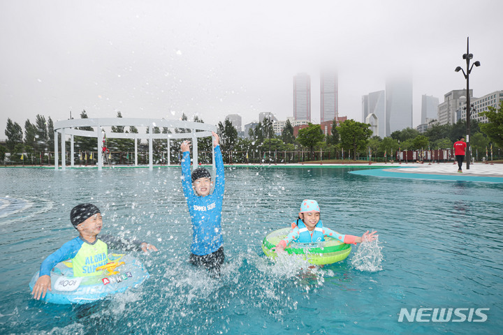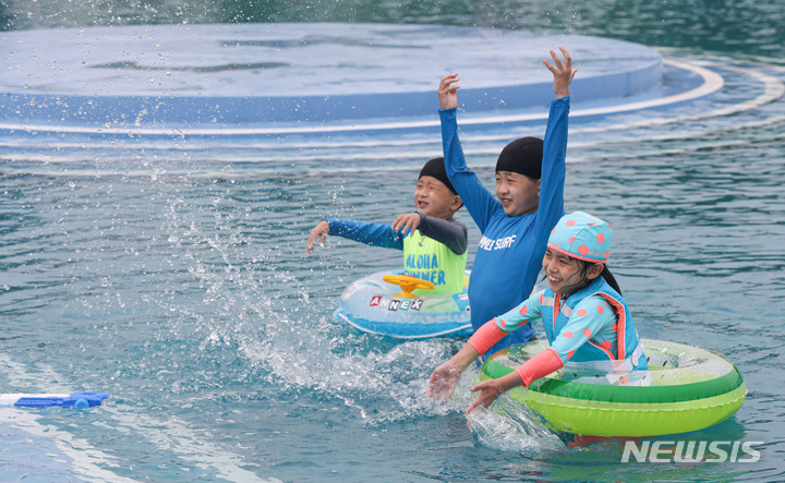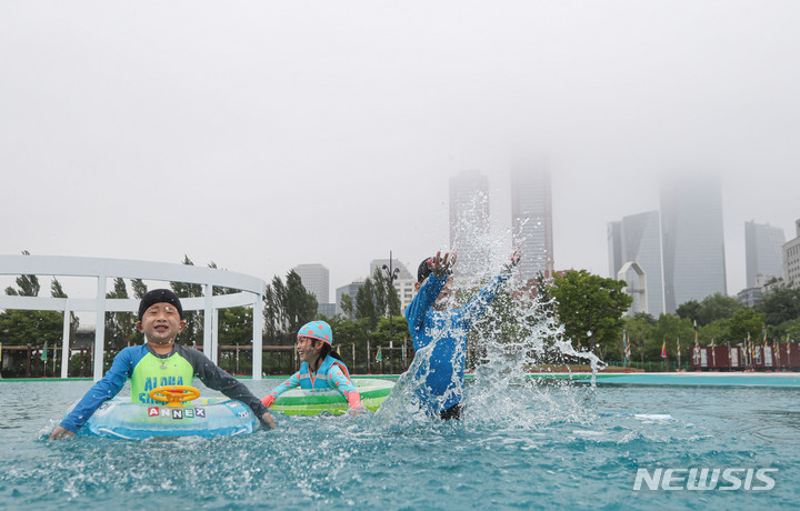 24日午後、ソウルの汝矣島漢江公園野外プールで水遊びに興じる子どもたちの様子。ソウル市漢江事業本部はこの日から8月21日まで、4カ所の漢江公園プール(トゥクソム・クァンナル・汝矣島・蚕院)と2カ所の水遊び場(楊花・蘭芝)を運営する。