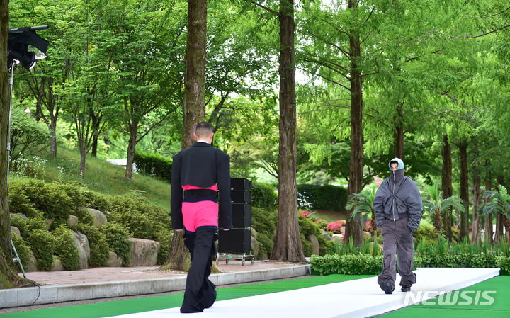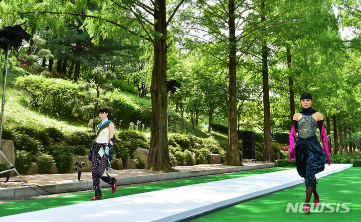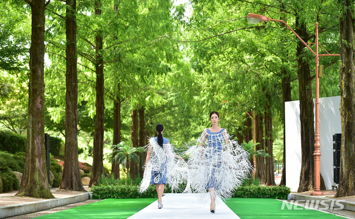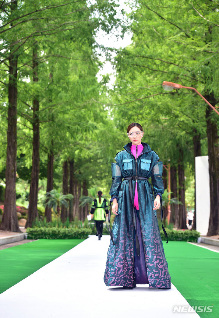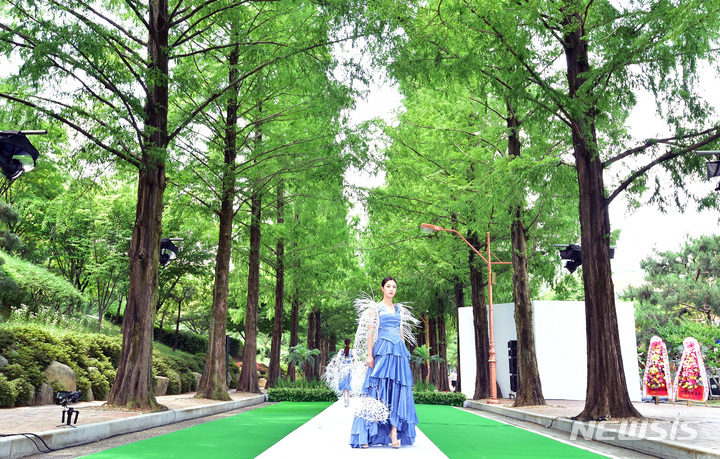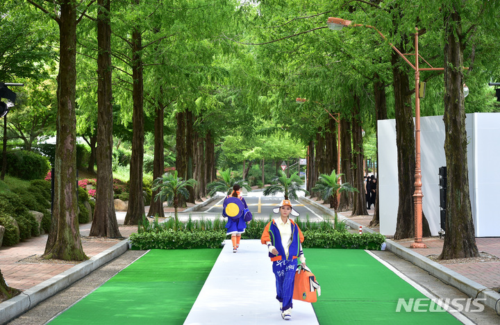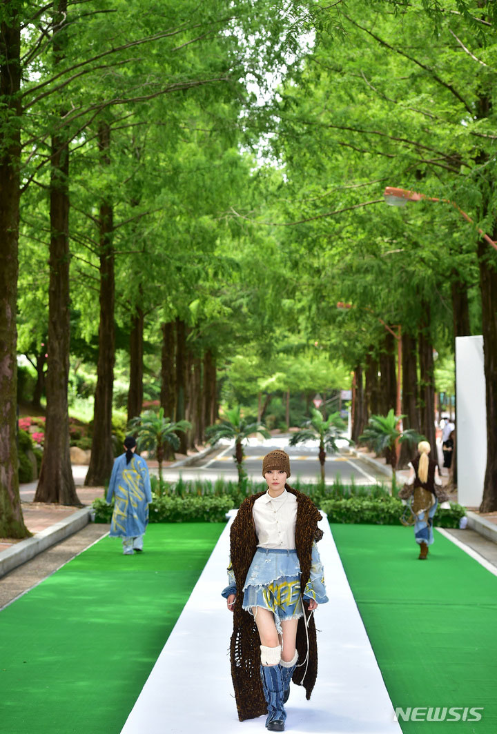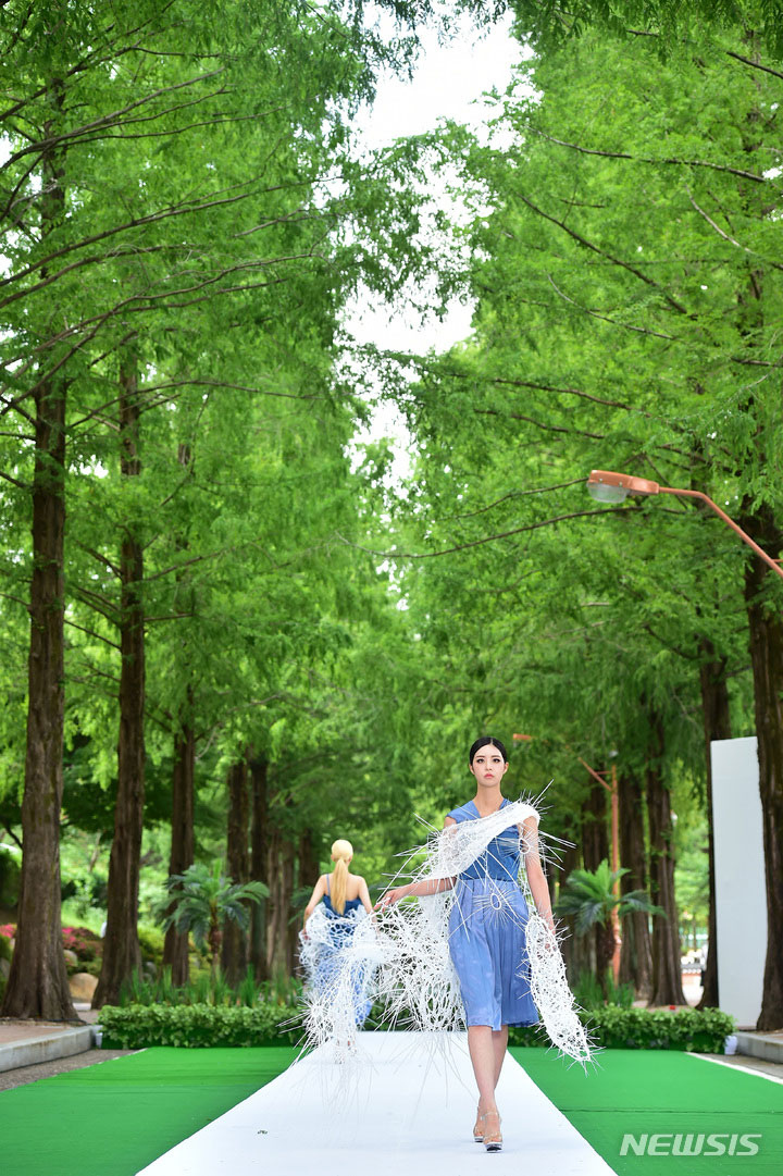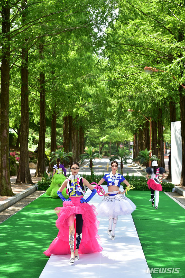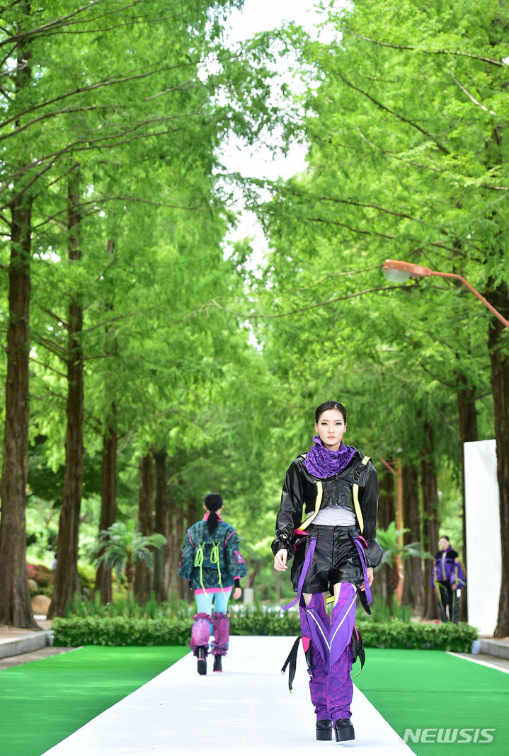 <p> 【NEWSIS】26日午後、大邱市達西区の啓明大学城西キャンパスにあるメタセコイアの道で、「再生(play back)」をテーマにした美術学部ファッションデザイン学科第24回卒業作品ファッションショーのリハーサルが行われた。