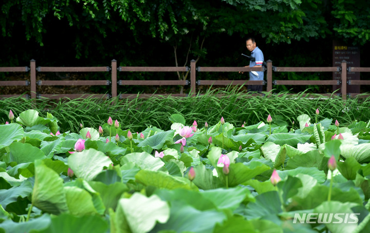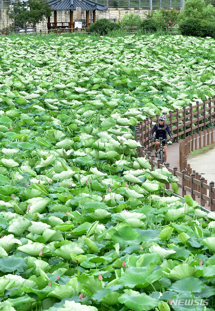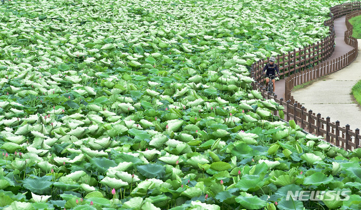 梅雨前線の影響で曇天となった28日午後、大邱市東区栗下洞に位置する安心湿地のハスの花団地で、訪れた市民が散策路で自転車に乗っていた。