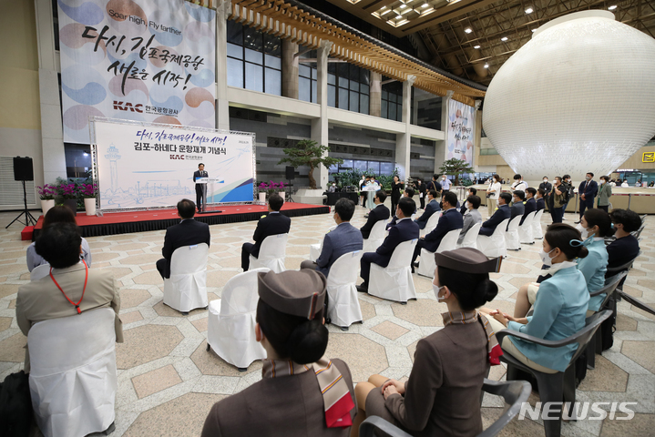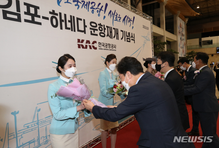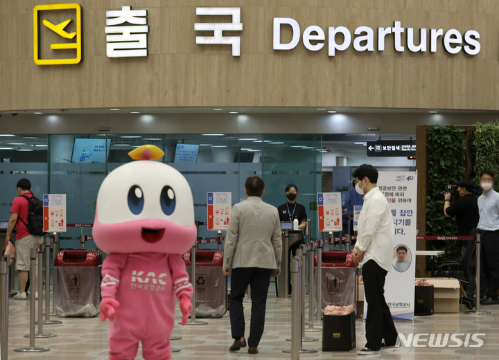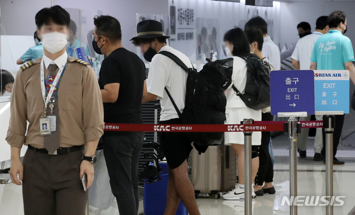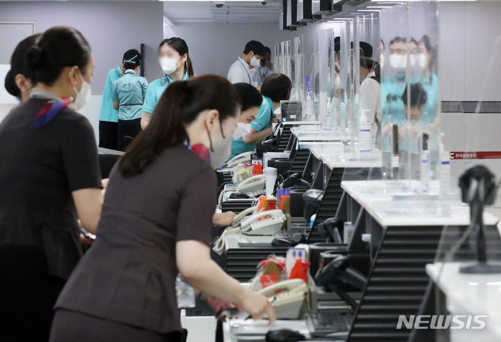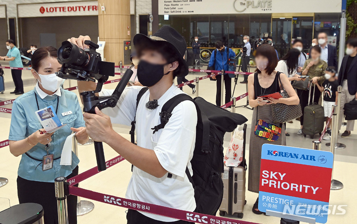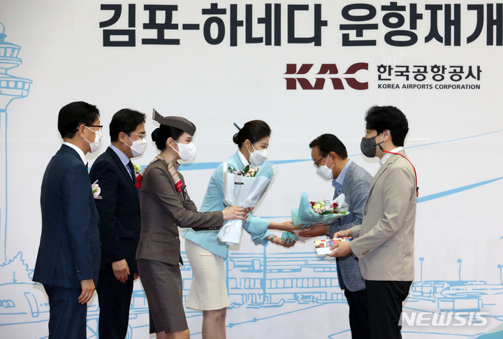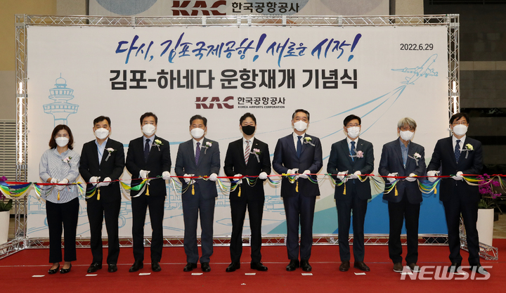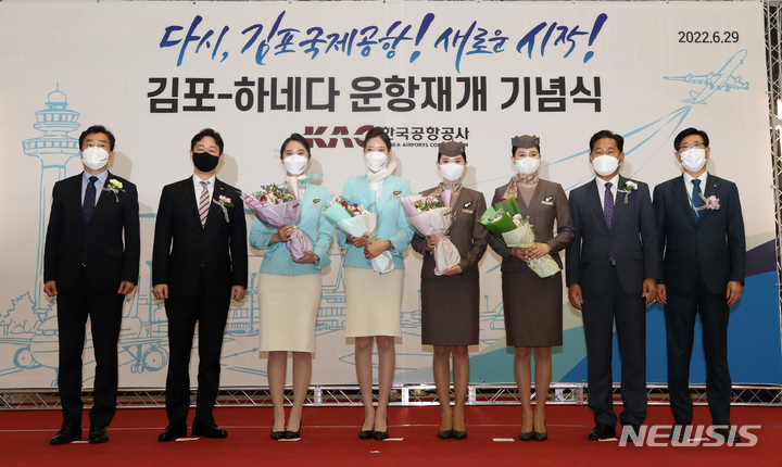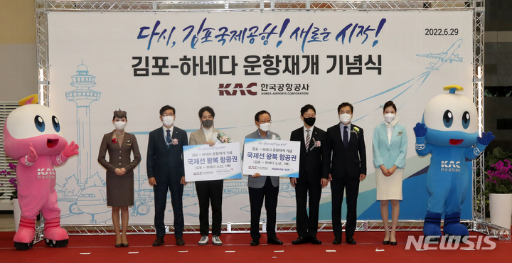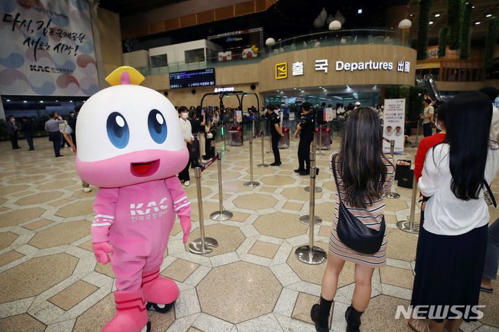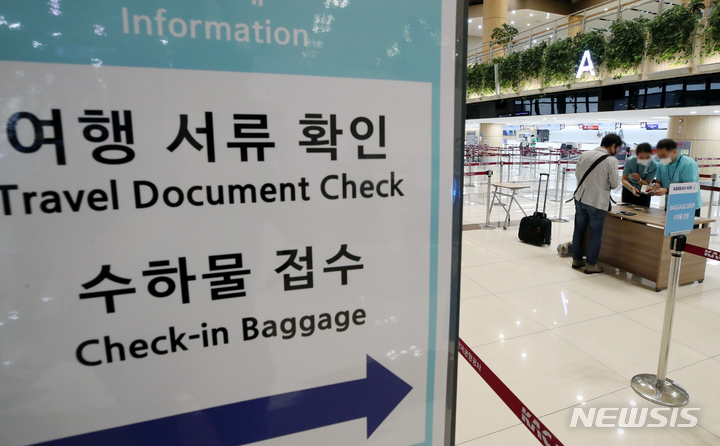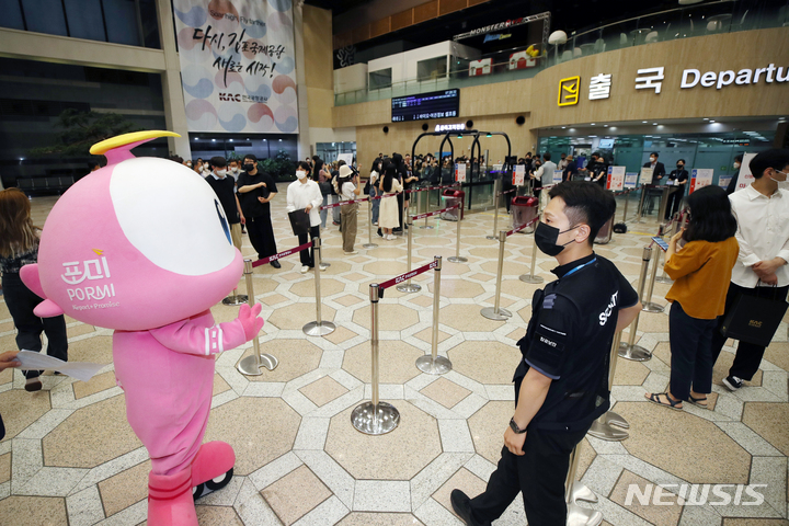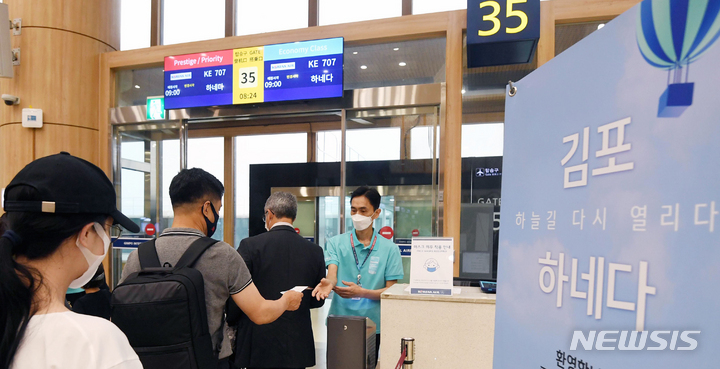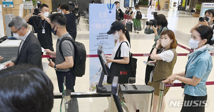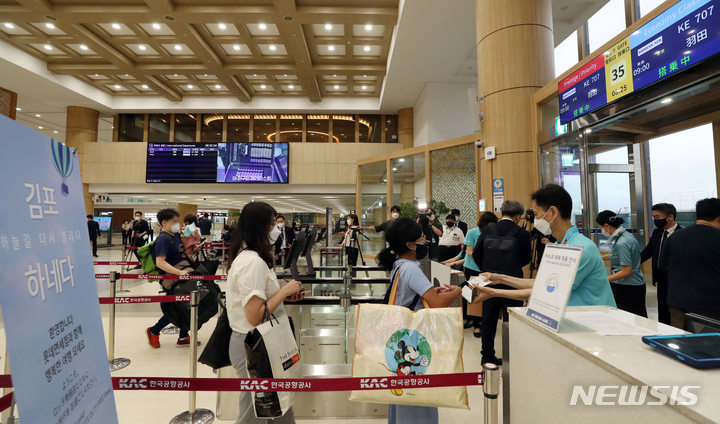 【NEWSIS】金浦-羽田間の航空路線の運航が再開された29日午前、ソウル市江西区にある金浦国際空港国際線搭乗ゲートで、搭乗手続きをする乗客たち。
