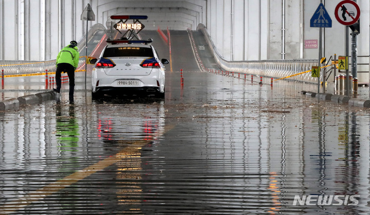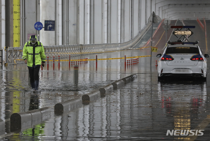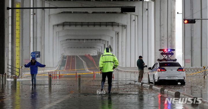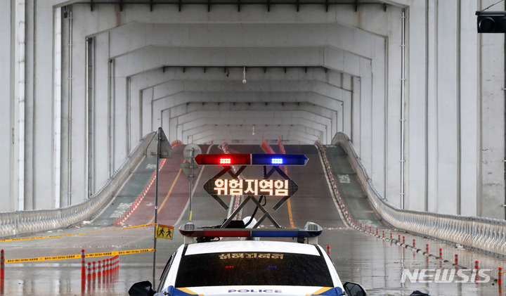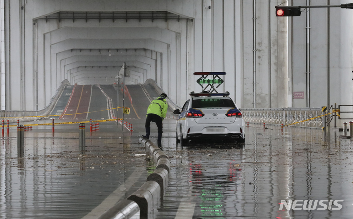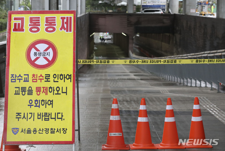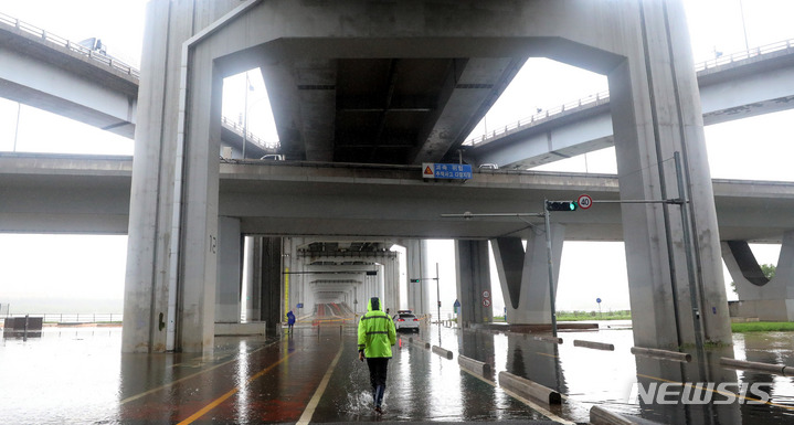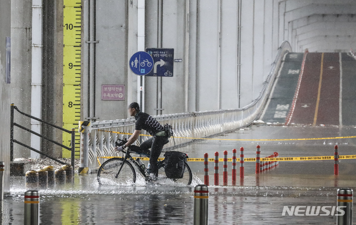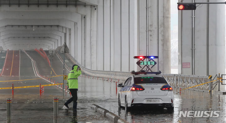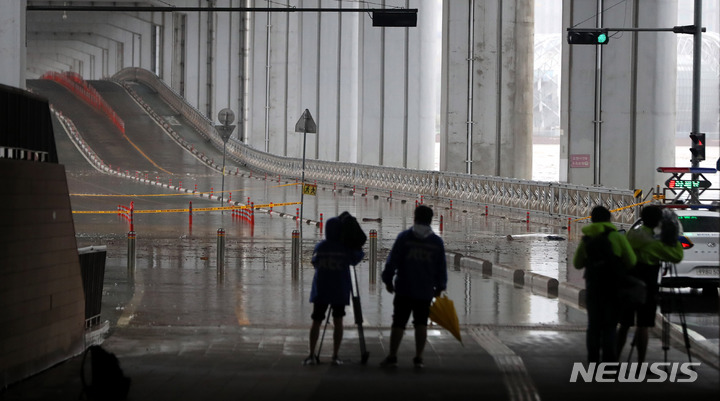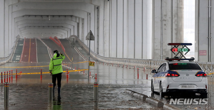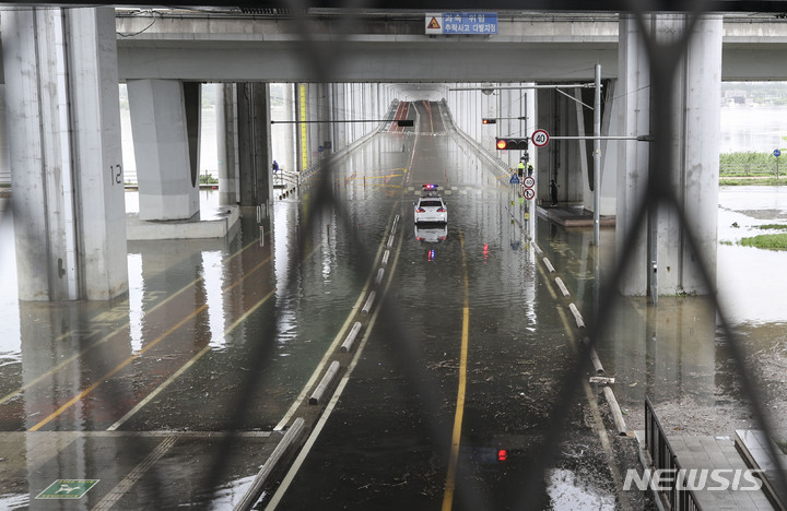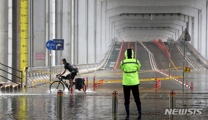 30日午前、ソウル市内を流れる漢江にかかる潜水橋は集中豪雨により通行が規制された。